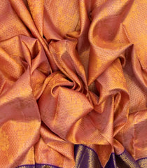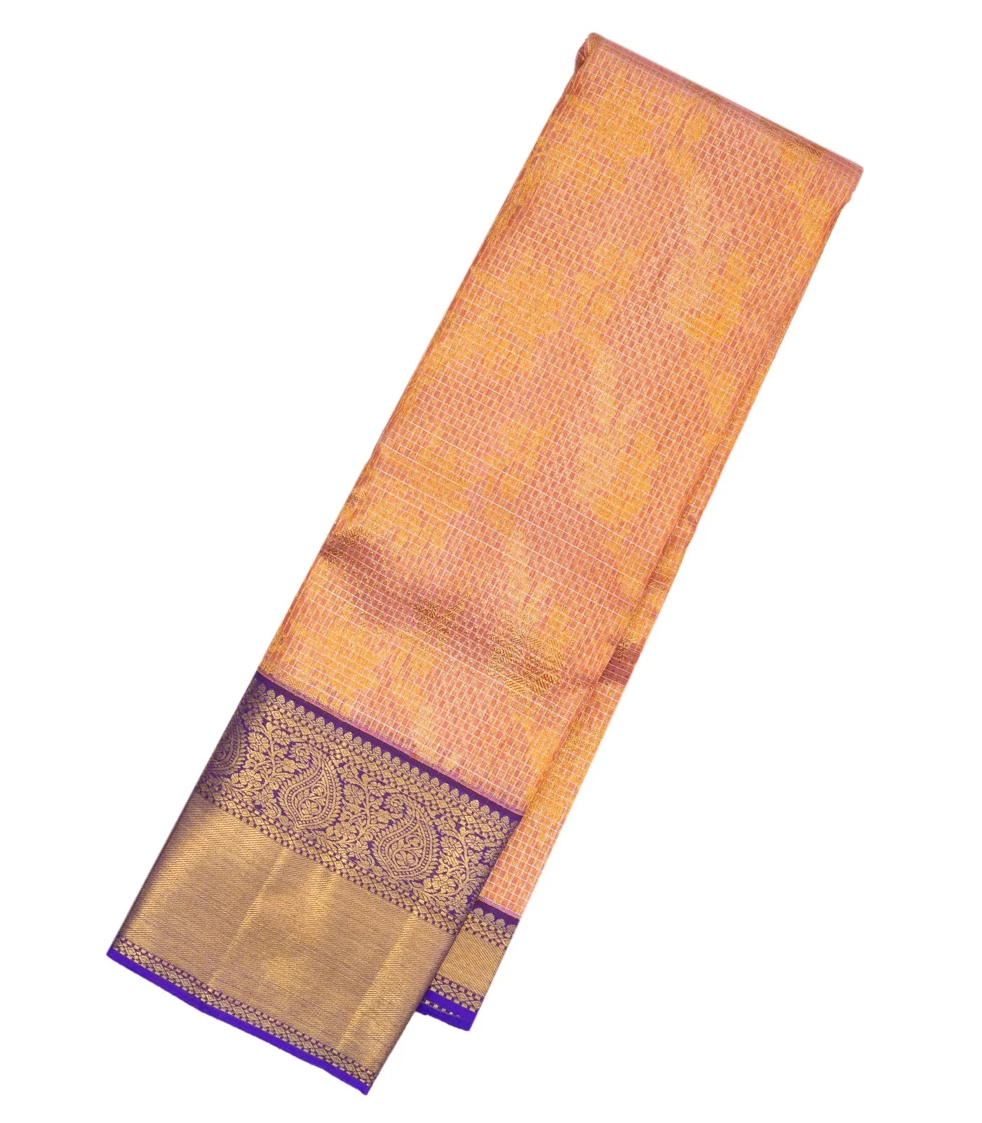 This handwoven korvai kanchipuram silk saree is filled with checks & floral motifs in peach body along with contrast border and pallu