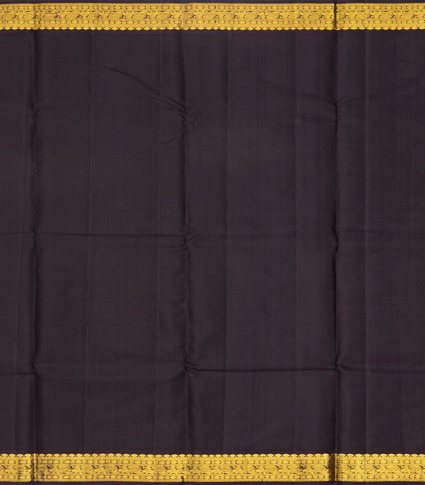 This handwoven korvai kanchipuram silk saree is filled with mango buttas in peach body along with annam motifs in contrast black zari border and pallu