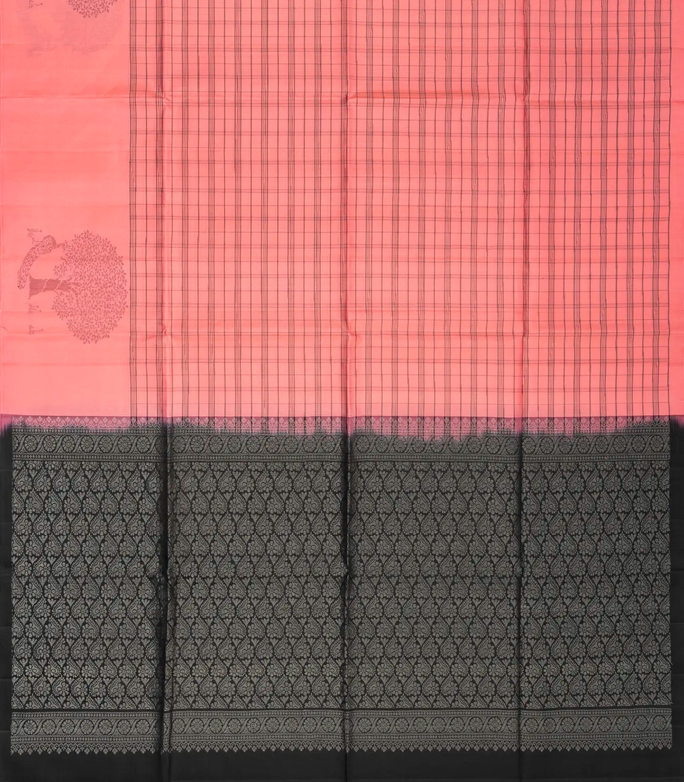 This handwoven soft silk saree is filled with checks in peach body along with border and contrast pallu