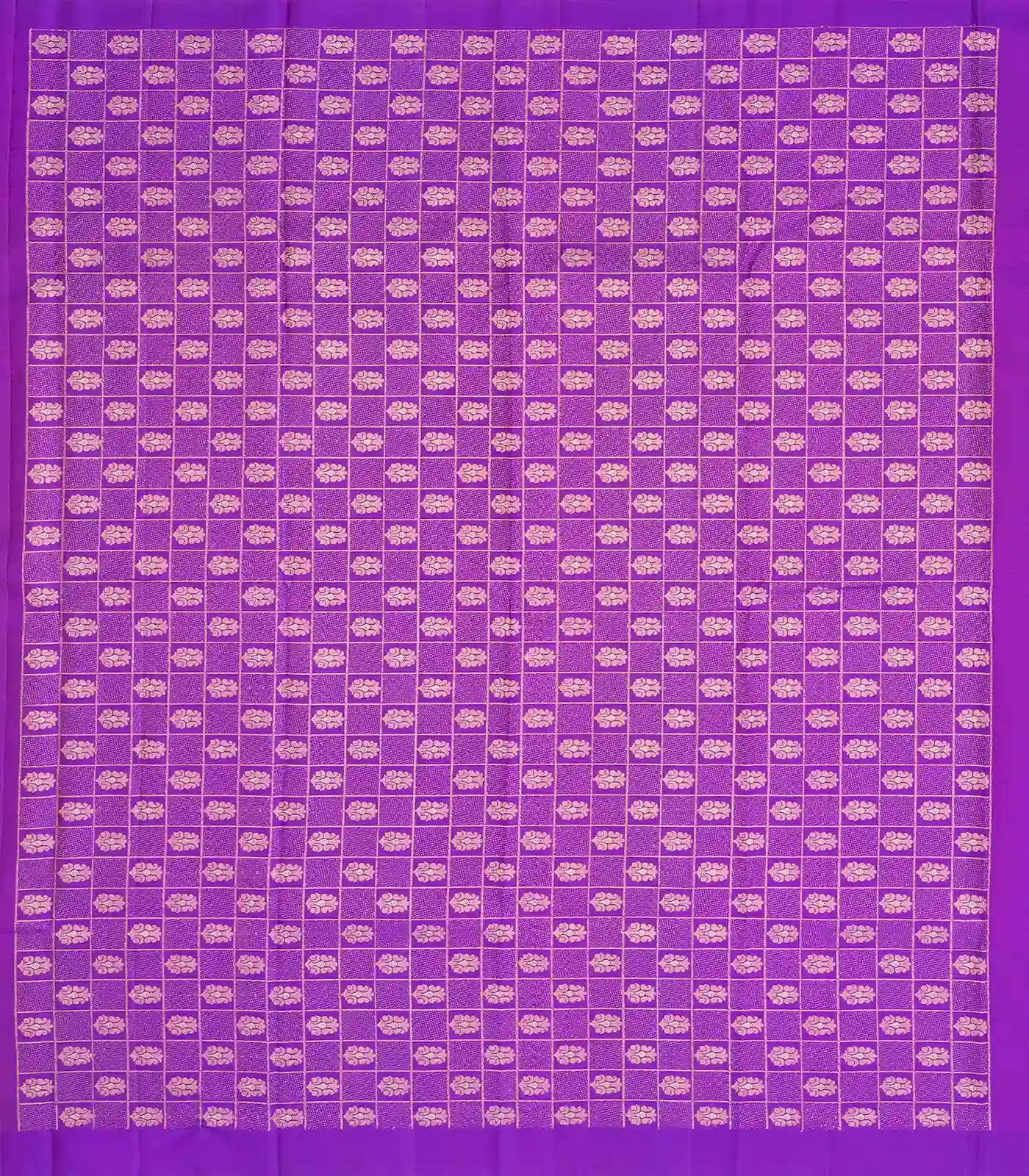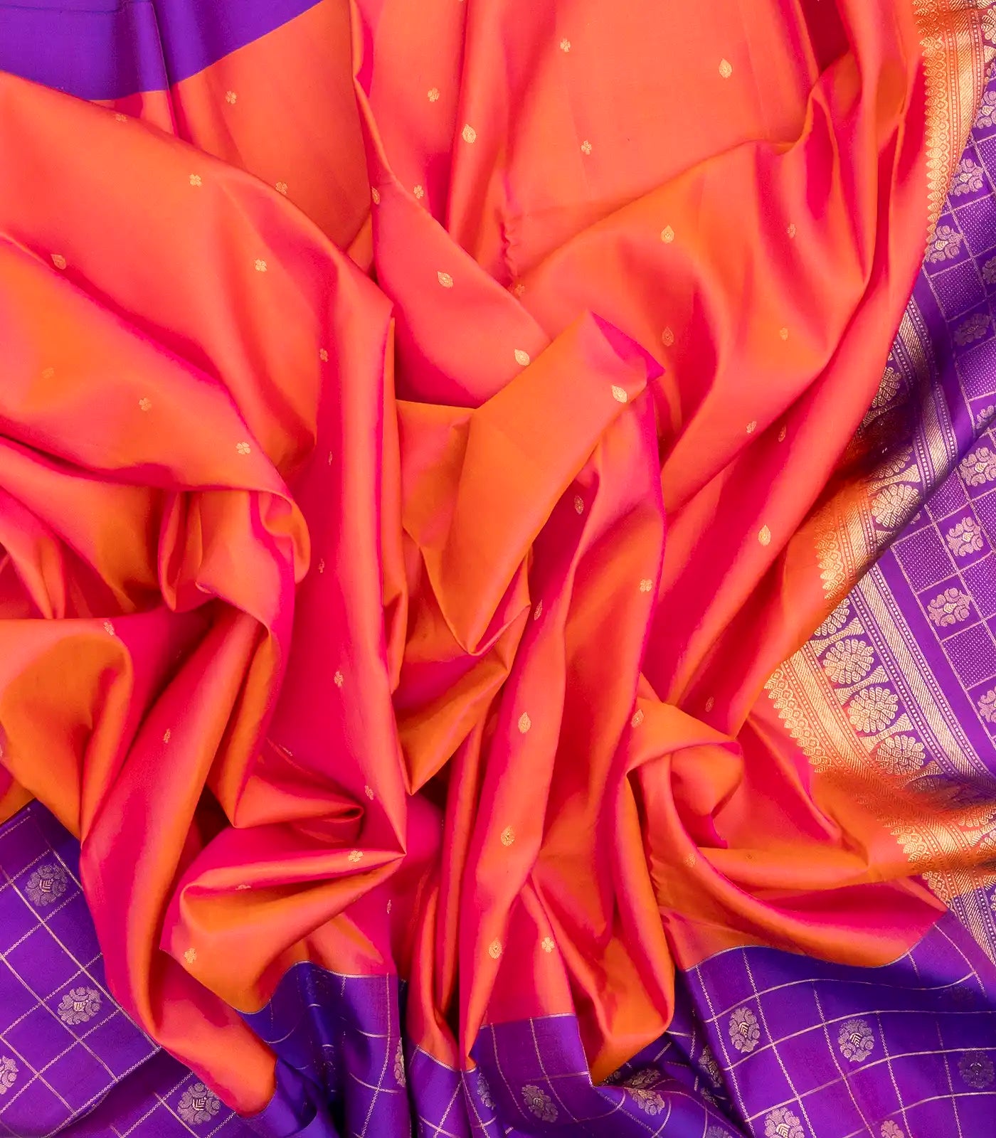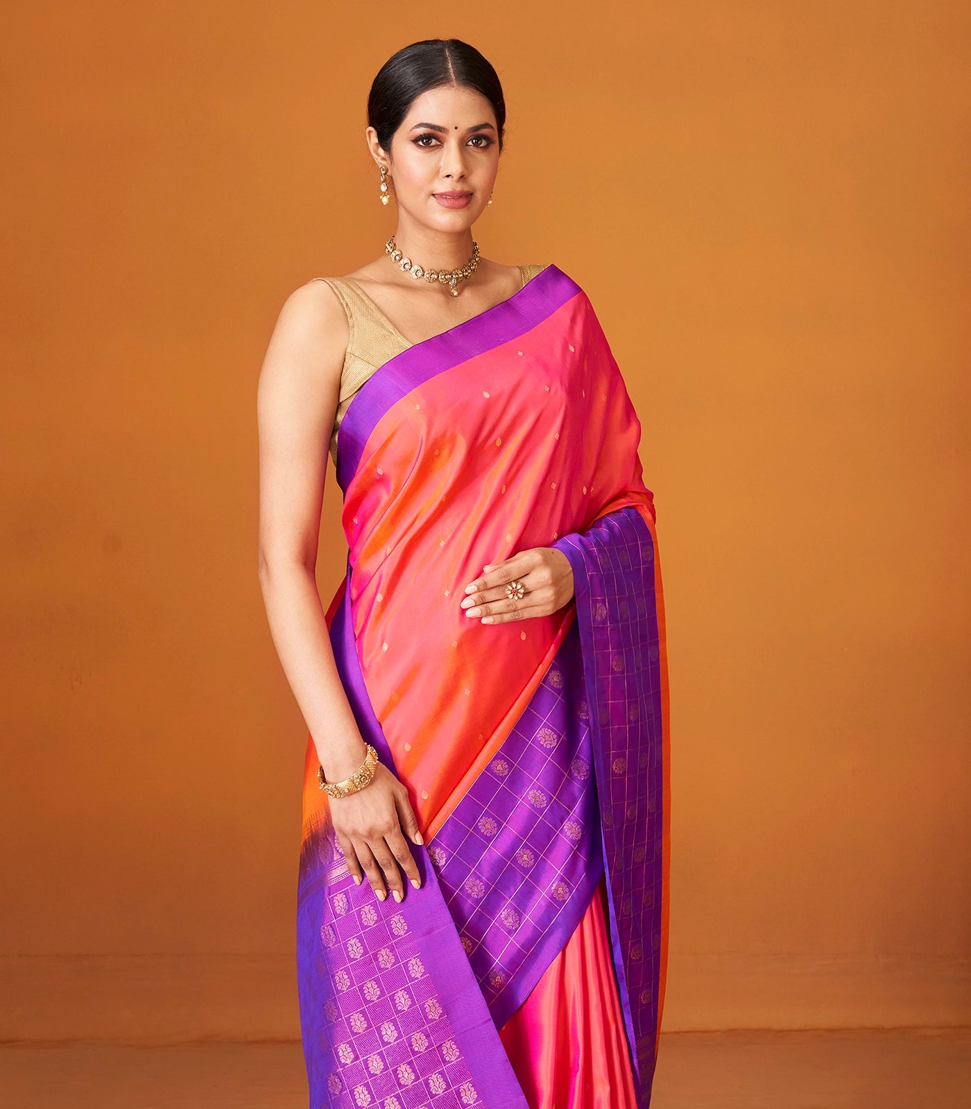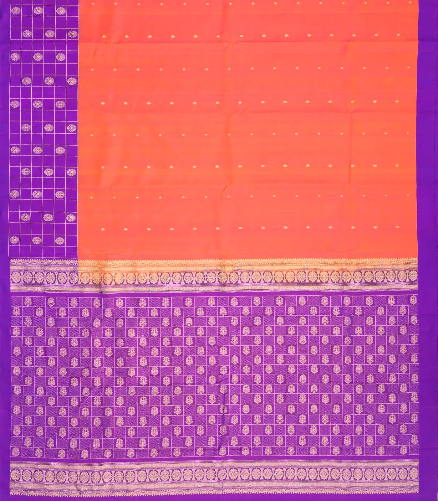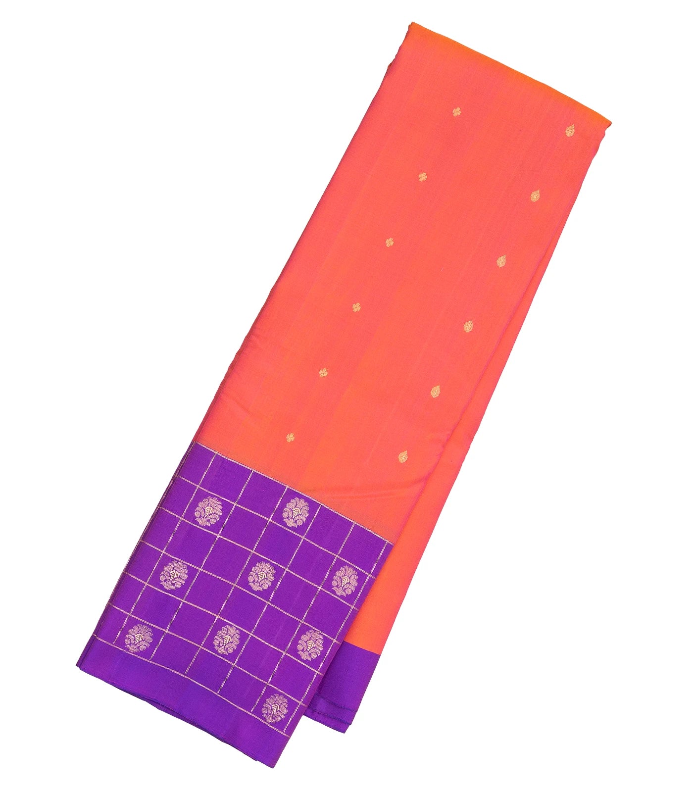 This handwoven soft silk saree is filled with floral buttas in peach body along with contrast border and pallu