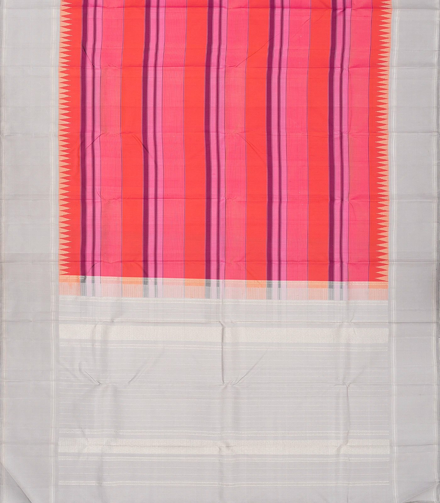 Peach & Pink Handloom Kanchipuram Korvai Silk Saree With Stripes