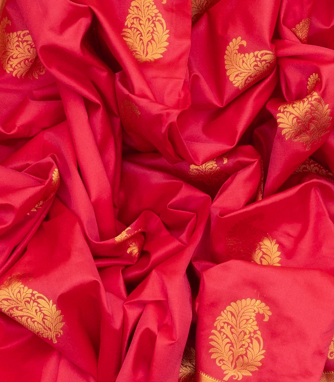 This silk saree is filled with zari mango buttas in peach body along with meena border and pallu
