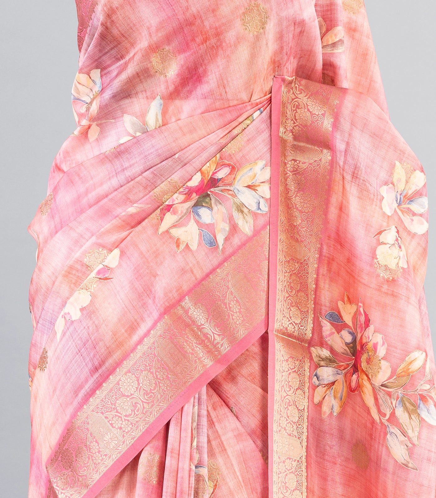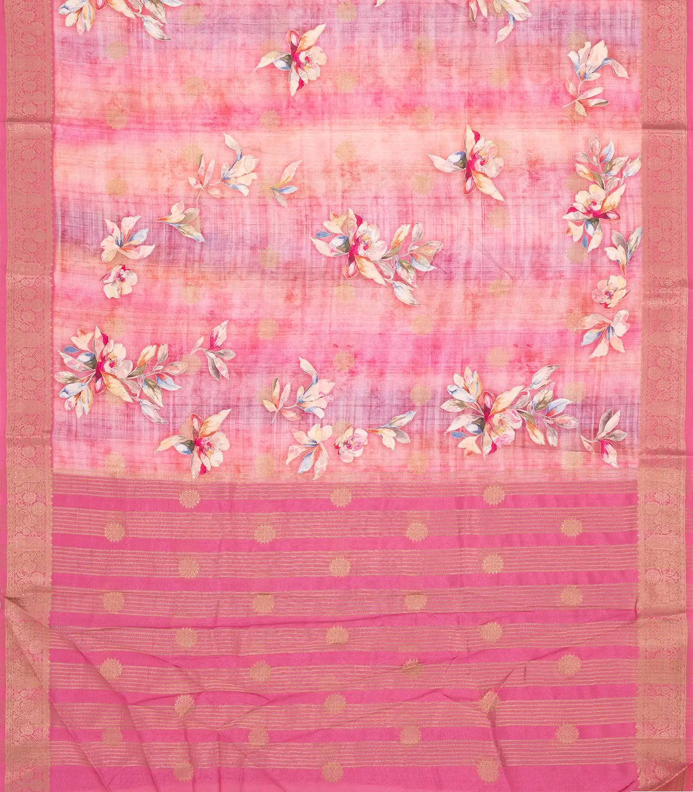 This woven art tussar saree is filled with printed floral motifs in peach body along with zari border and pallu