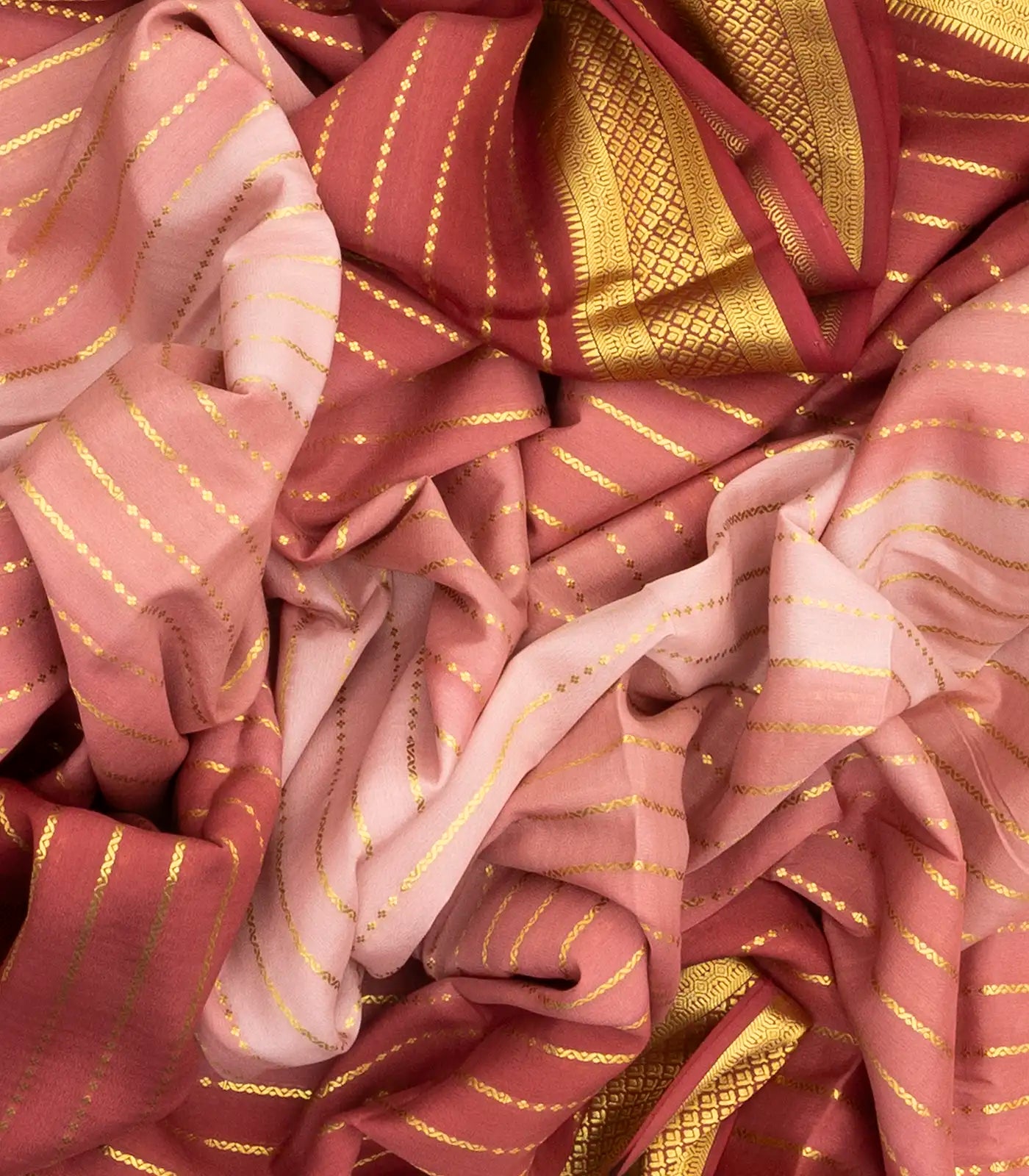 This woven Mysore crepe silk saree filled with ombre dyeing & zari stripes in peach body along with zari border and pallu