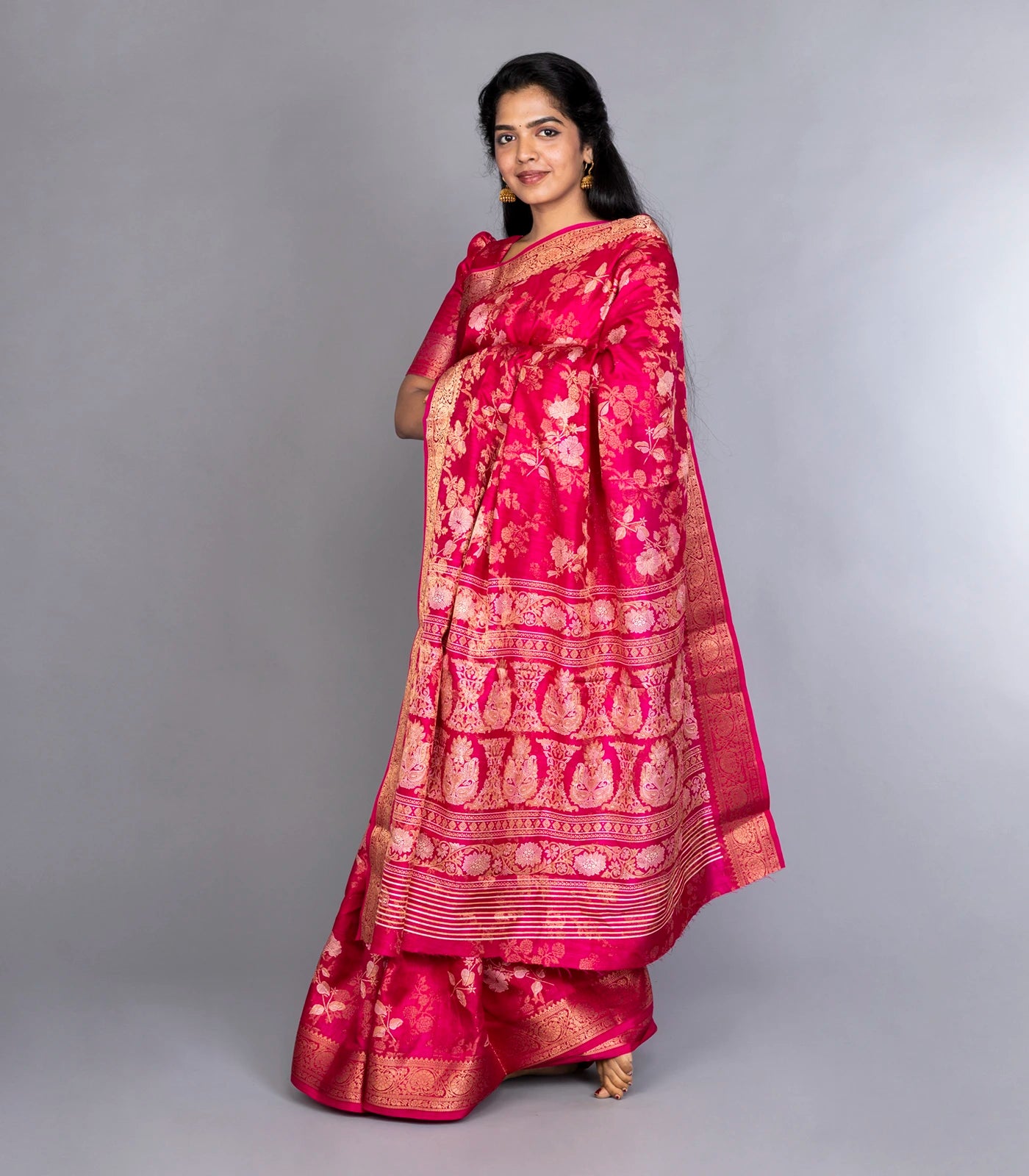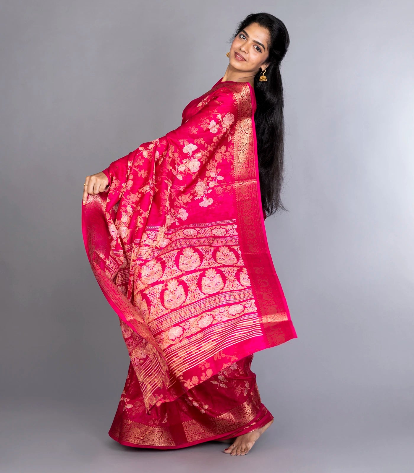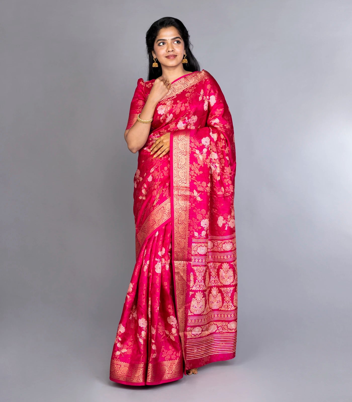 Peach Woven Synthetic Dola Saree With Printed Floral Motifs