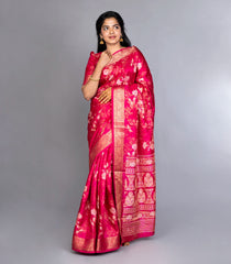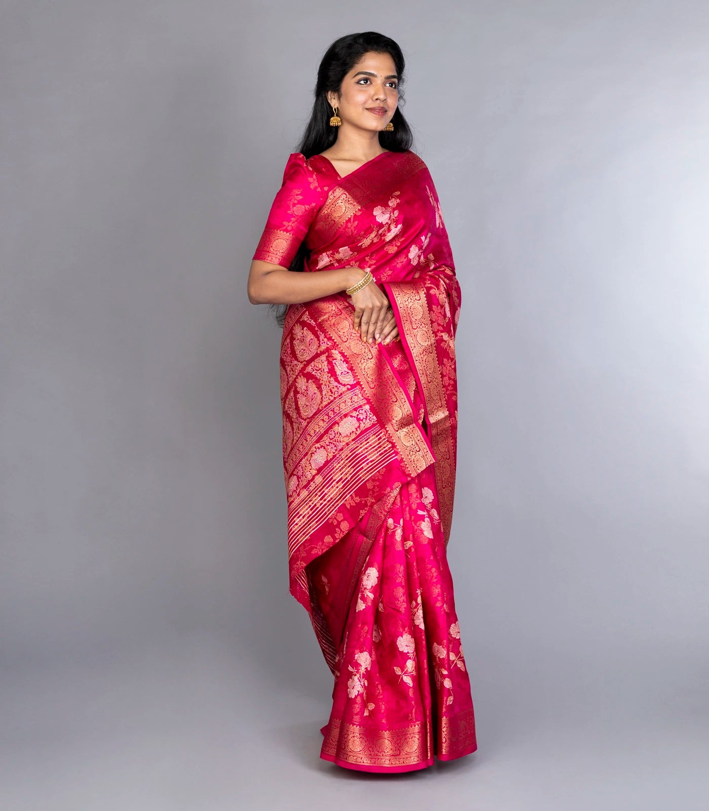 This woven synthetic dola saree filled with printed floral motifs in peach body along with floral motifs in border and pallu