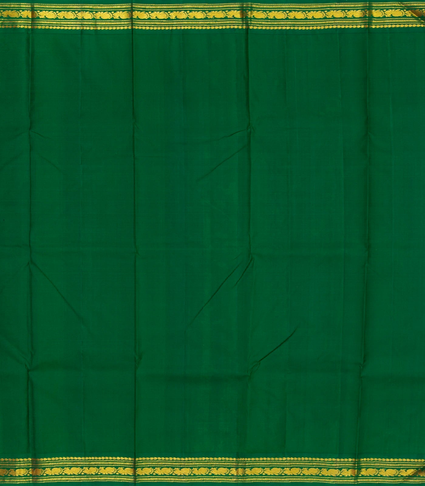 This handwoven korvai kanchipuram silk saree is filled with plain pink body along with annam motifs in contrast green zari border and pallu