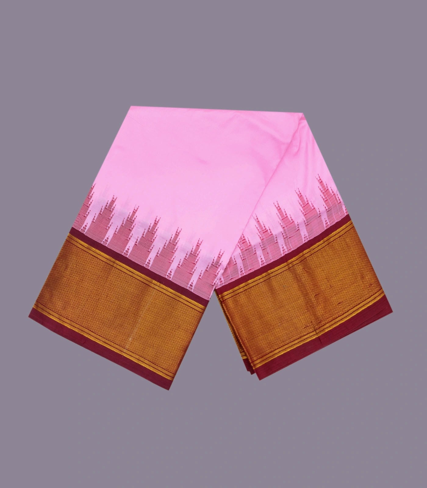 Pink Handloom Korvai Swami Silk Vasthiram With Crimson Thazampoo Rekku Border 24 x 12