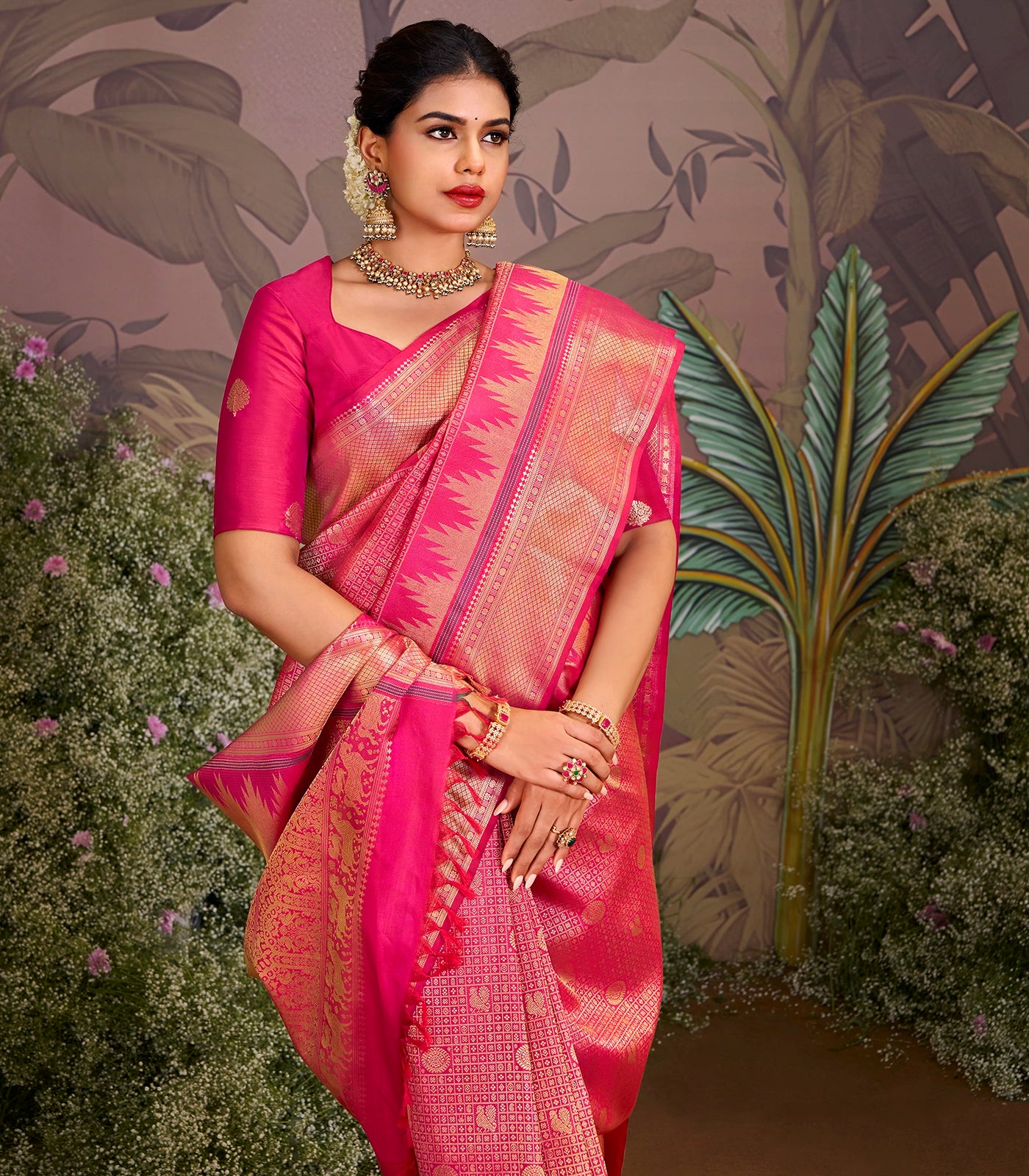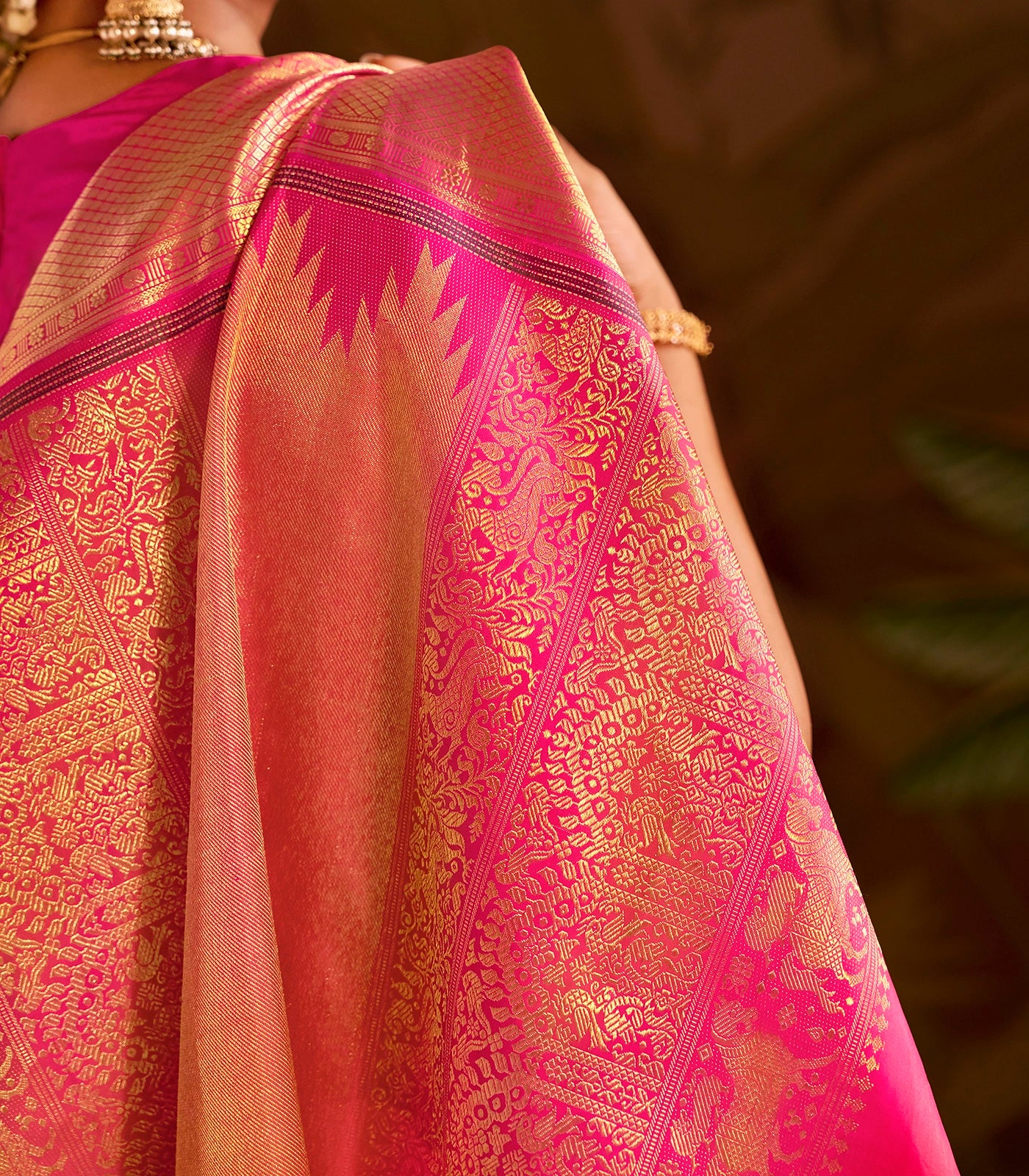 blends seamlessly with masterful artistry. This saree in a captivating royal pink hue is