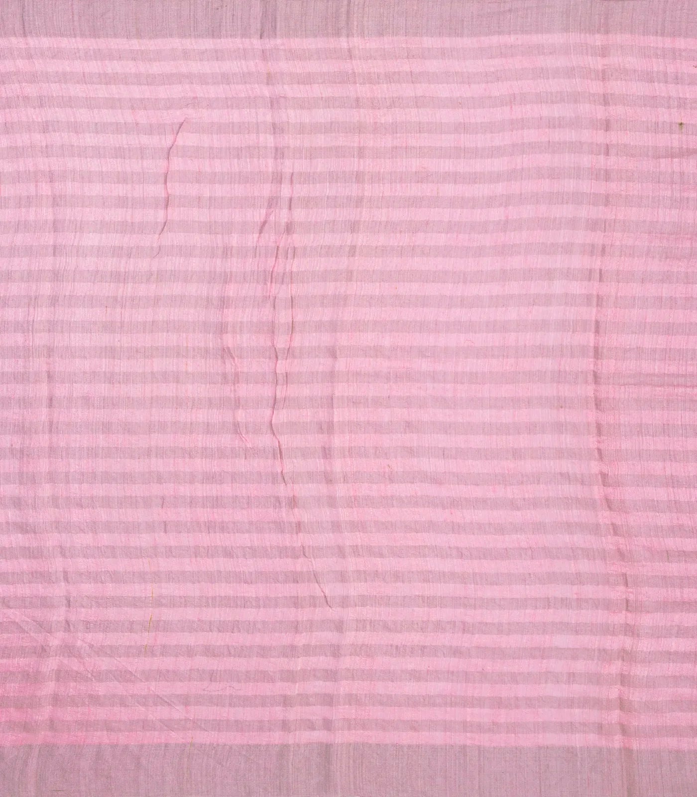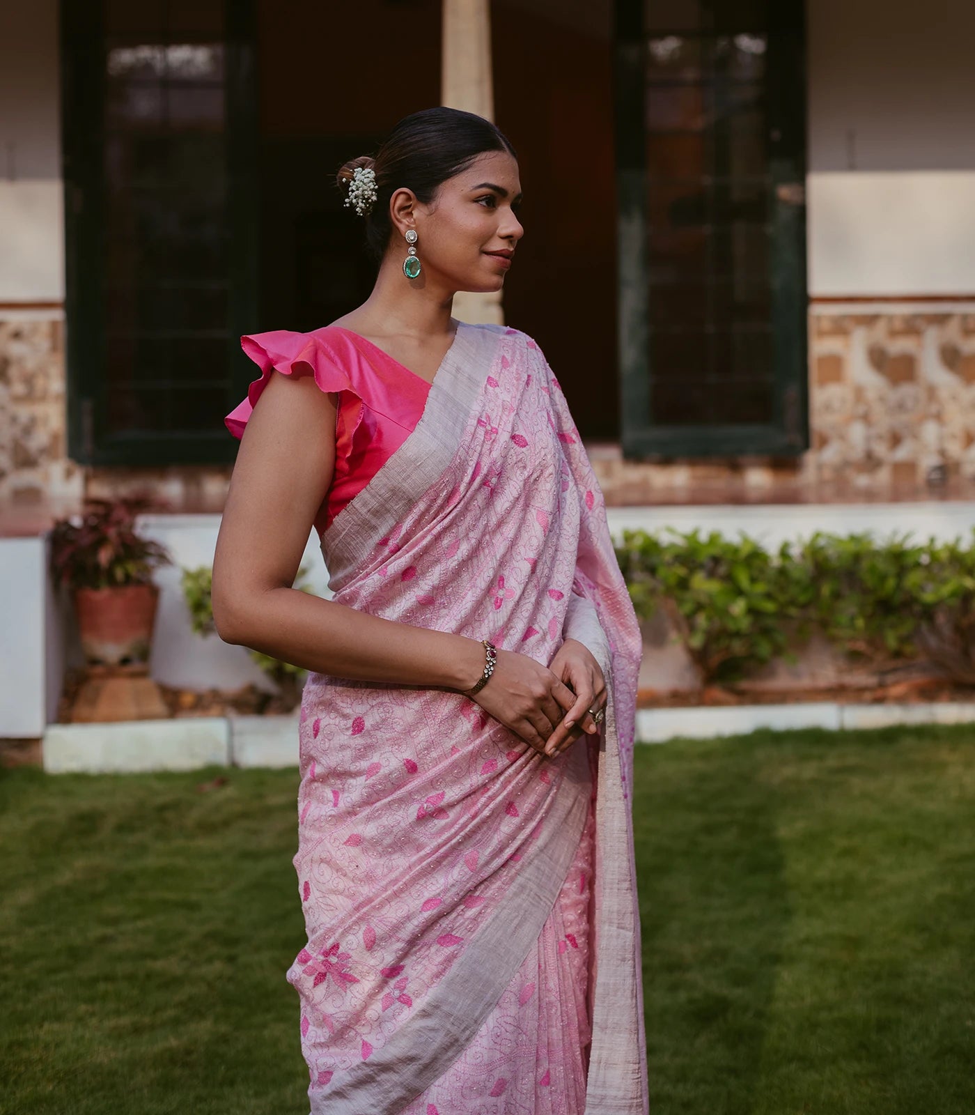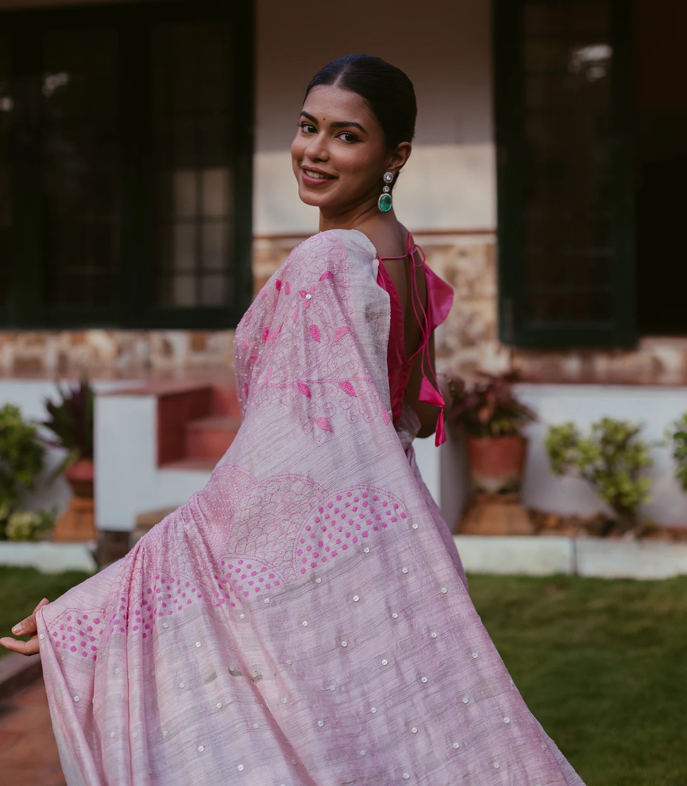 Pink Handwoven Linen Saree With Tree of Life Embroidery Motifs