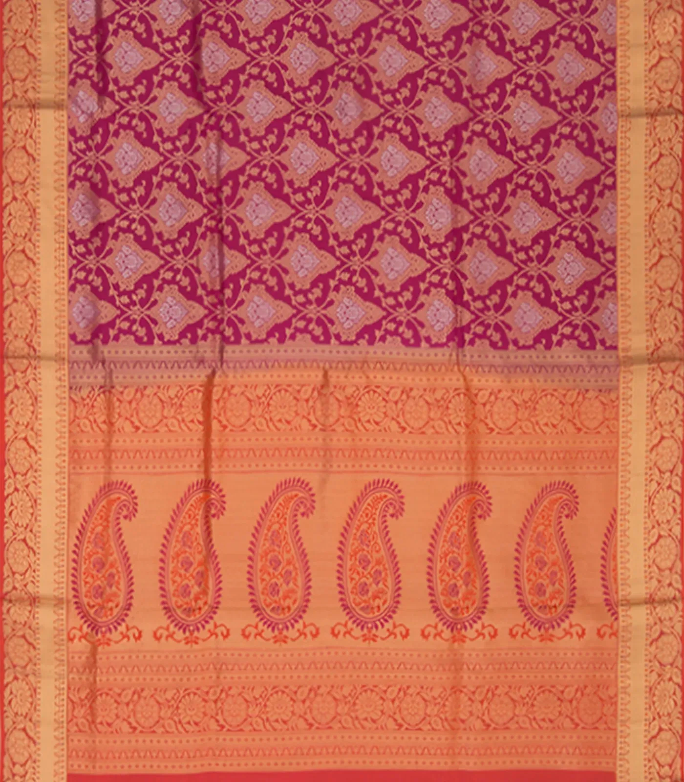 Pink Handwoven Soft Silk Saree With Mango And Vine Motifs In Contrast Rust Border & Pallu-Pink