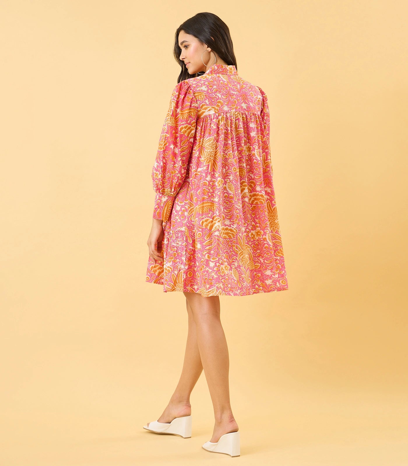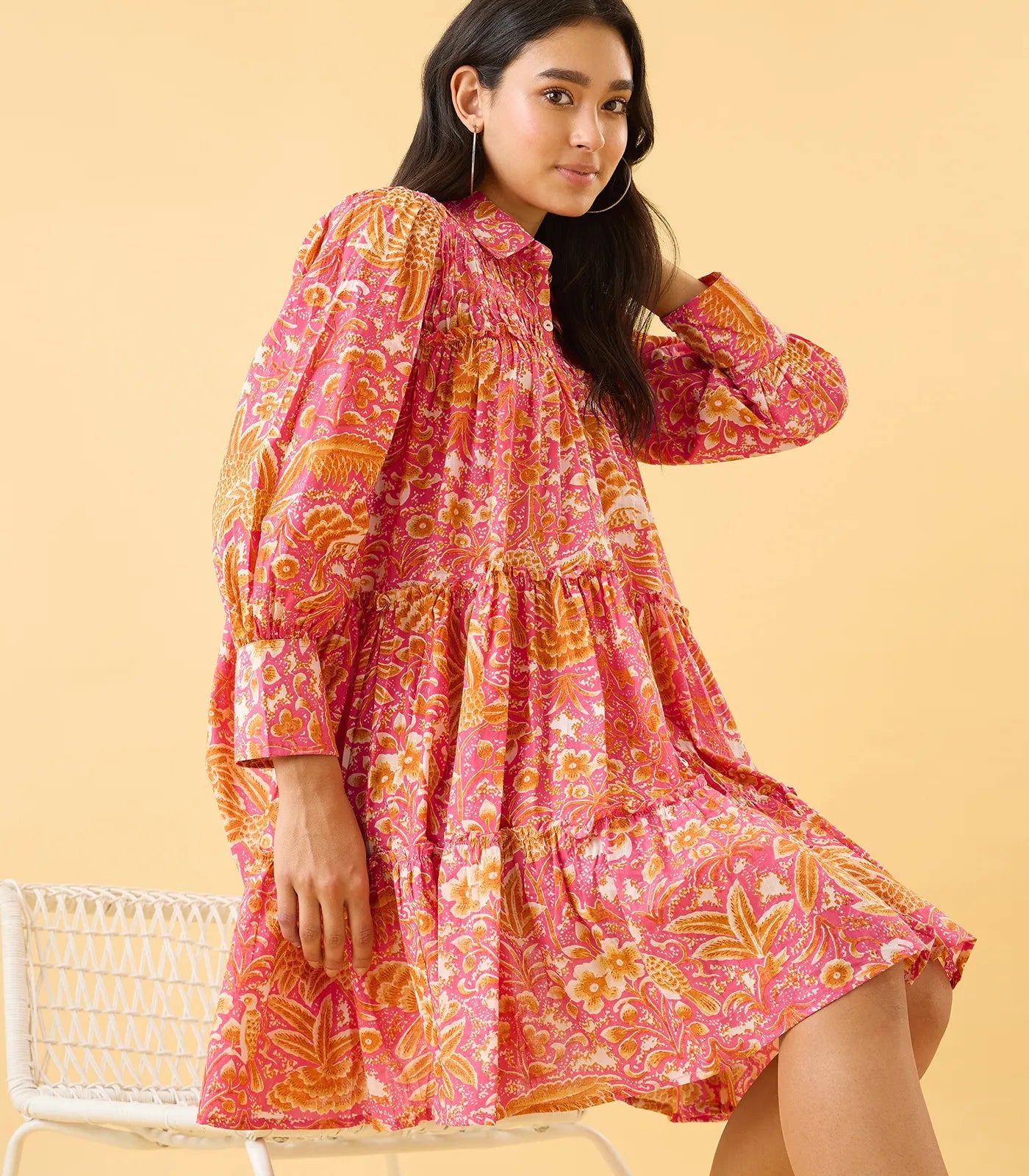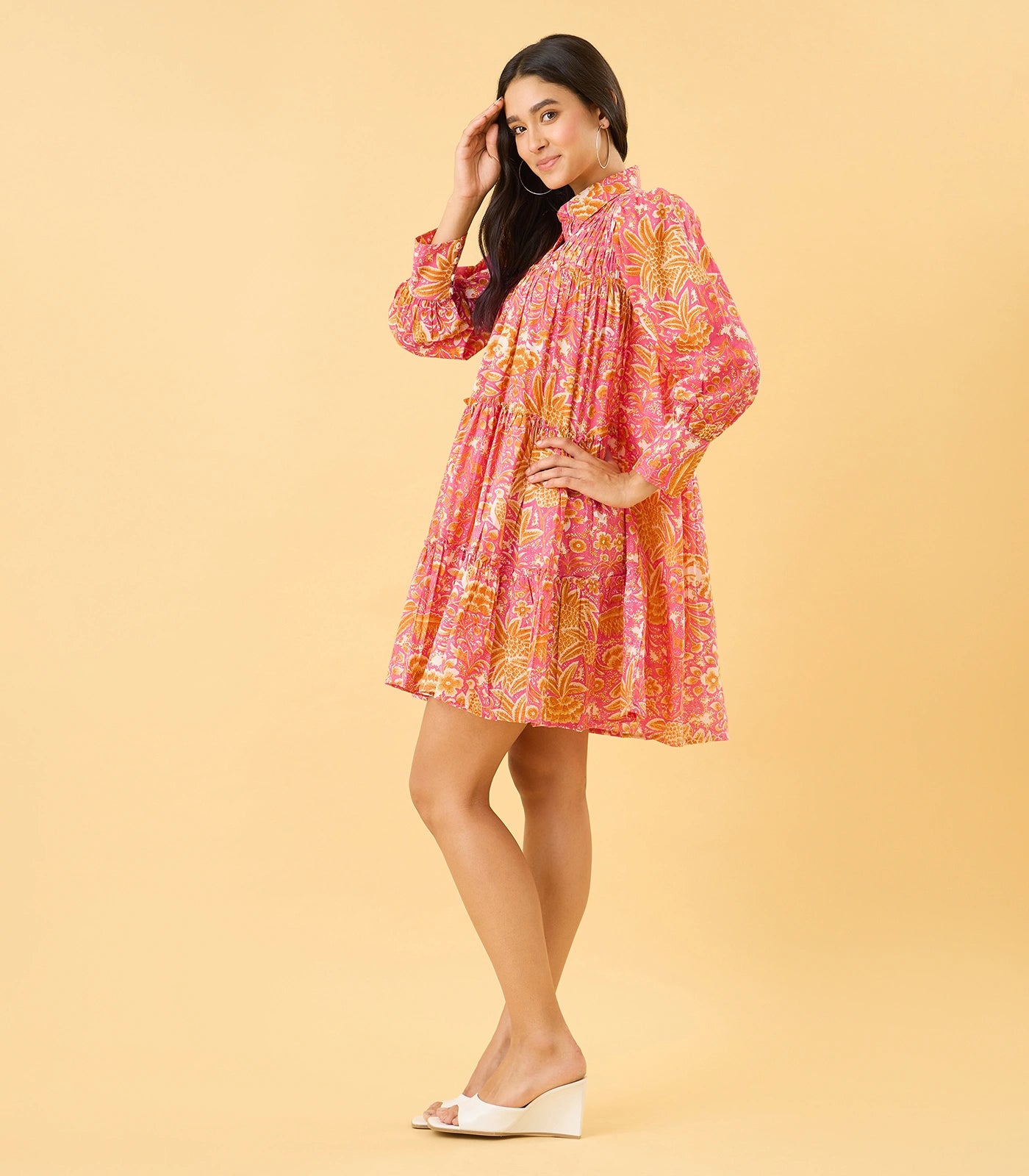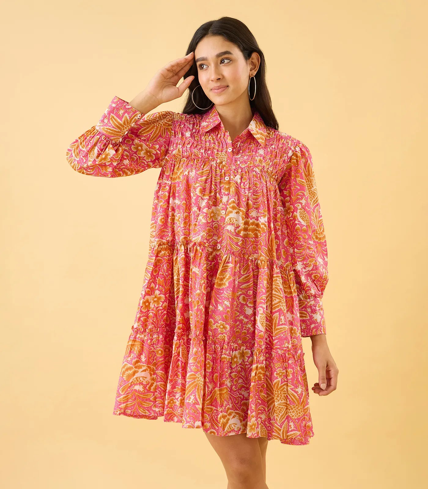 Featuring a modern shirt collar neckline, elegant bishop sleeves, and wave tuck detailing, this floral print dress offers a unique three-tier layered silhouette for a fashionable, comfortable fit.