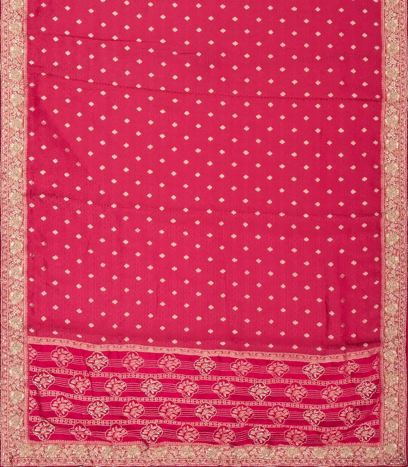 This woven crepe brocade saree is filled with embroidered floral motifs in pink body along with border and pallu