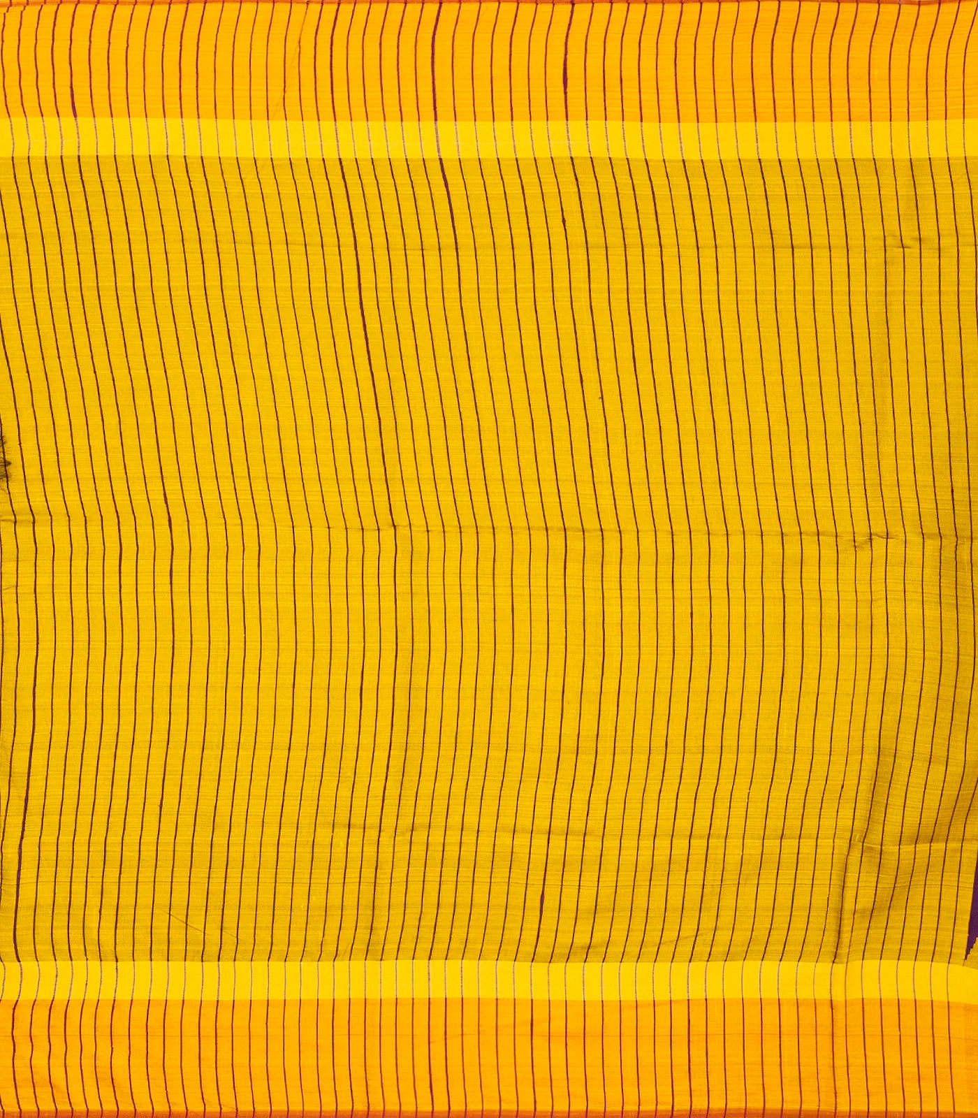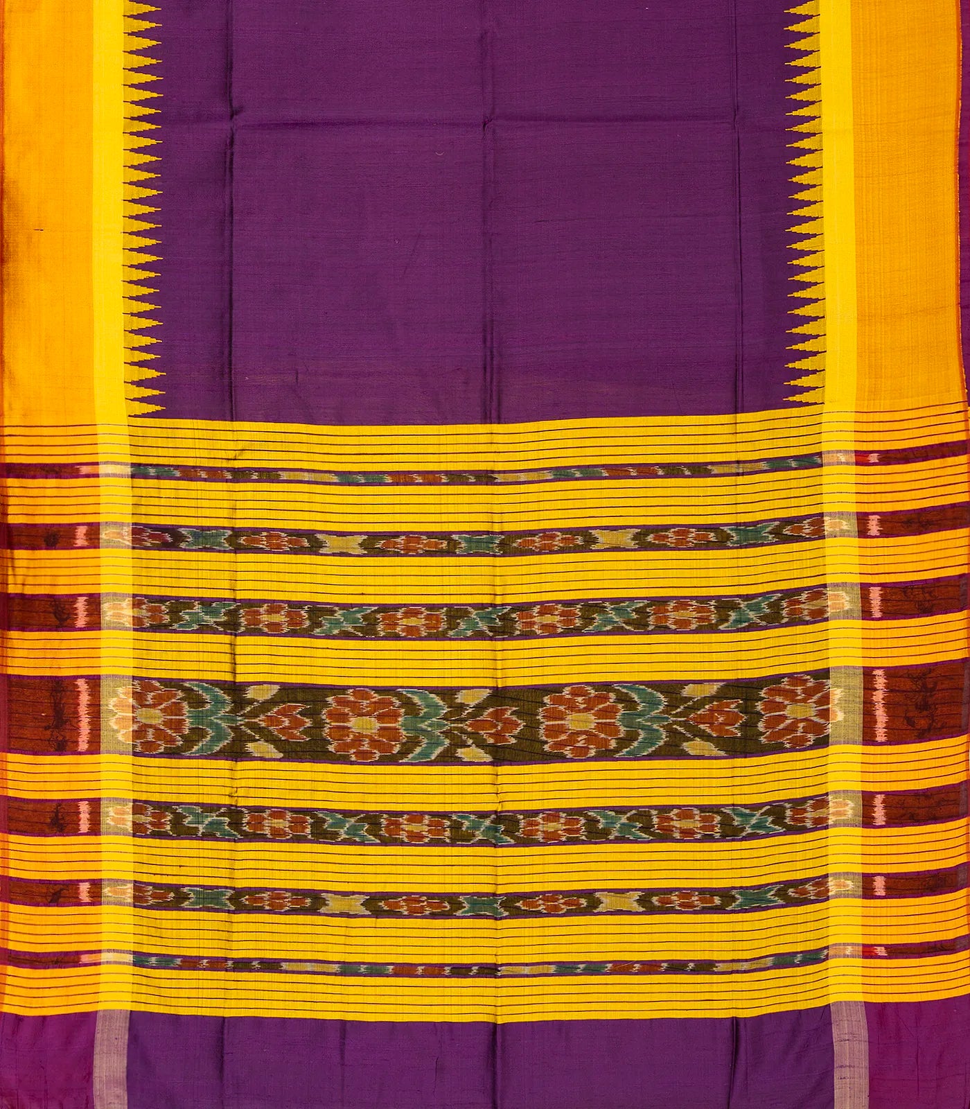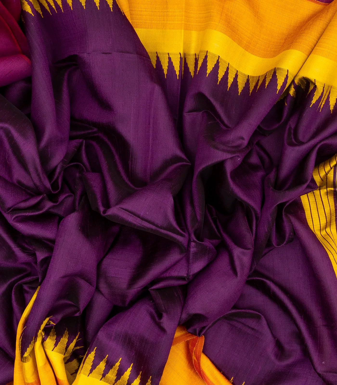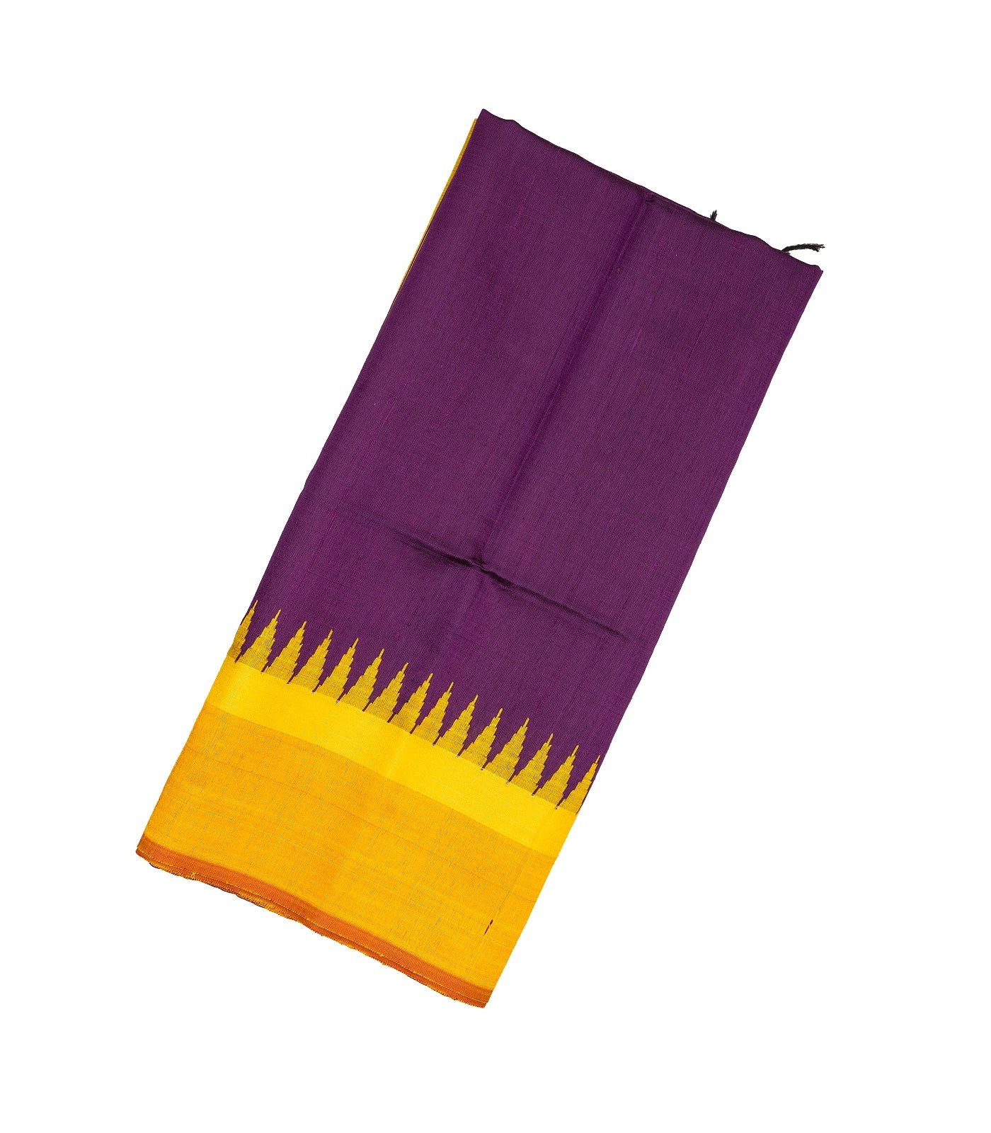 This handwoven dupion silk saree is filled with plain purple body along with contrast temple border and pallu