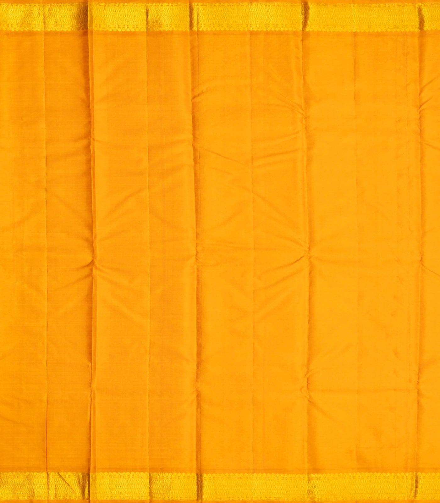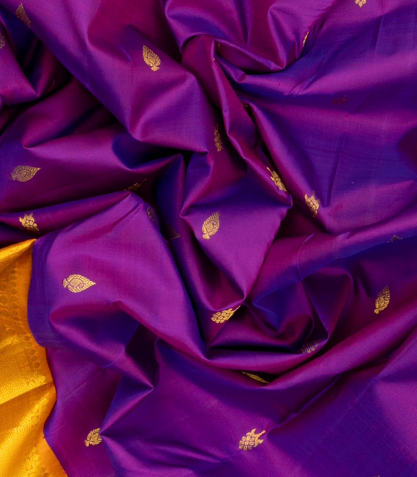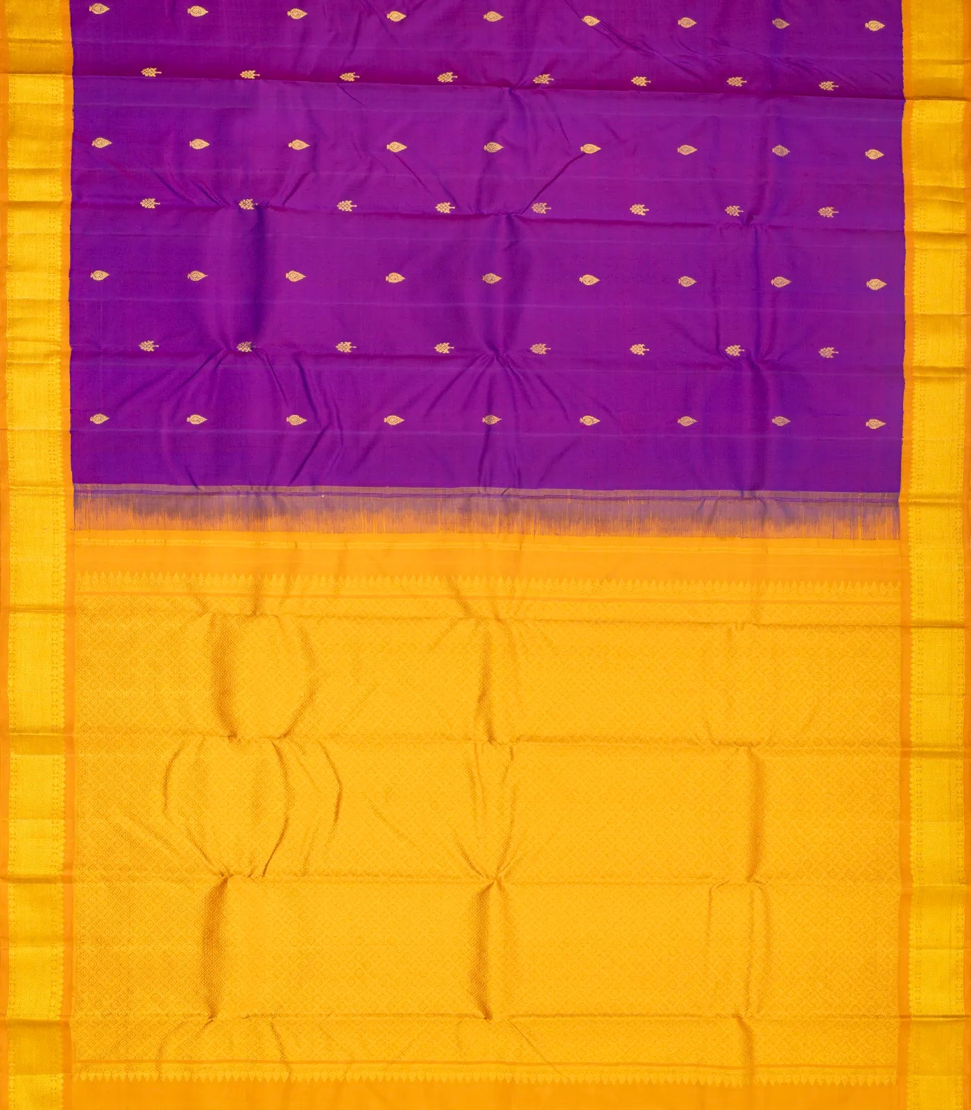 This handwoven kanchipuram korvai silk saree is filled with floral buttas in purple body along with contrast mustard border and pallu