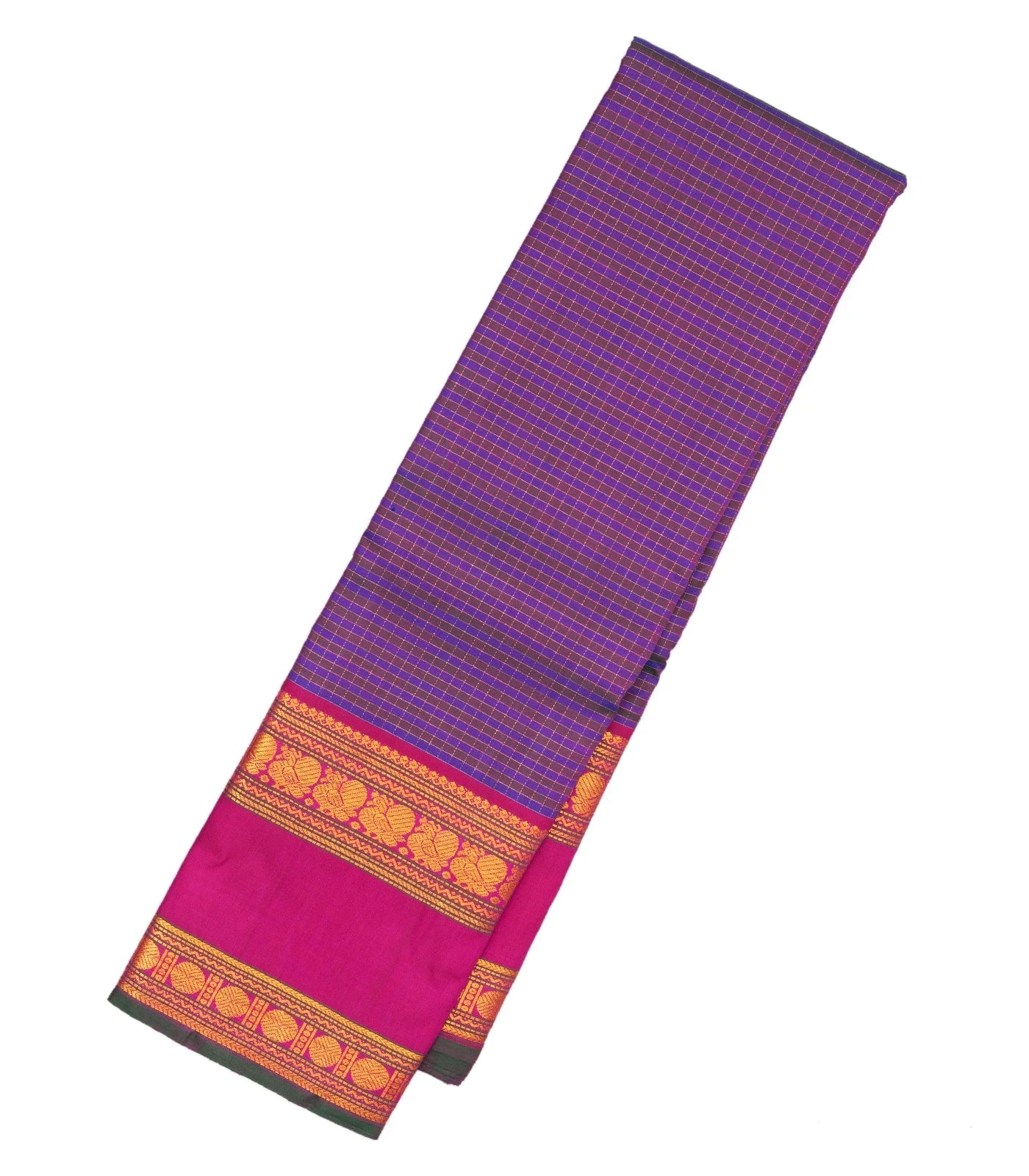 This handwoven kanchipuram silk saree with checks in purple body along with contrast border & pallu