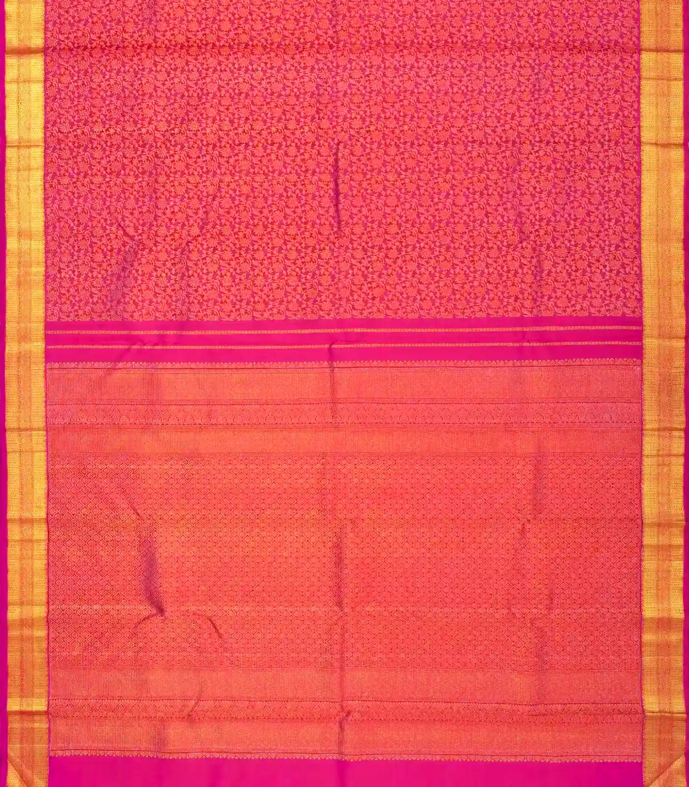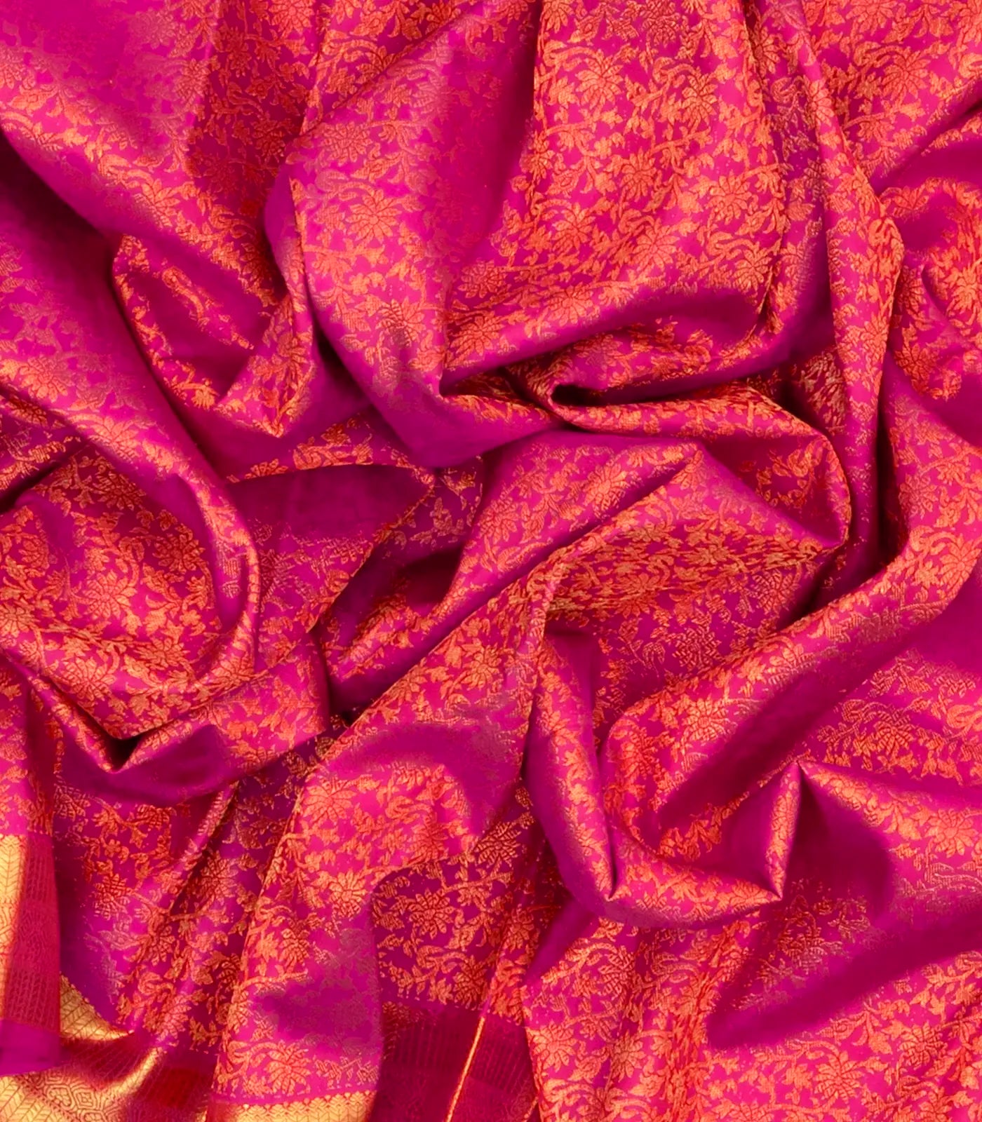 This handwoven kanchipuram silk saree is filled with floral vine motifs in purple body along with zari border and pallu
