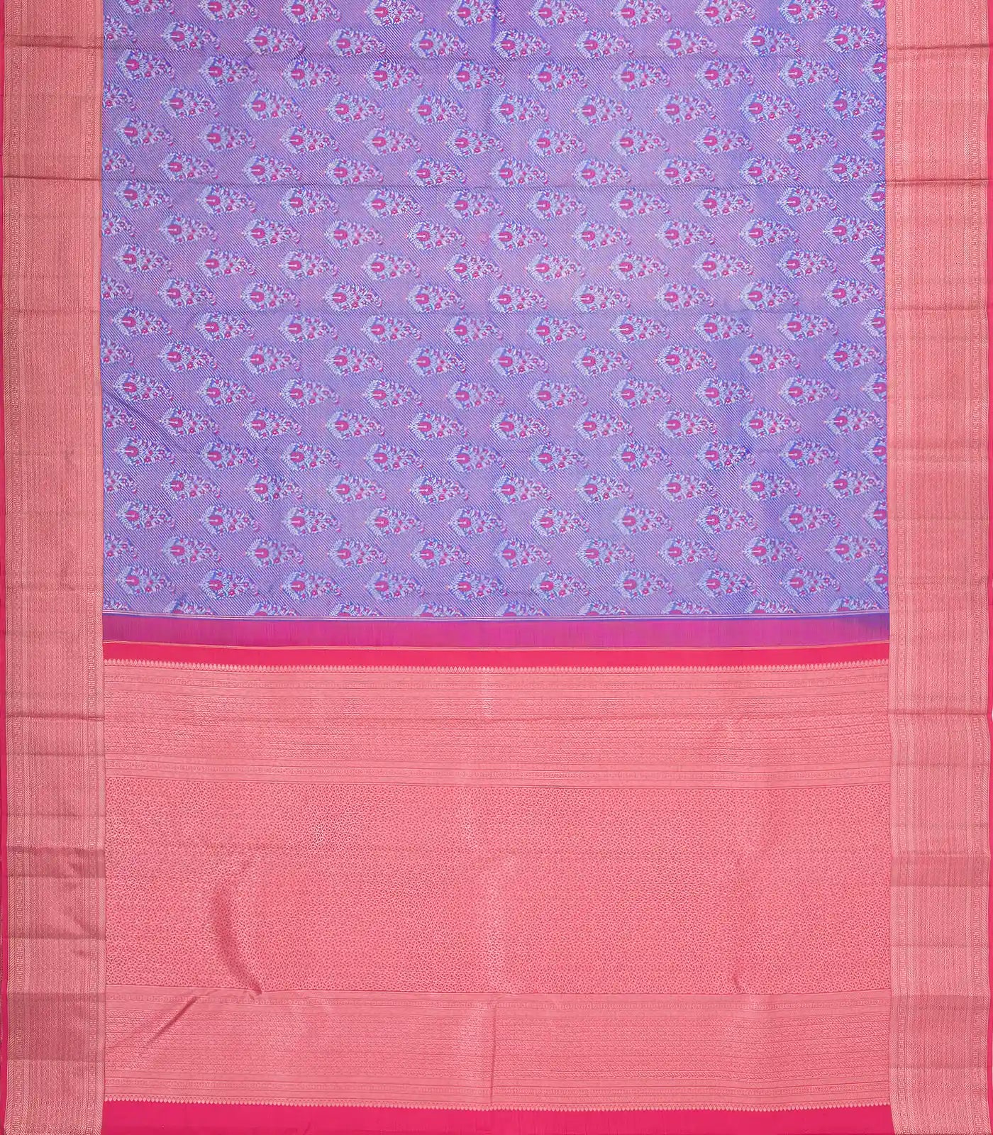 This handwoven kanchipuram silk saree is filled with meena floral motifs in purple body along with contrast zari border and pallu