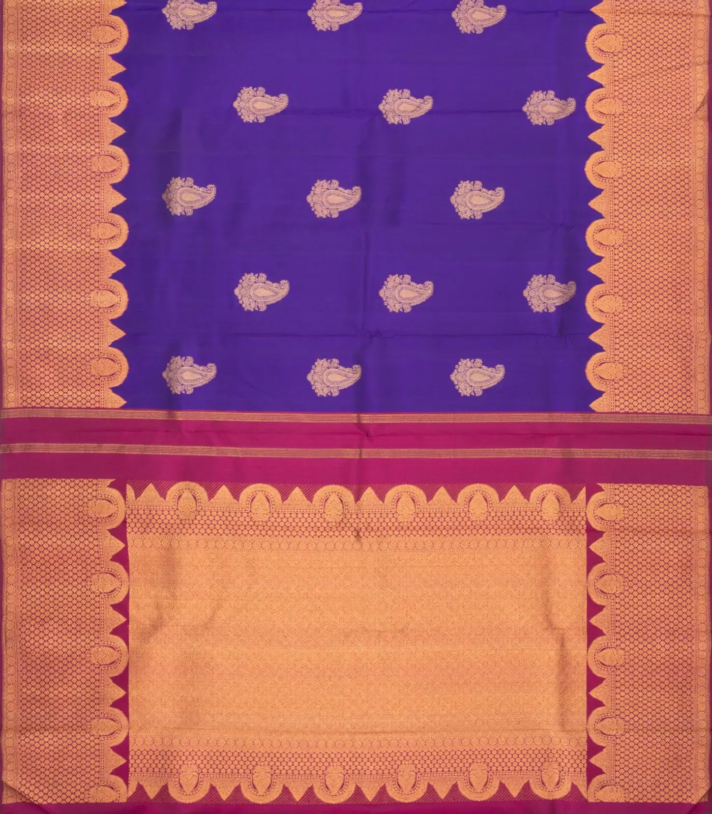 This handwoven korvai kanchipuram silk saree is filled with mango buttas in purple body along with contrast running border and pallu