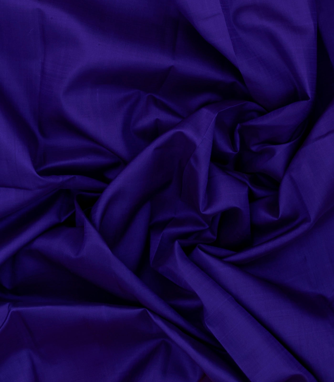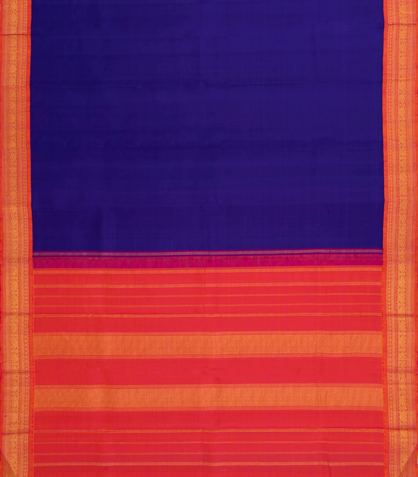 This handwoven korvai kanchipuram silk saree is filled with plain purple body along with orange border and pallu