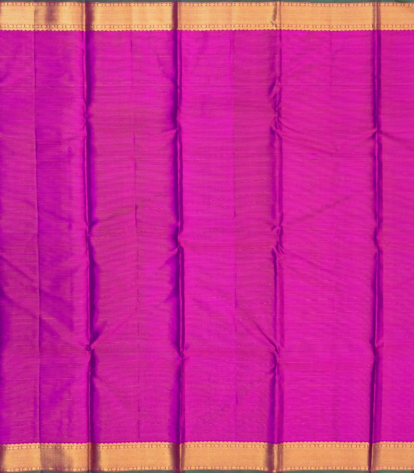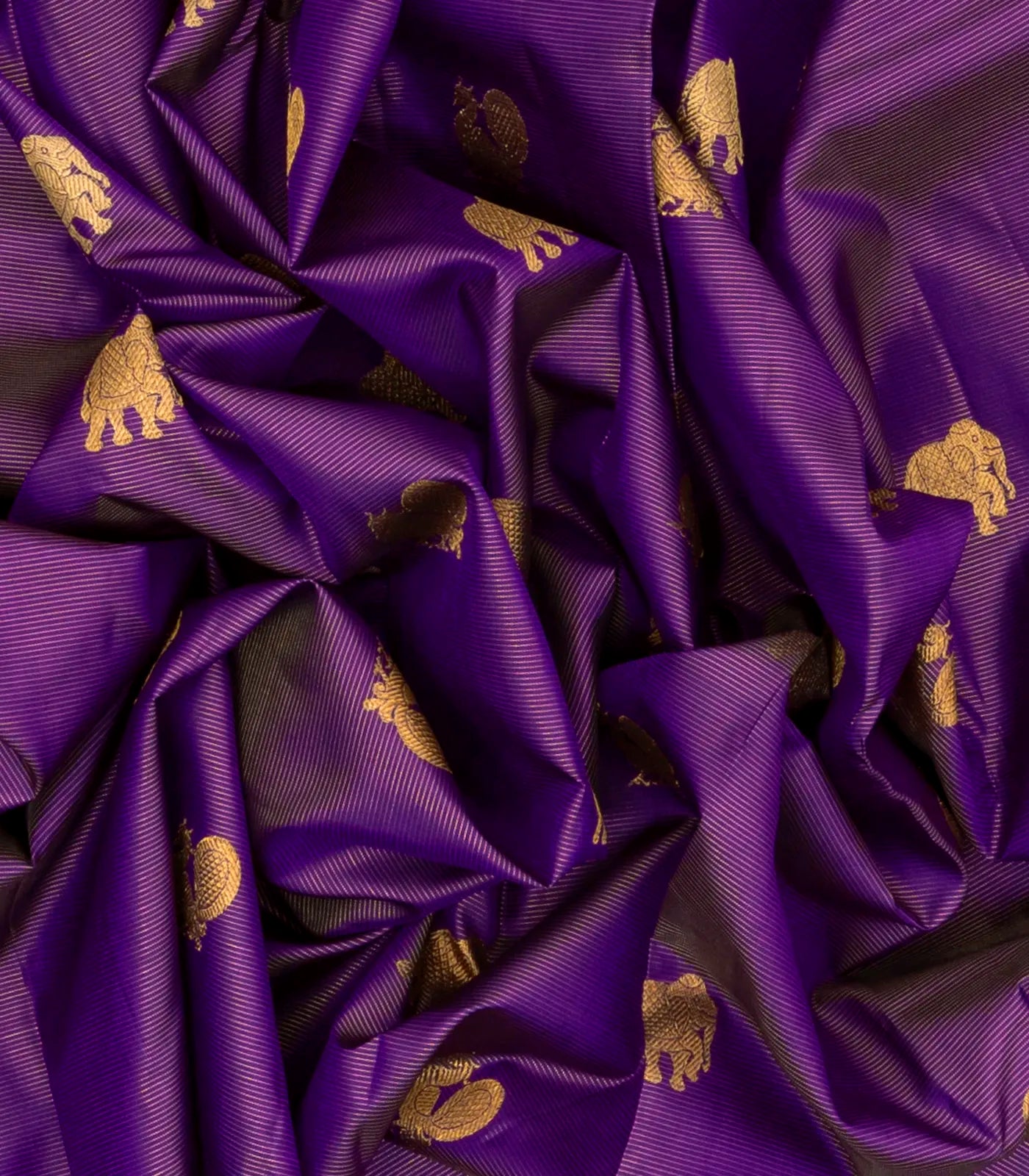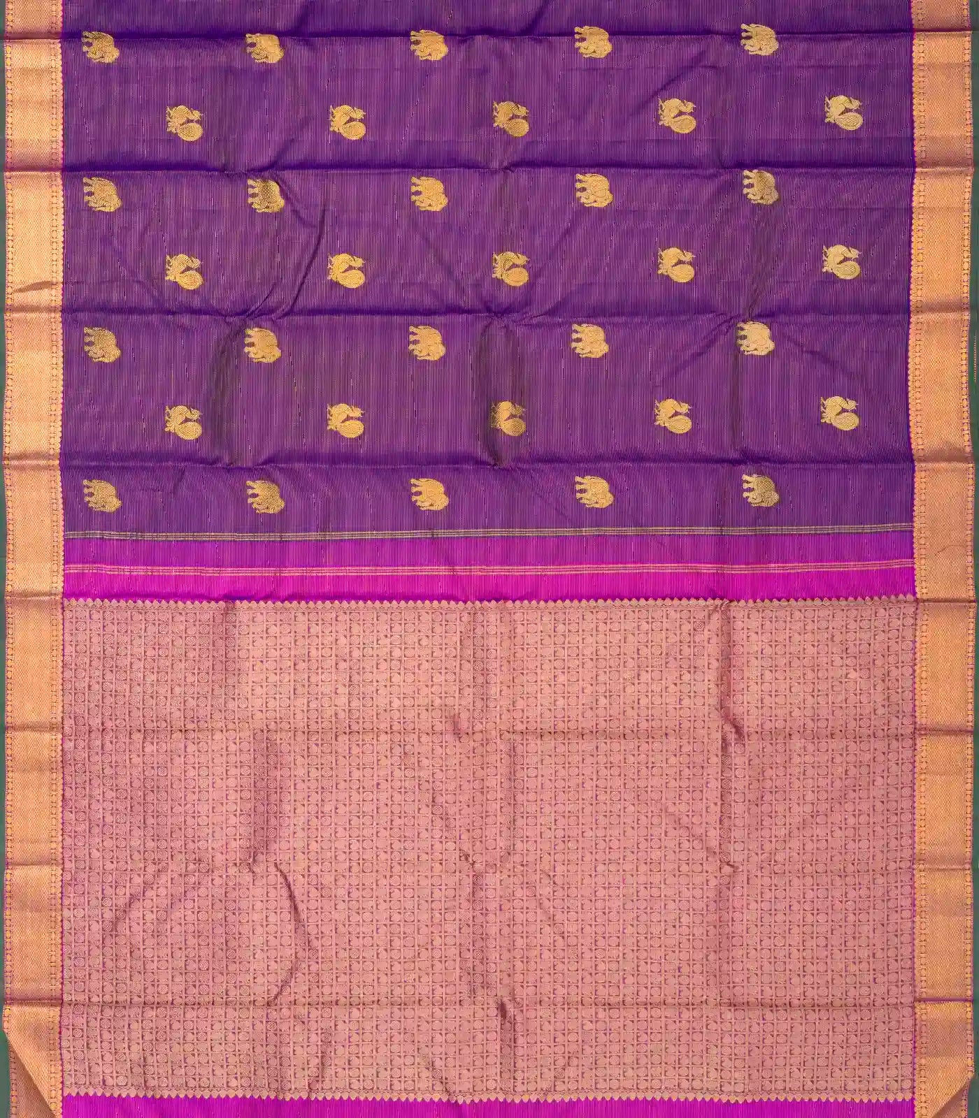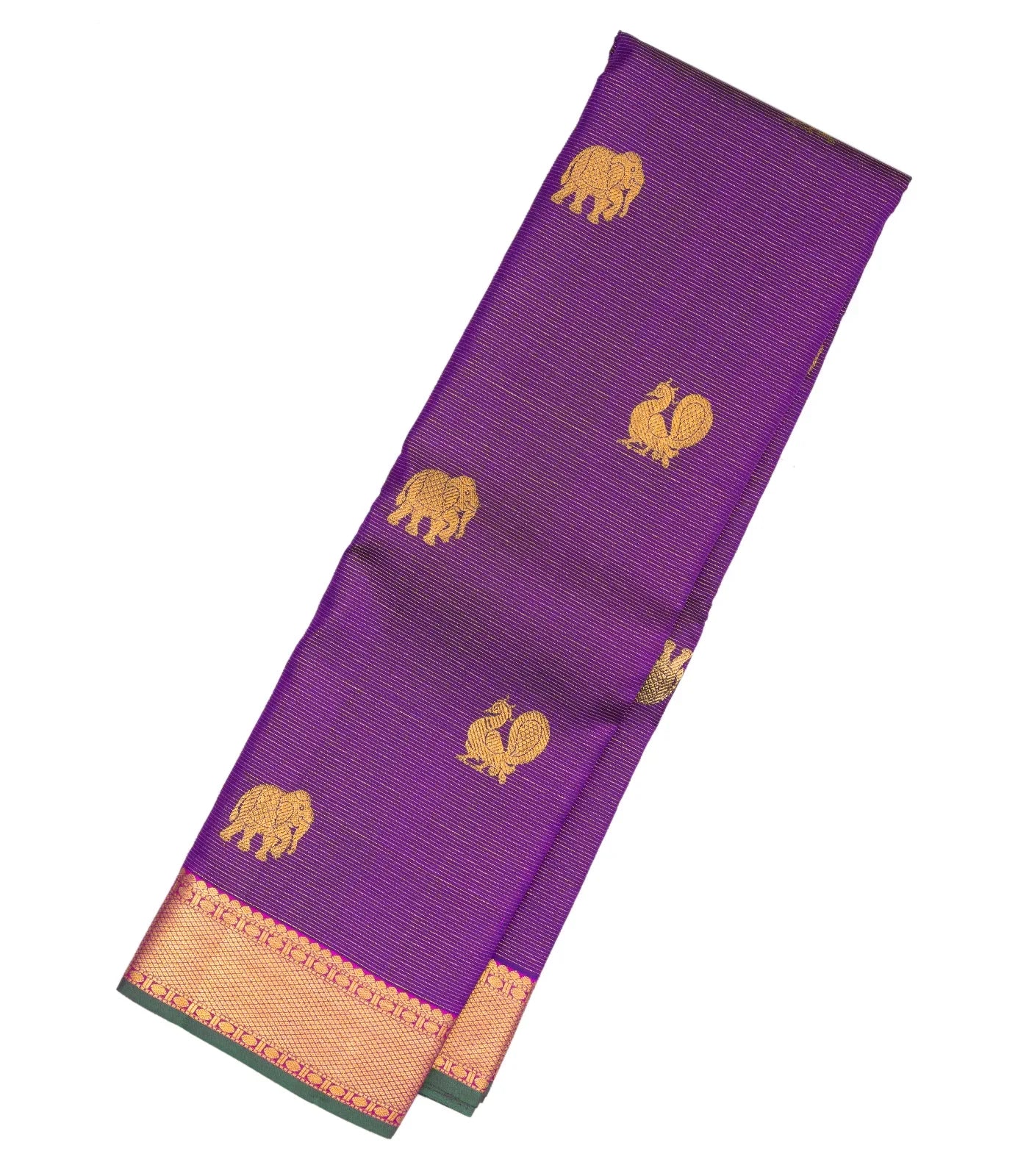 This handwoven kanchipuram silk saree is filled with vairaoosi stripes & buttas in purple body along with border and pallu