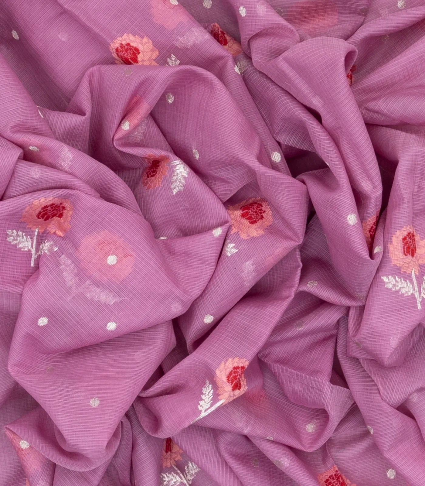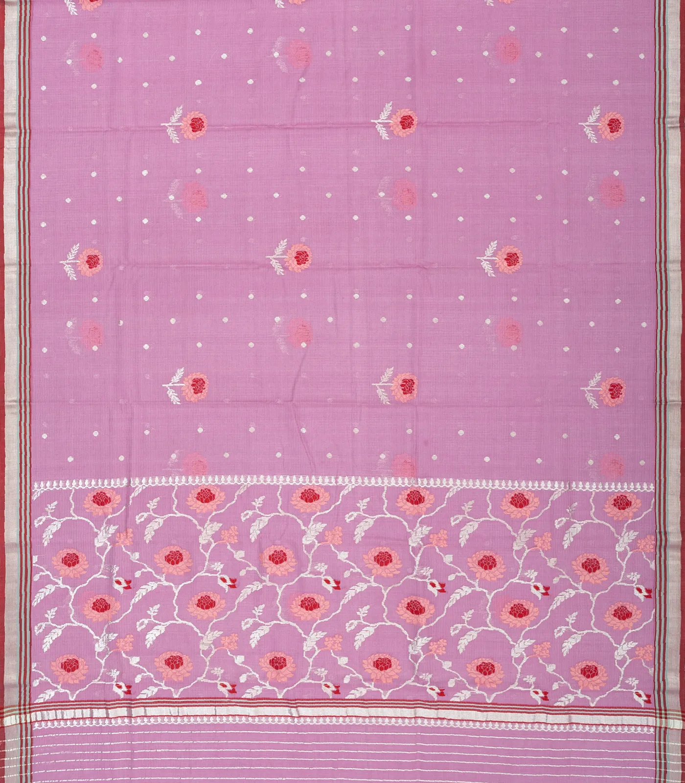 This handwoven kota silk saree is filled with meena floral buttas in lavender body along with contrast border and pallu