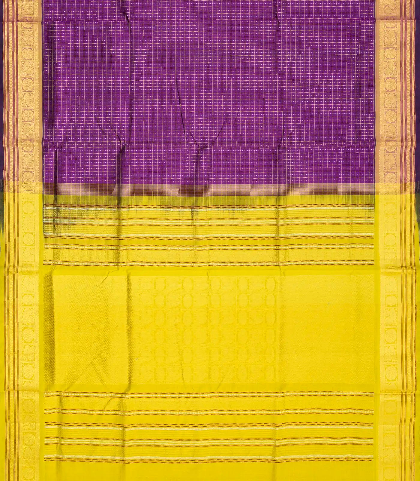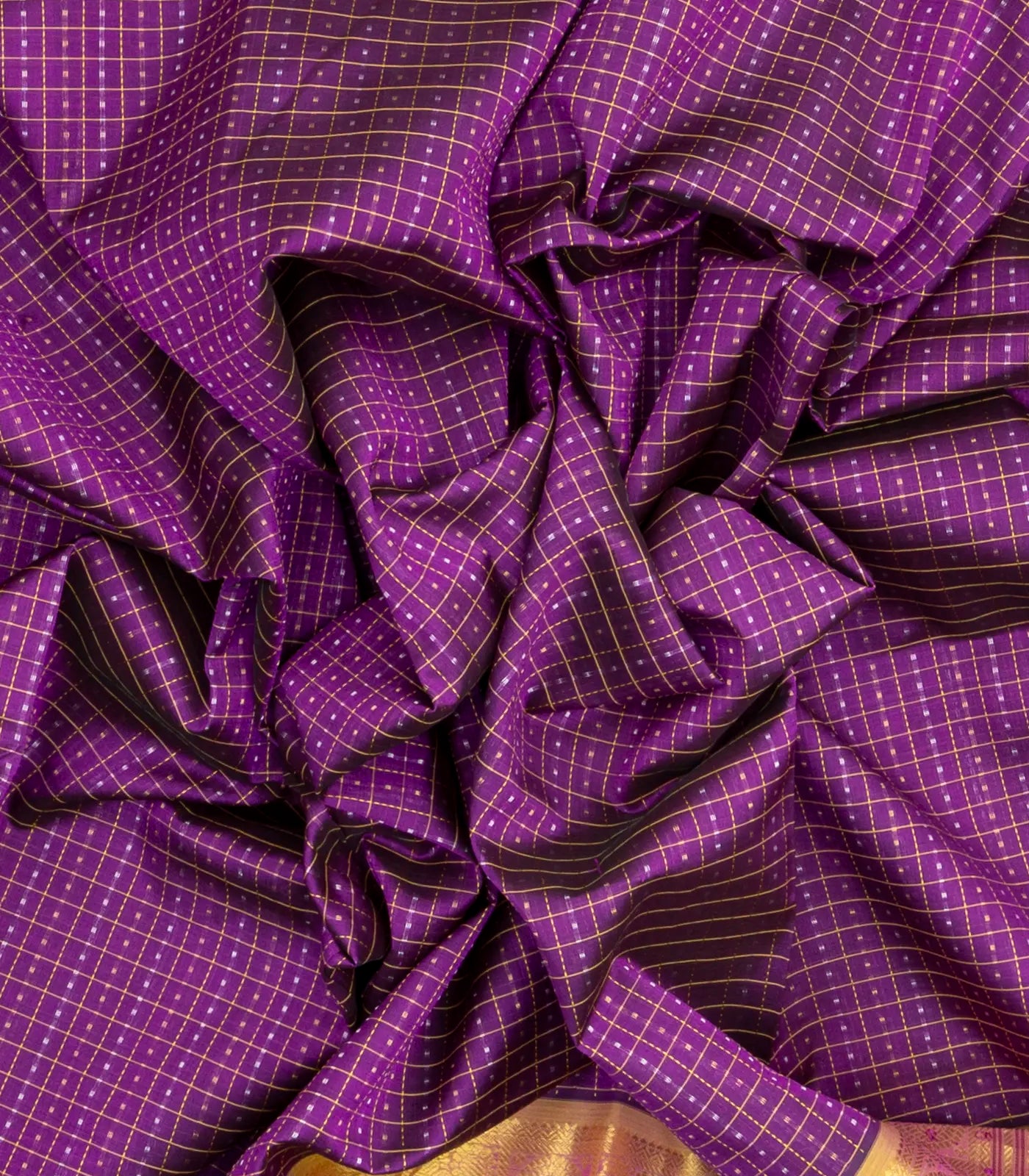This handwoven silk cotton saree is filled with checks in purple body along with border and contrast pallu