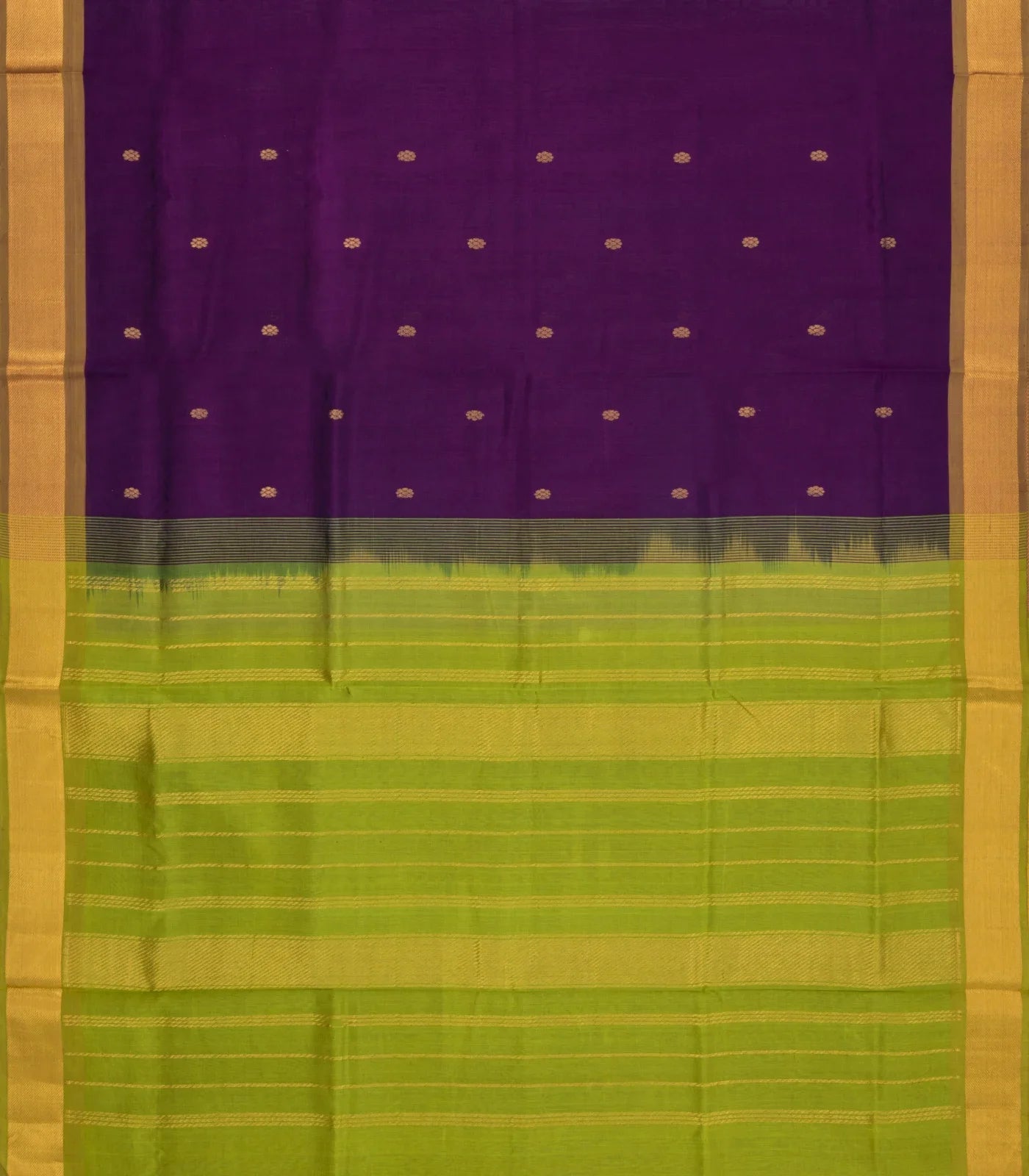 This handwoven silk cotton saree is filled with floral buttas in purple body along with contrast zari border and pallu