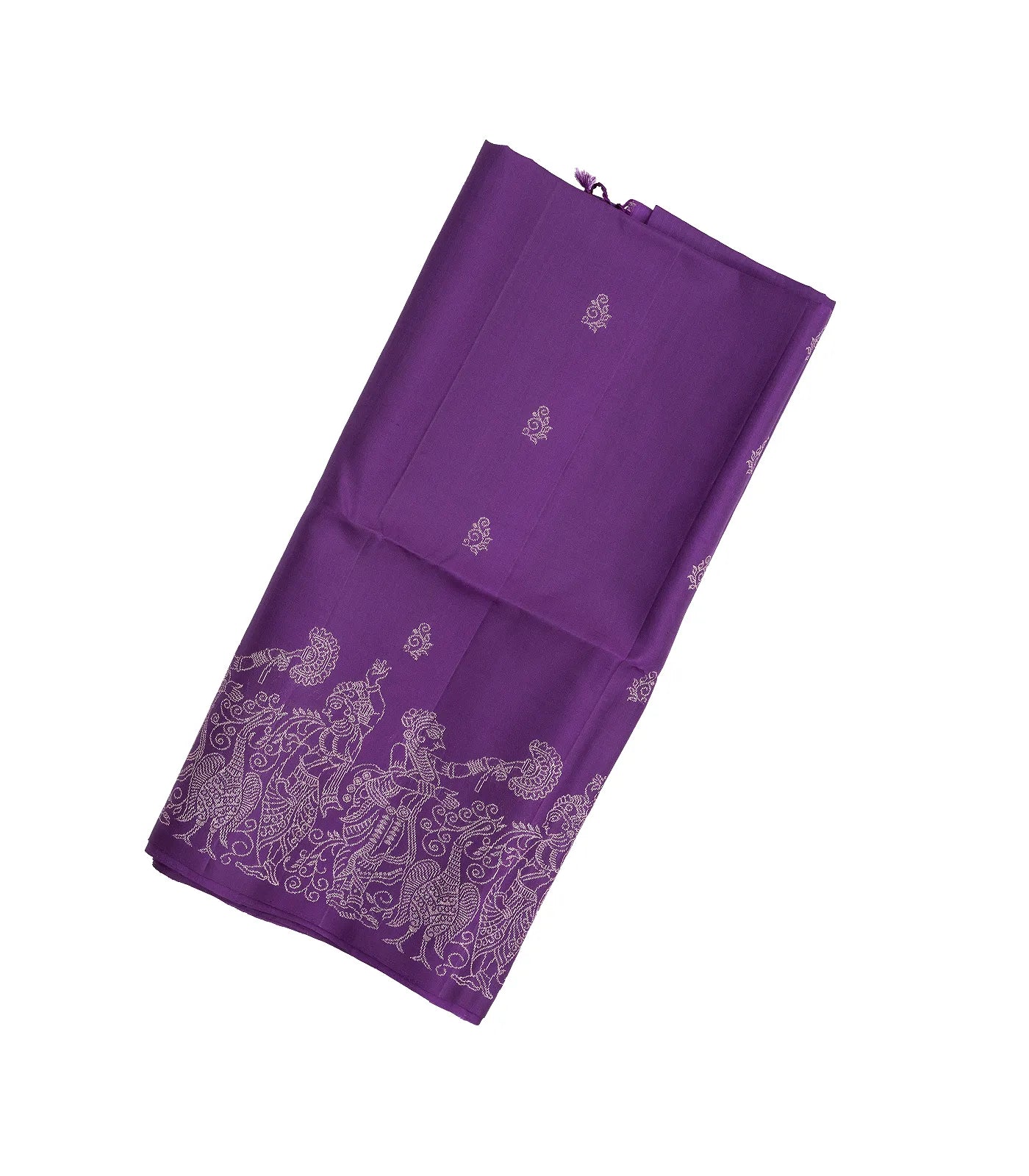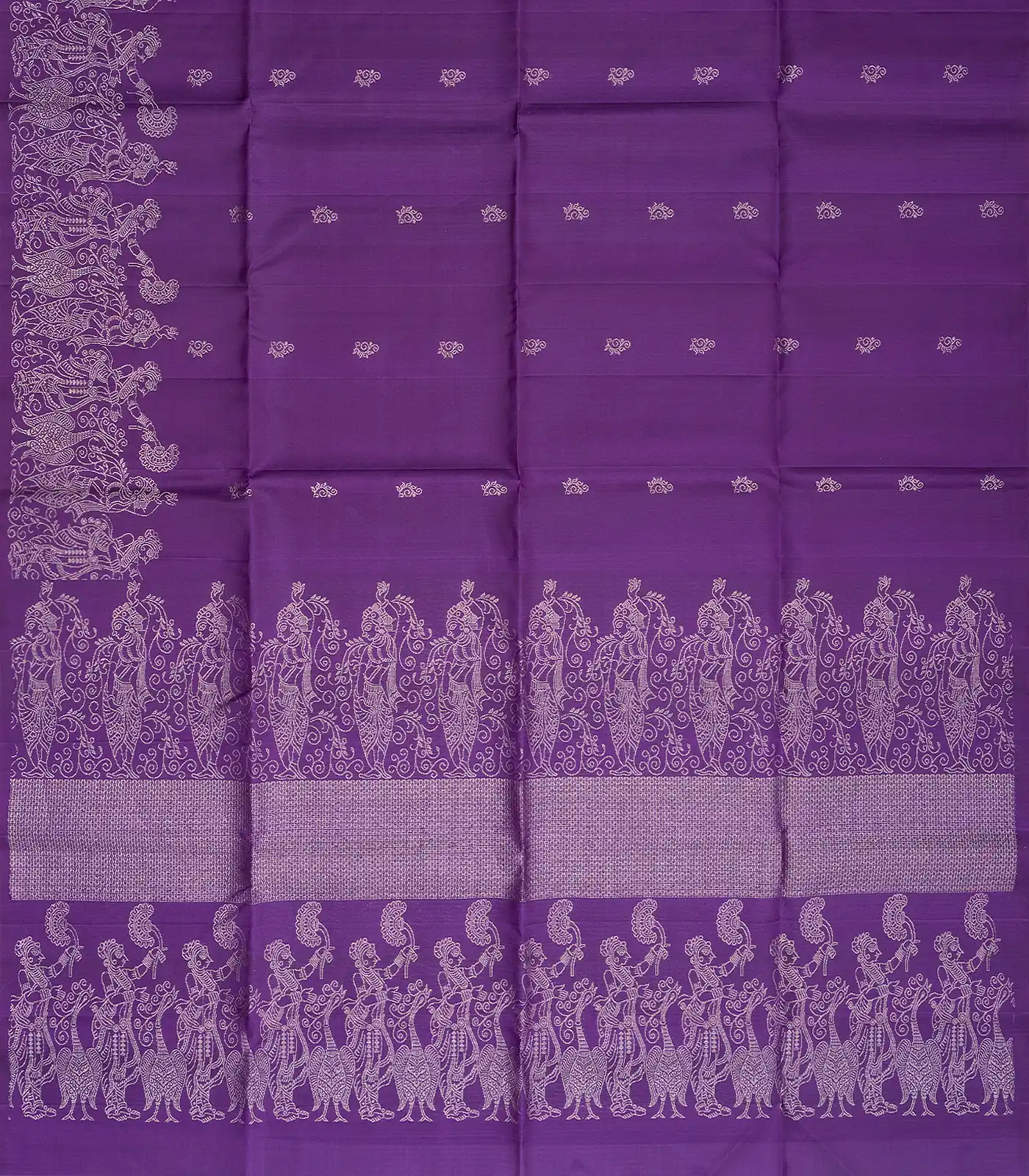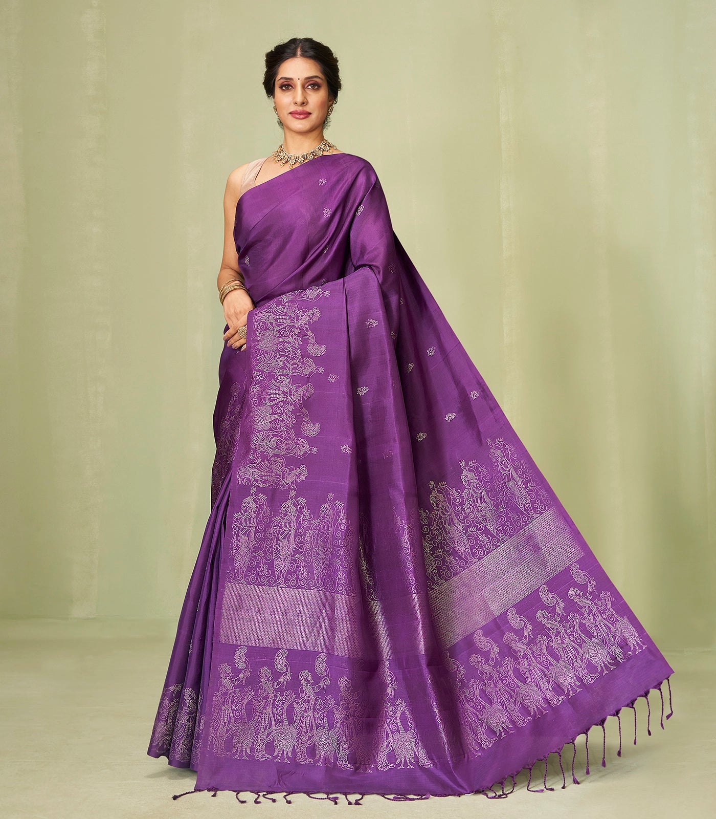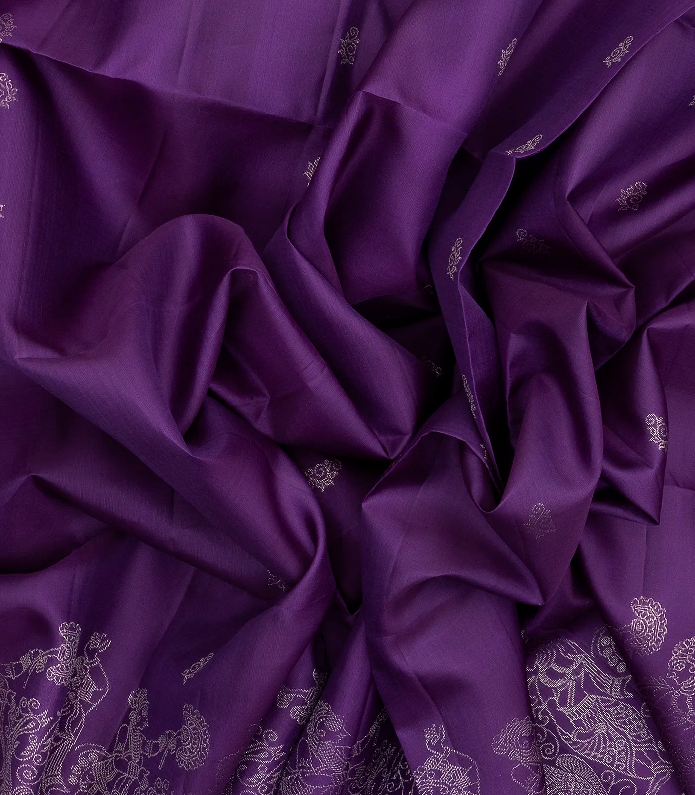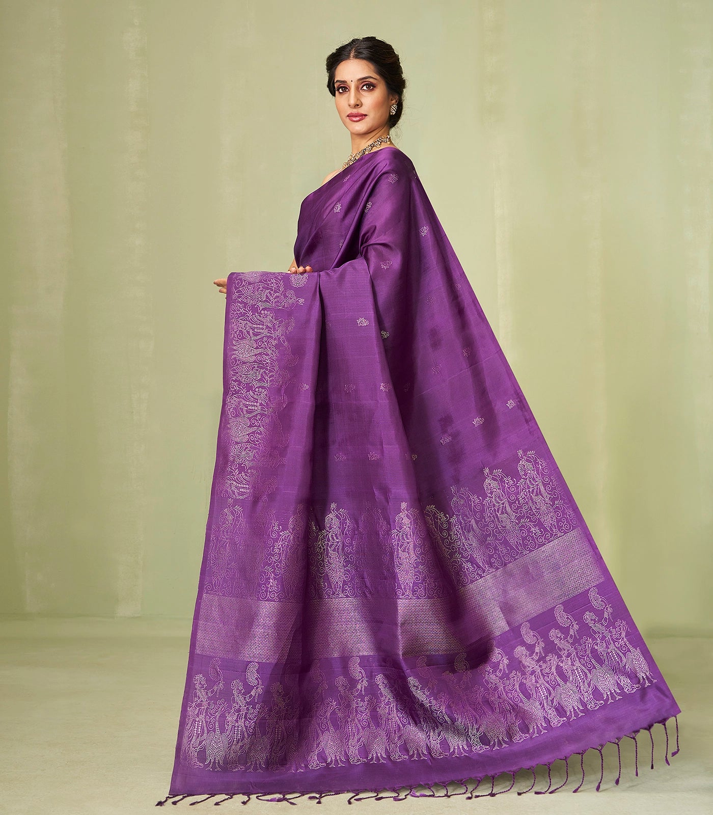This handwoven soft silk saree is filled with floral buttas in purple body along with border and pallu
