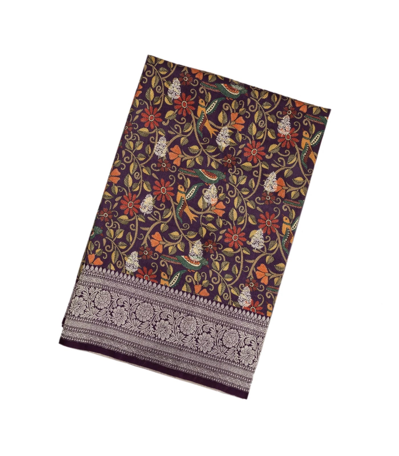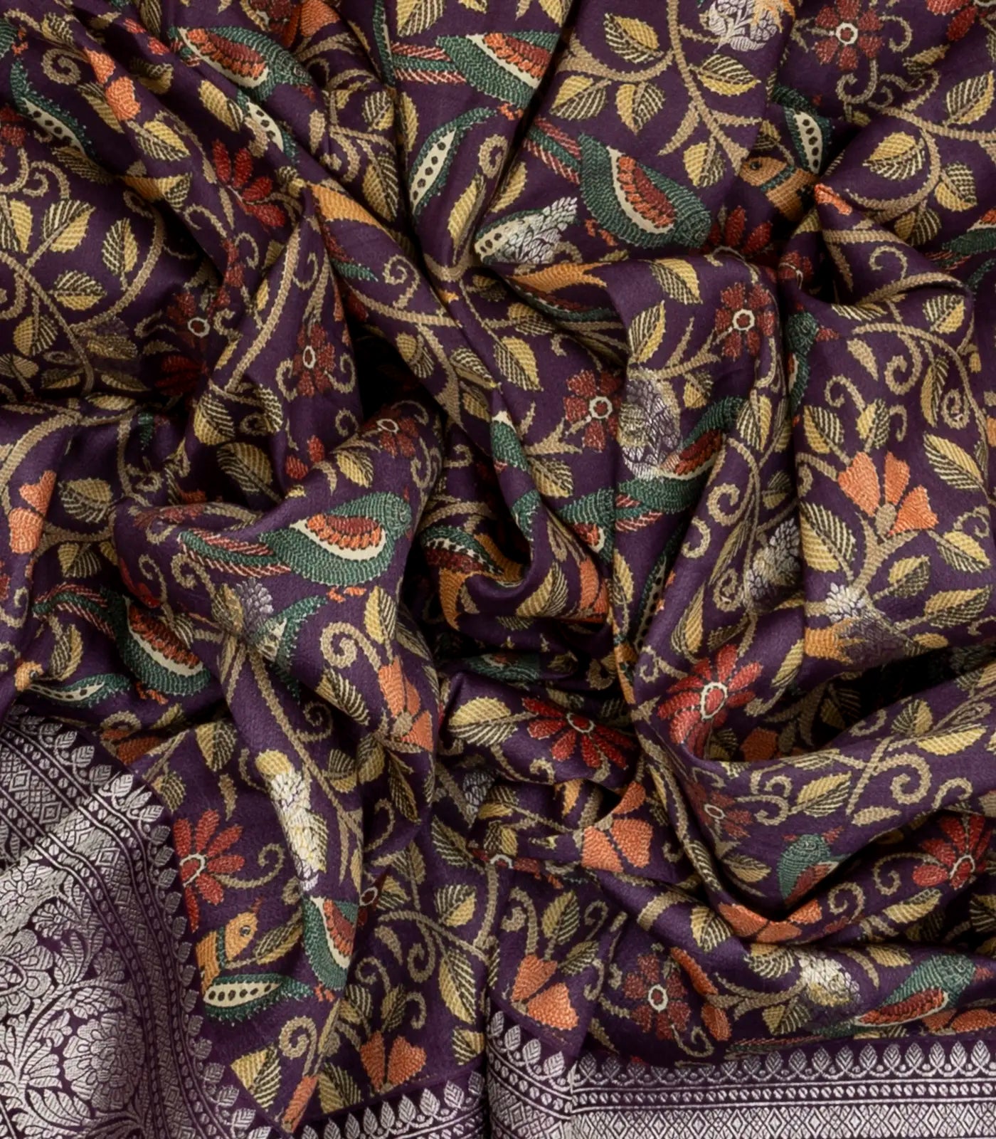 Purple Handloom Tussar Silk Saree With Bird Vine Motifs