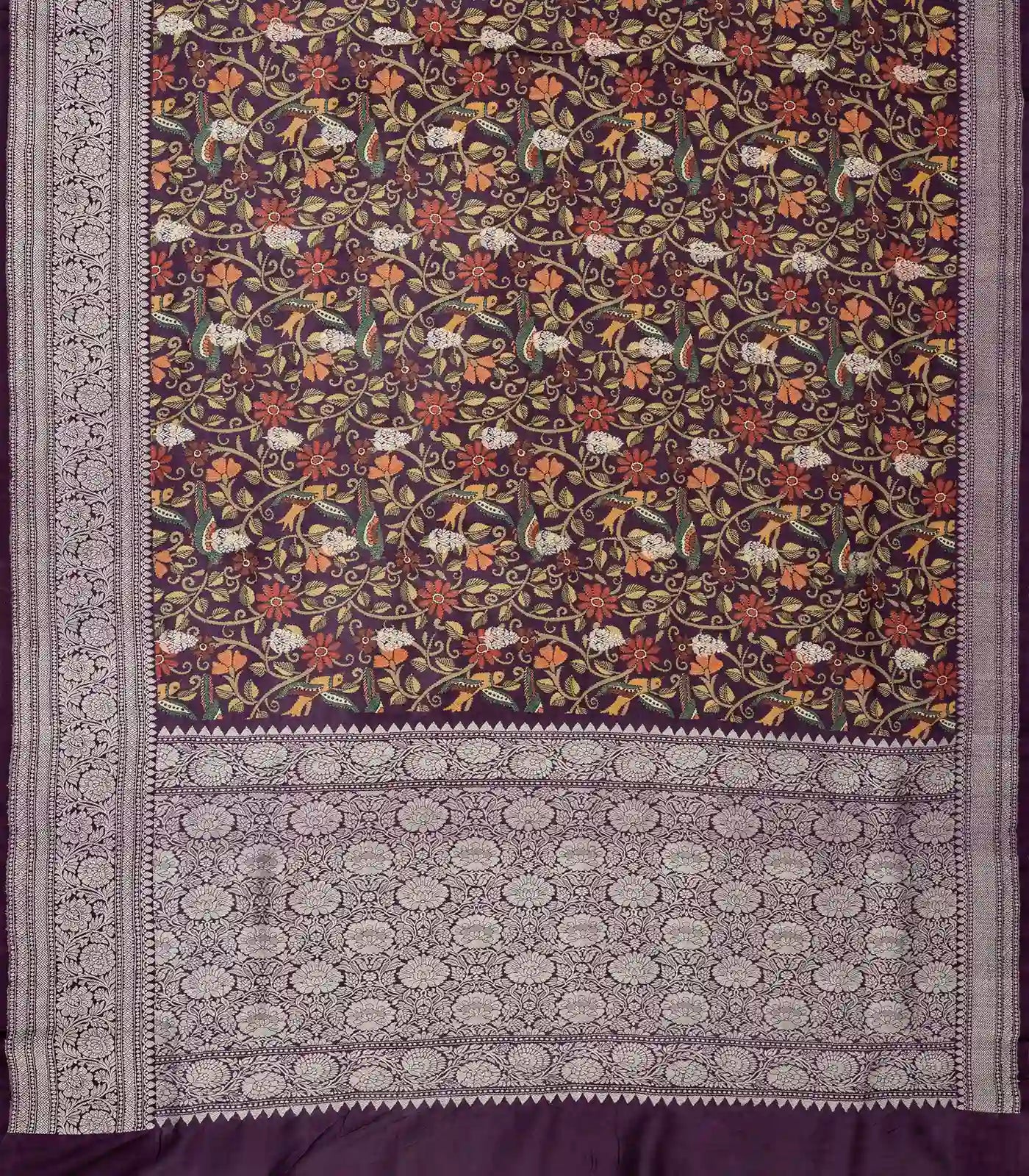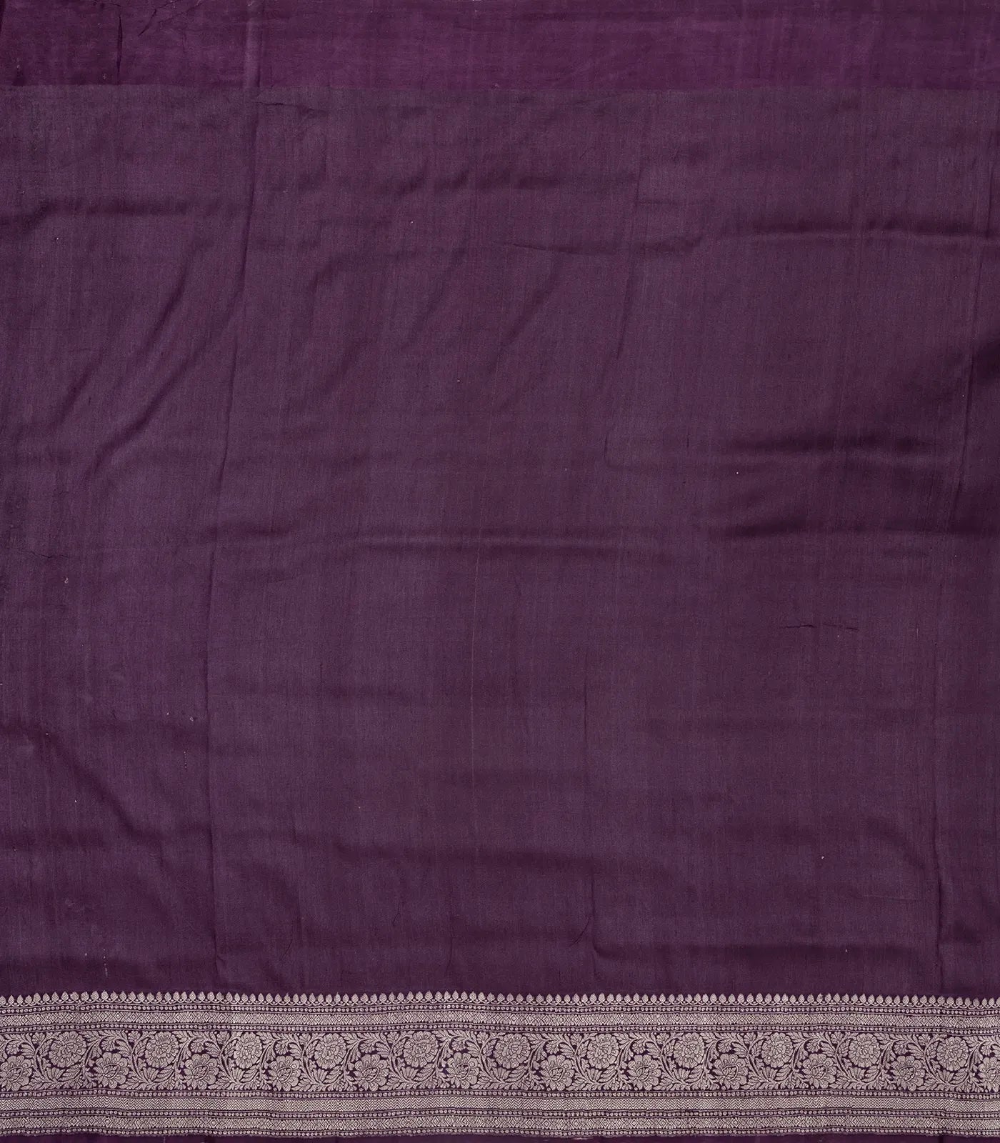 This handwoven tussar silk saree is filled with bird vine motifs in purple body along with floral motifs in border and pallu