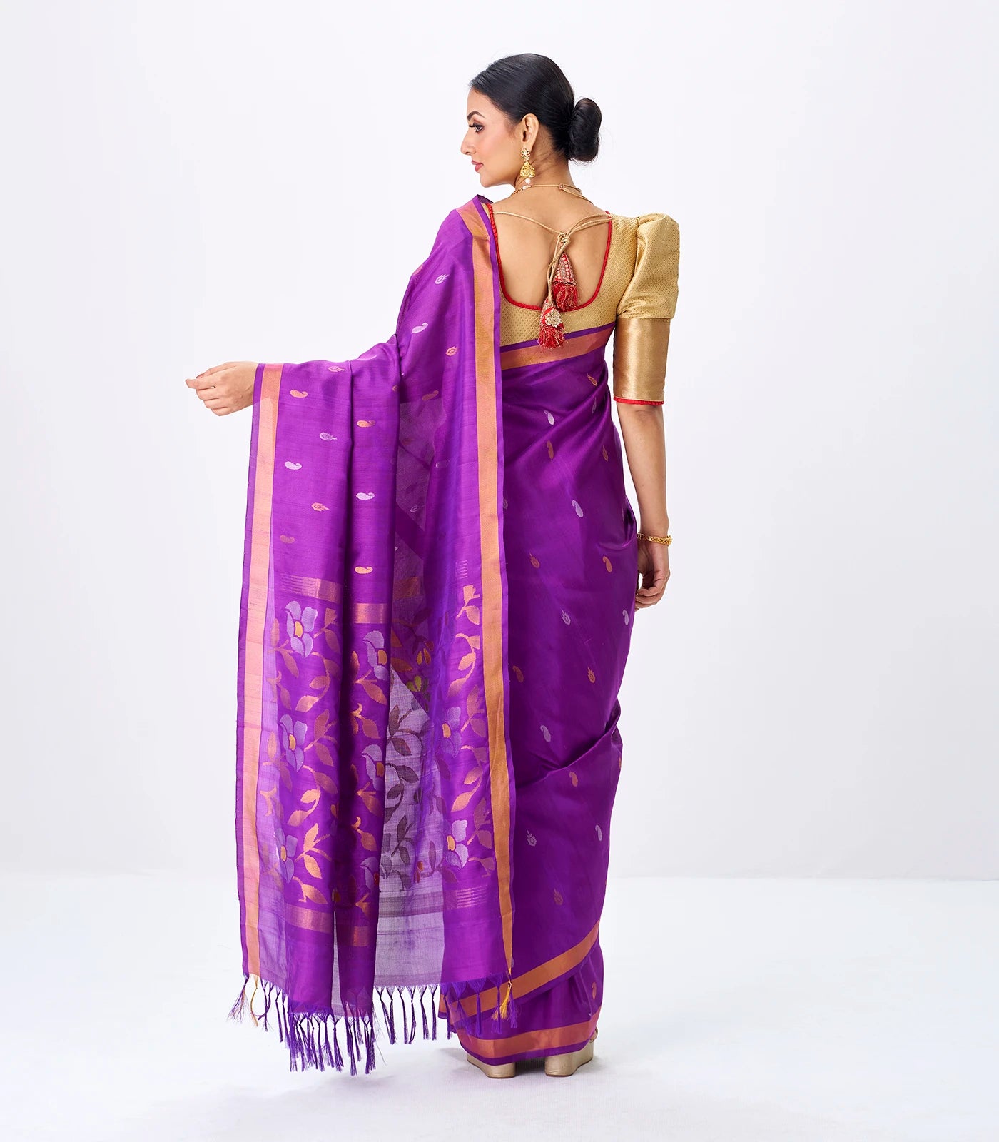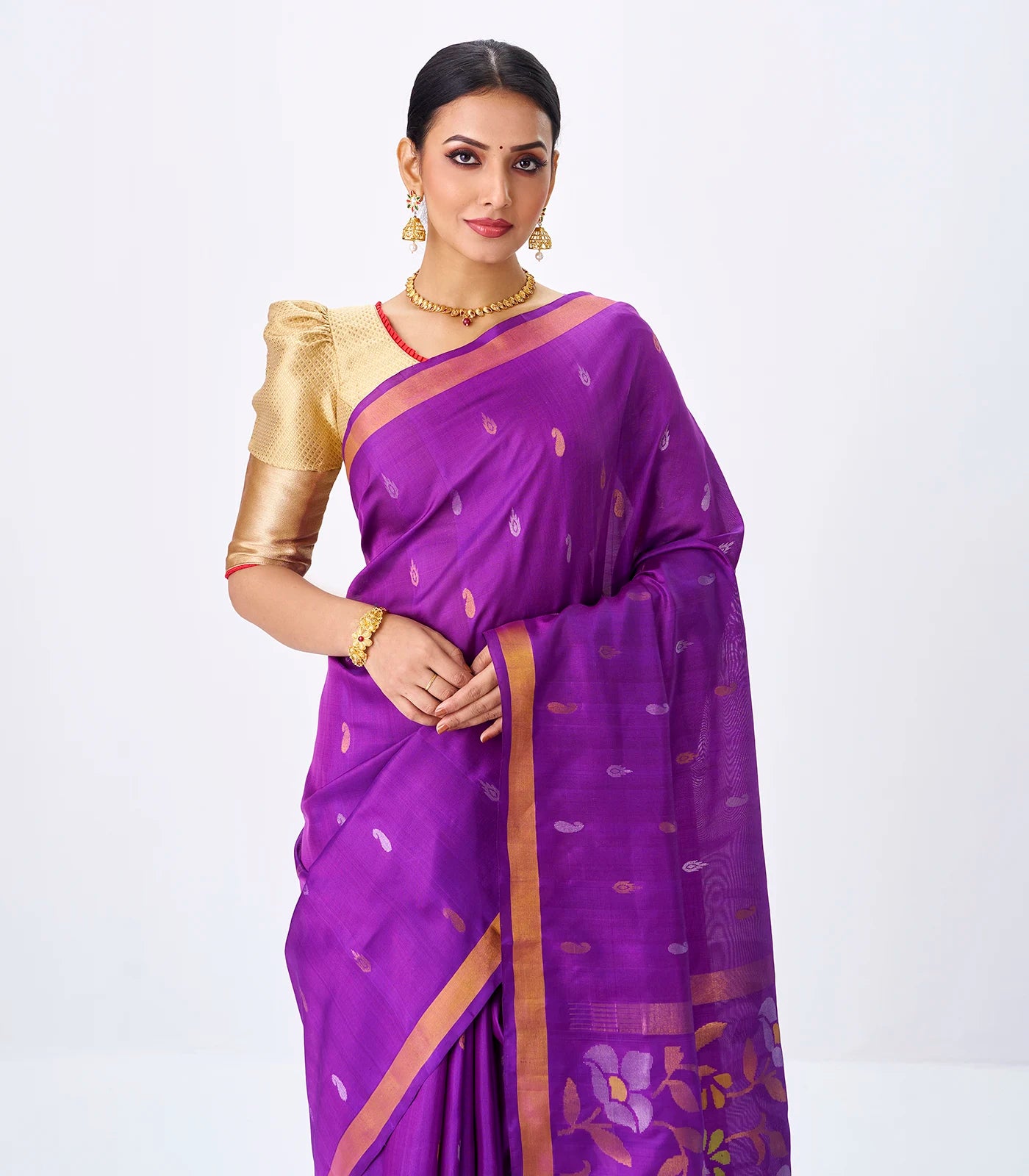 This handwoven uppada silk saree is filled with zari buttas in purple body along with zari border and floral motifs in pallu