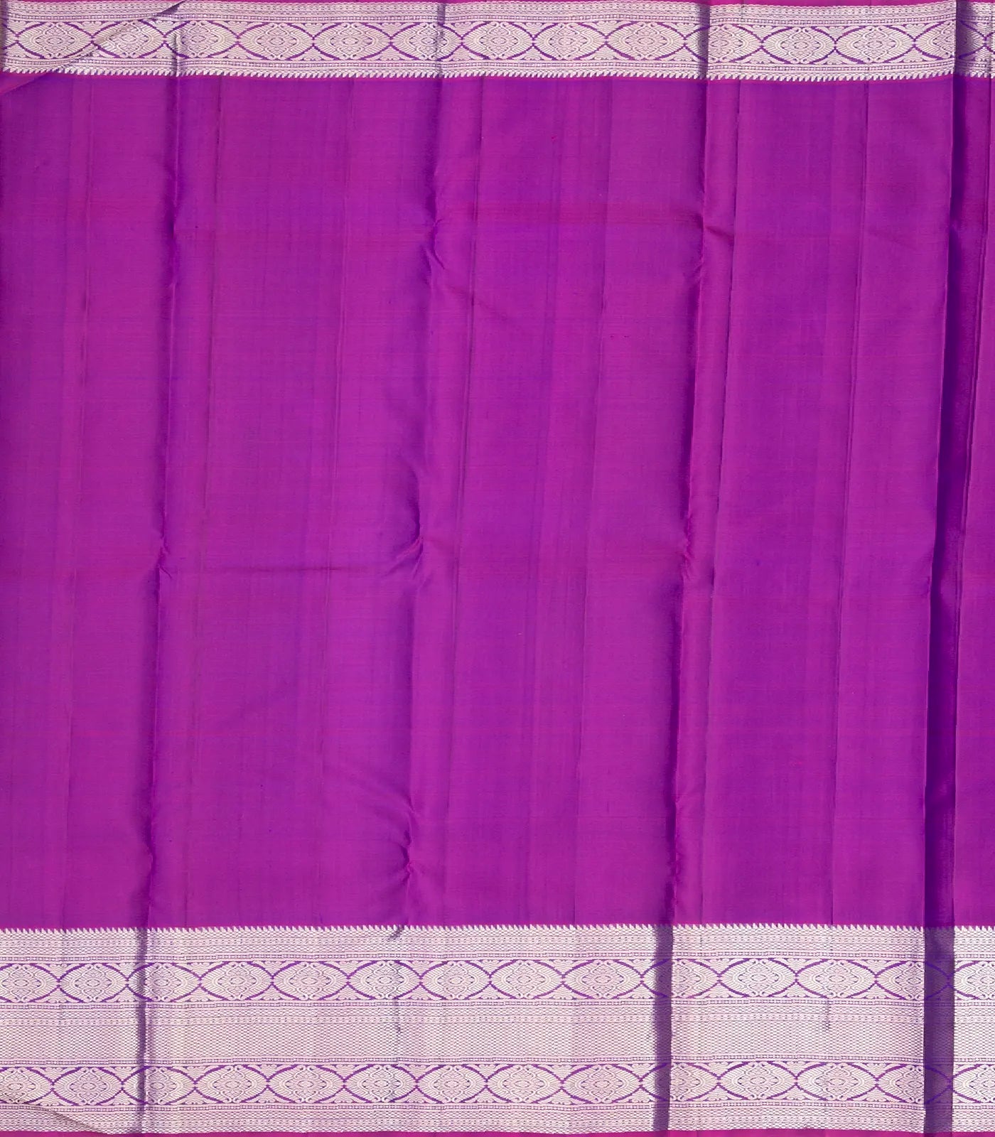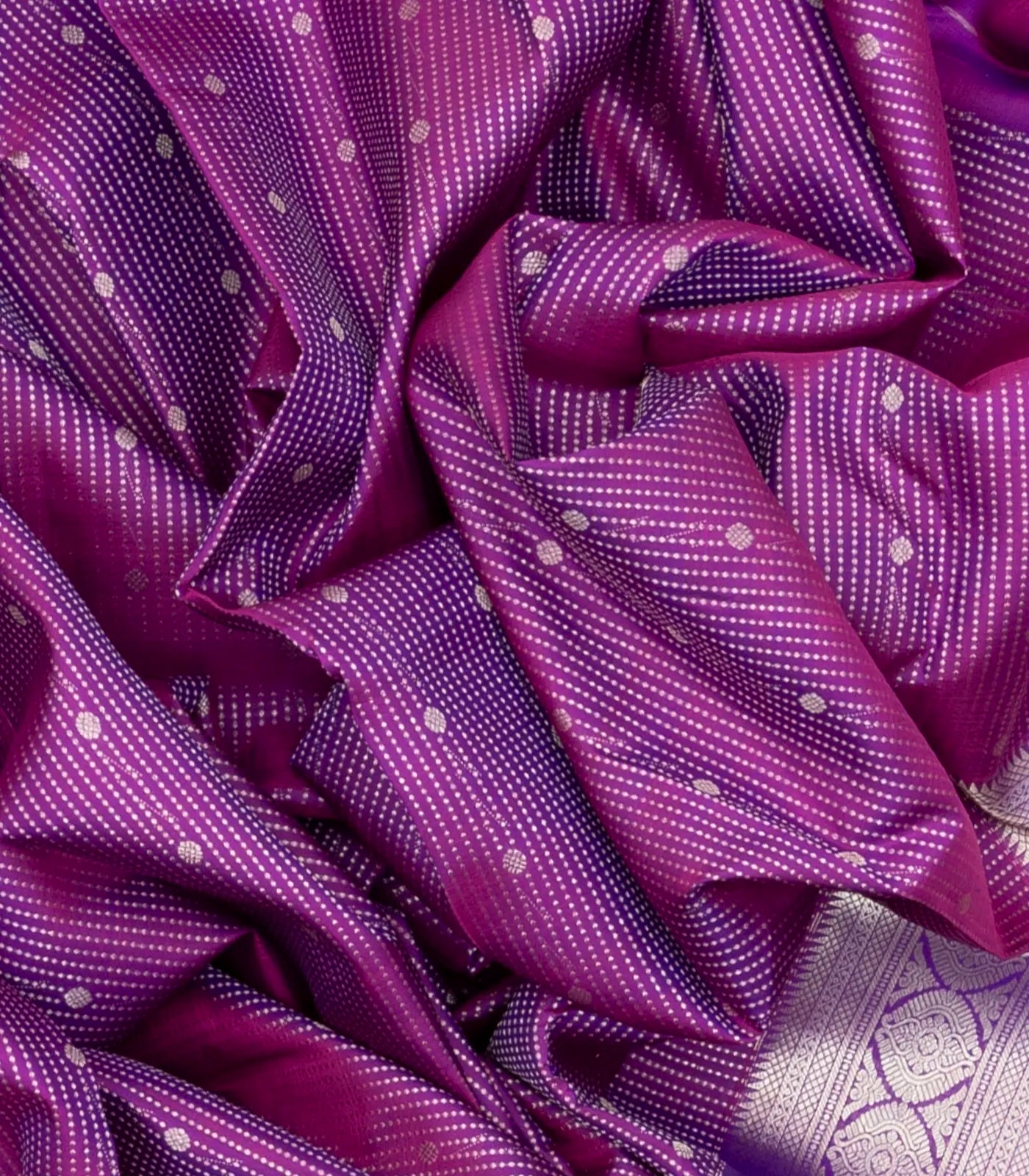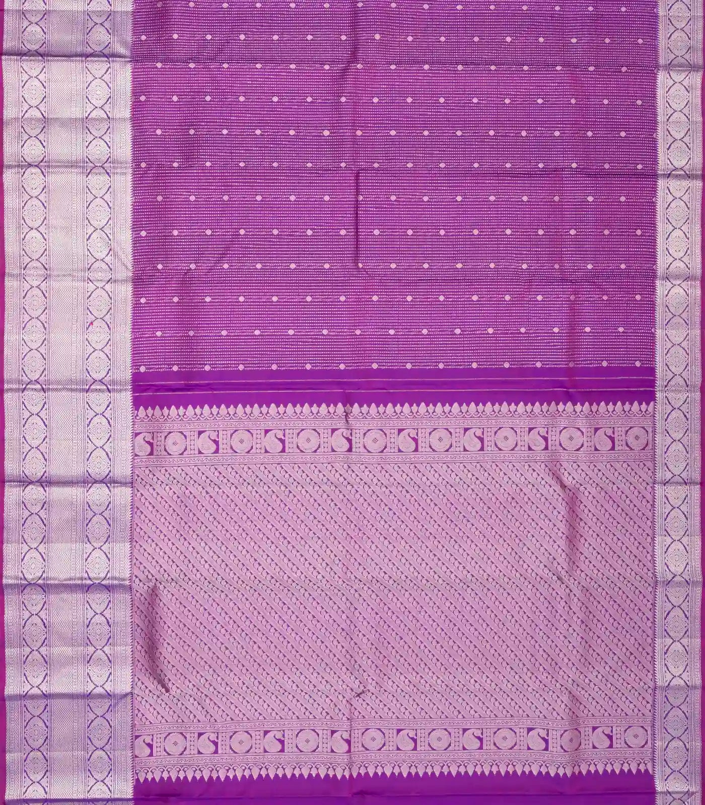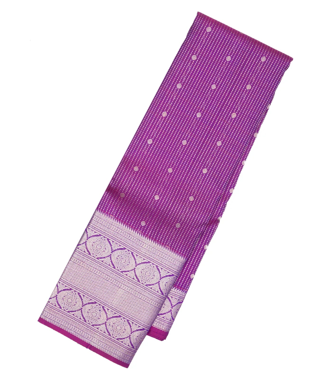 This kanchipuram silk saree is filled with dotted stripes & floral motifs in purple body along with border and pallu
