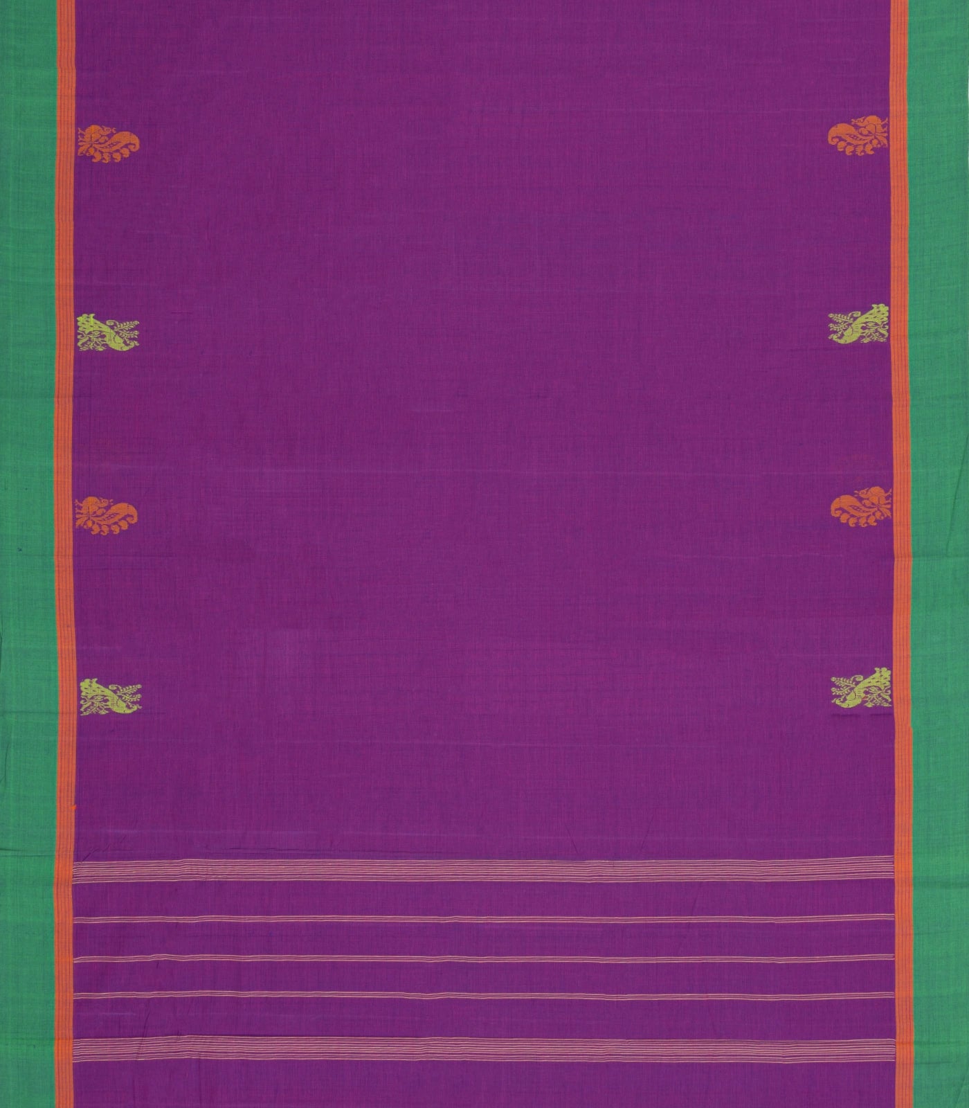 This woven chettinad cotton saree is filled with buttas in purple body along with contrast border and pallu-CN1871