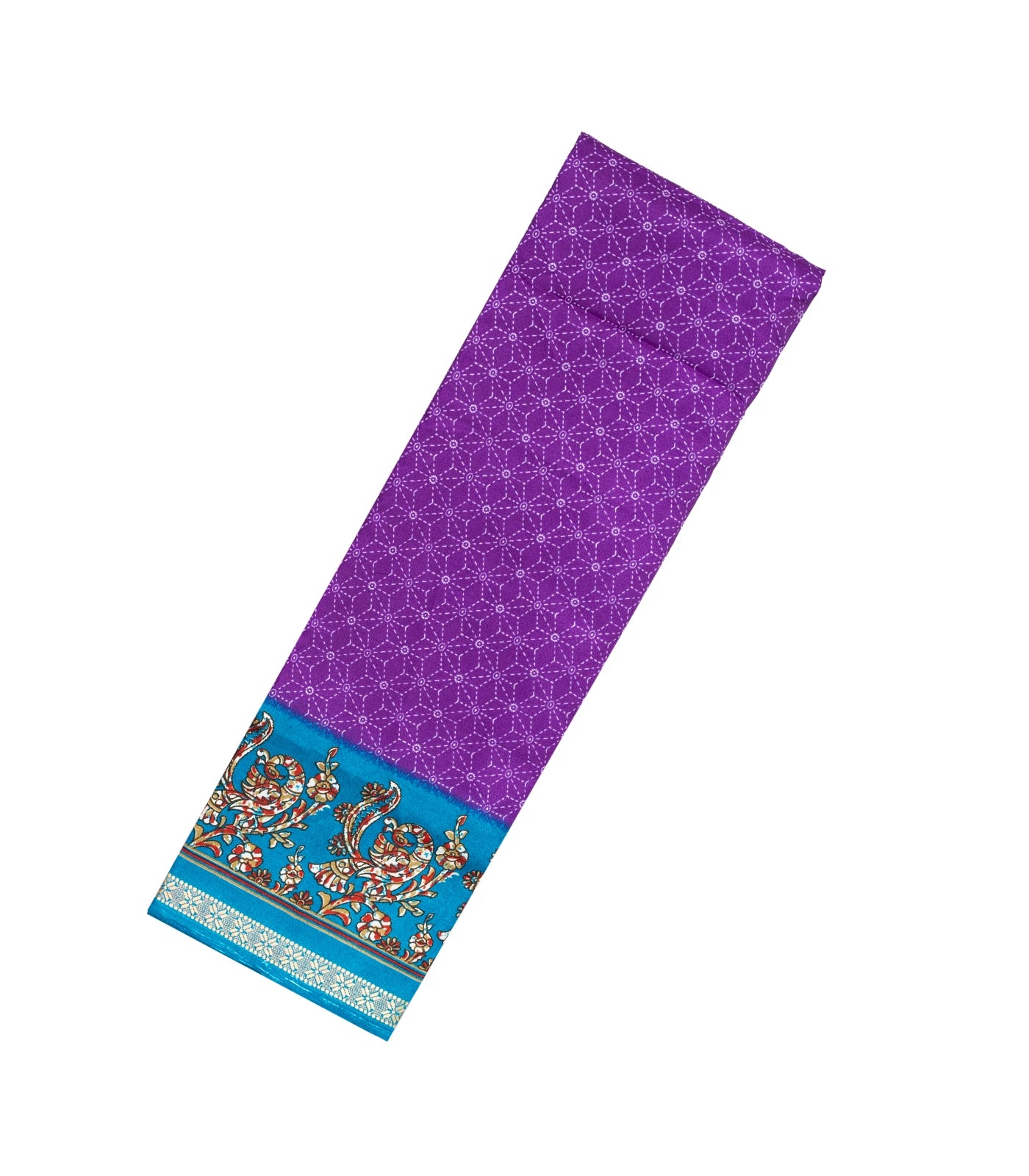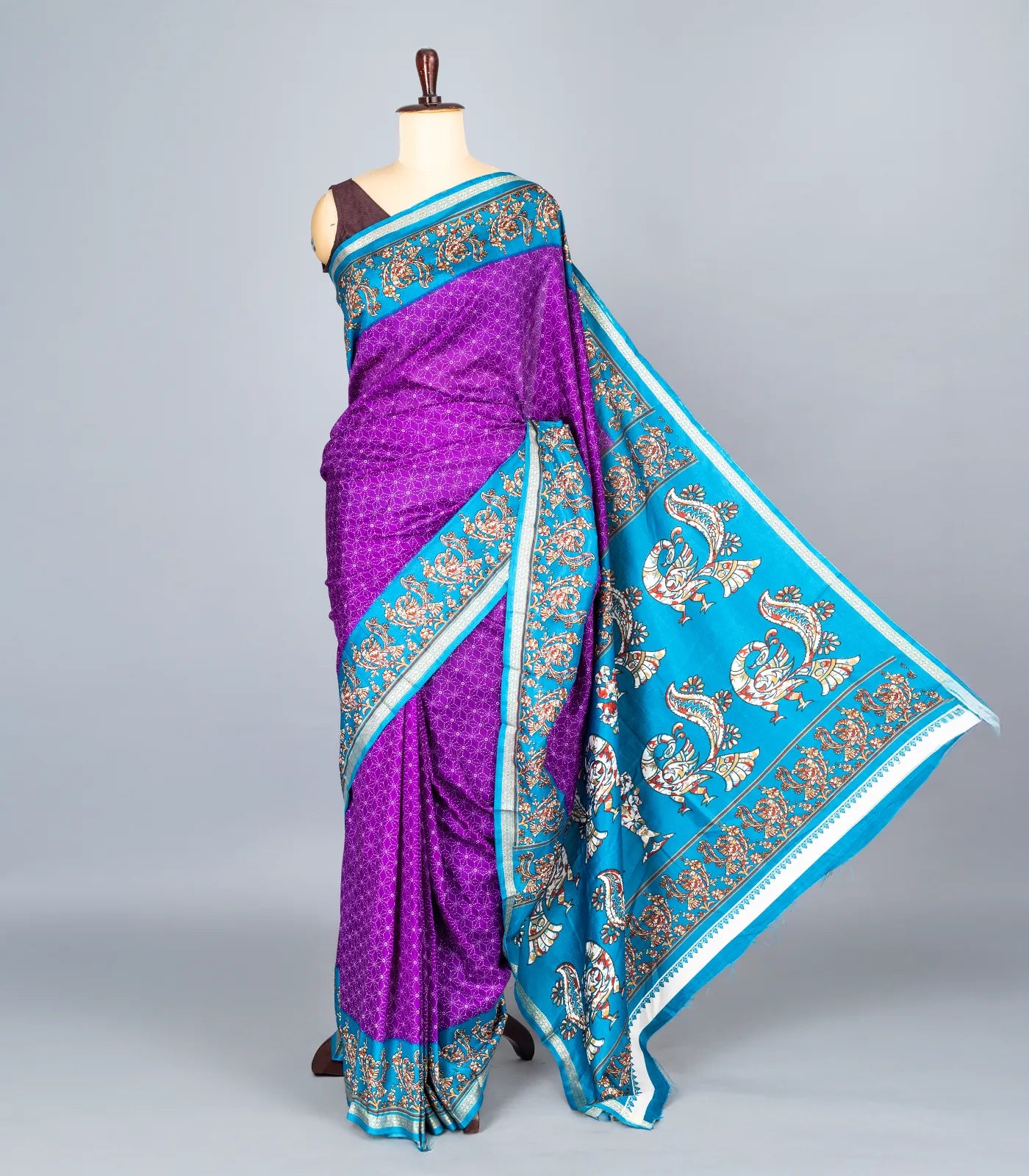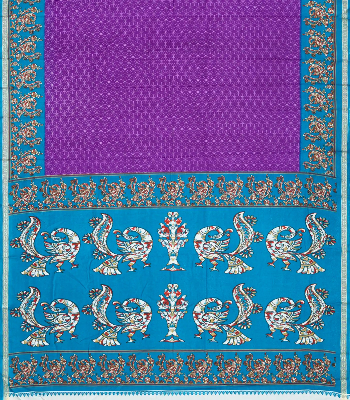 This woven synthetic crackle saree is filled with printed geometric & bird motifs in purple body along with contrast border and pallu