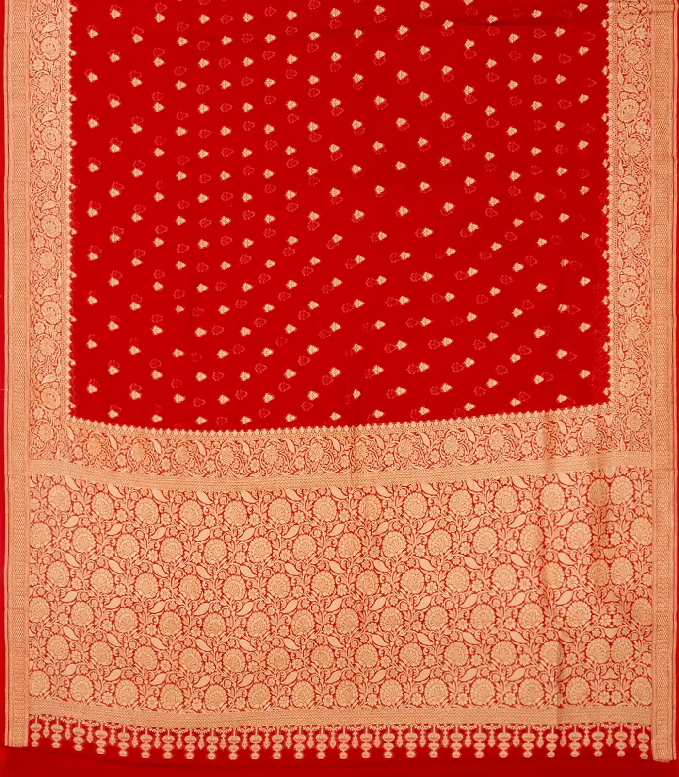 This handwoven banarasi khaddi georgette silk saree filled with floral buttas in red body along with border and pallu