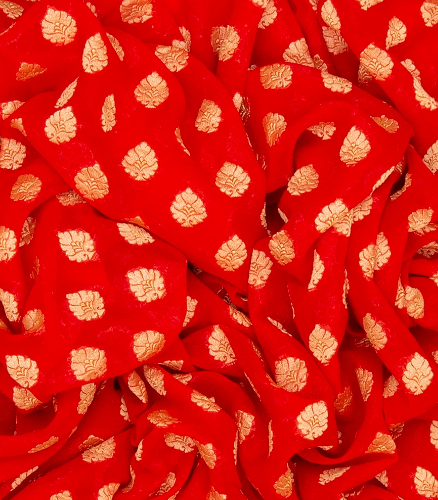 Red Handloom Banarasi Khaddi Georgette Saree With Floral Motifs & Green Border-Red