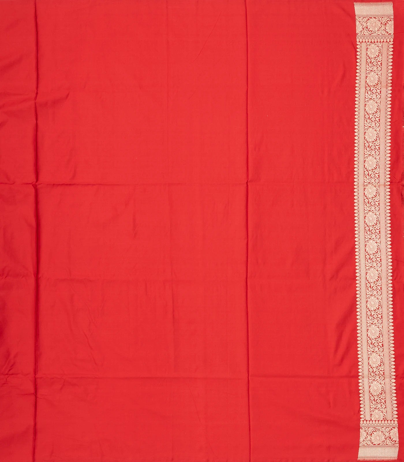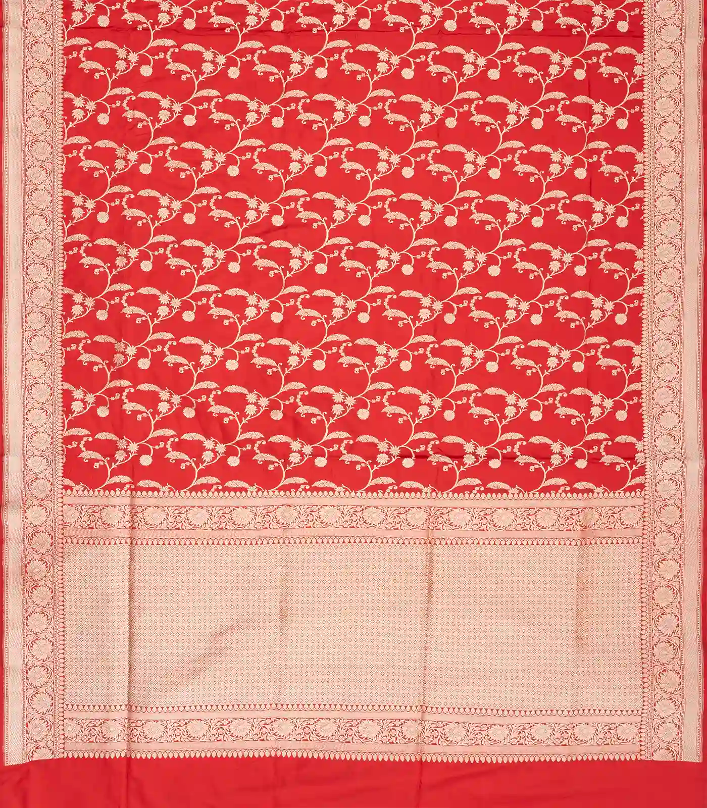 This handwoven banarasi silk saree is filled with floral vine motifs in red body along with border and pallu