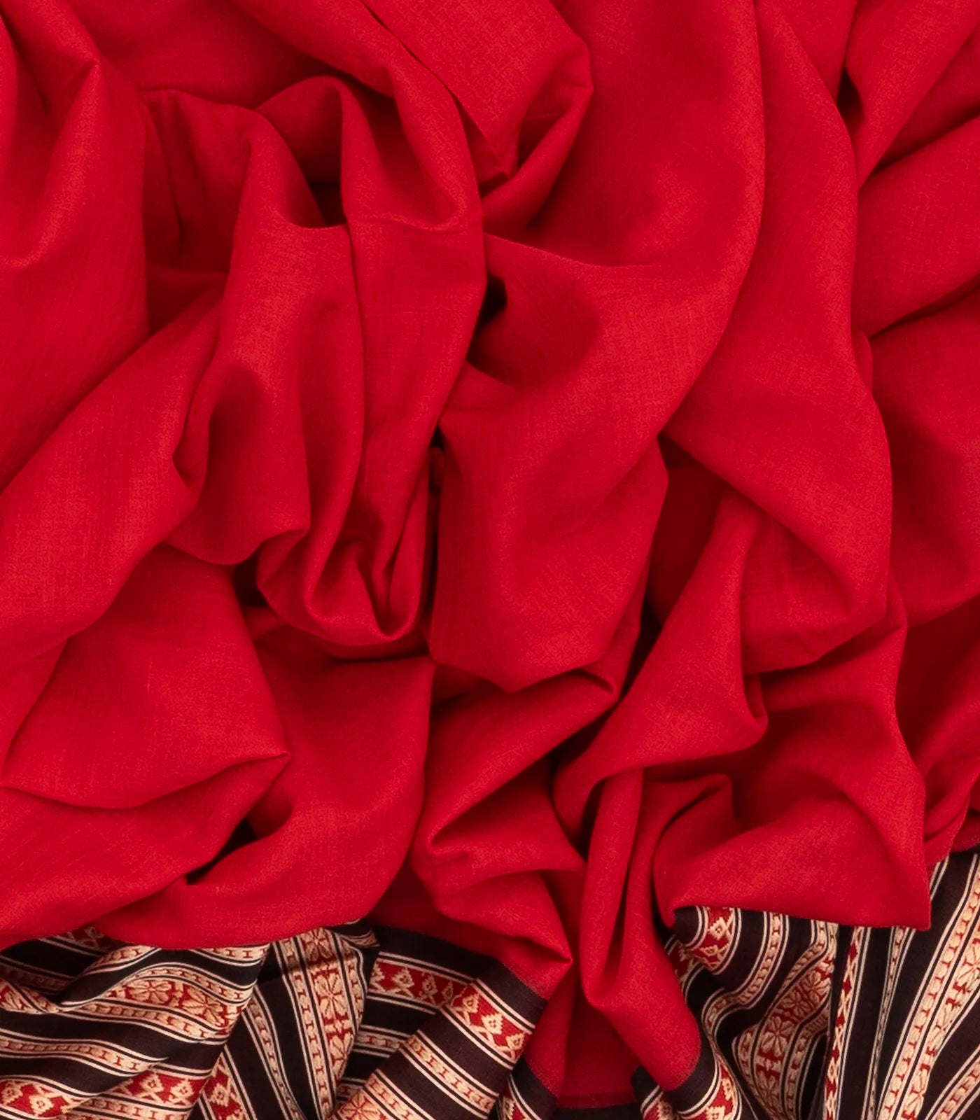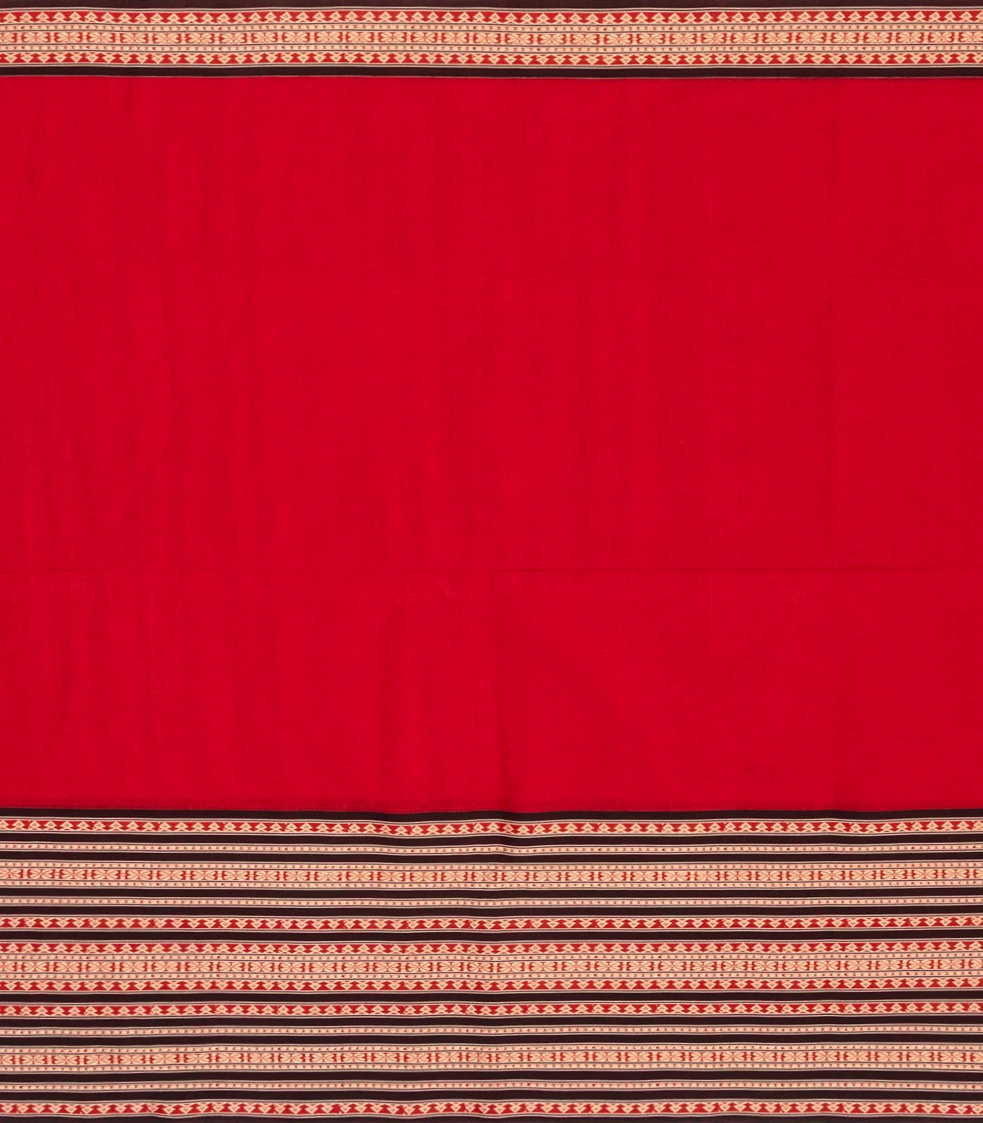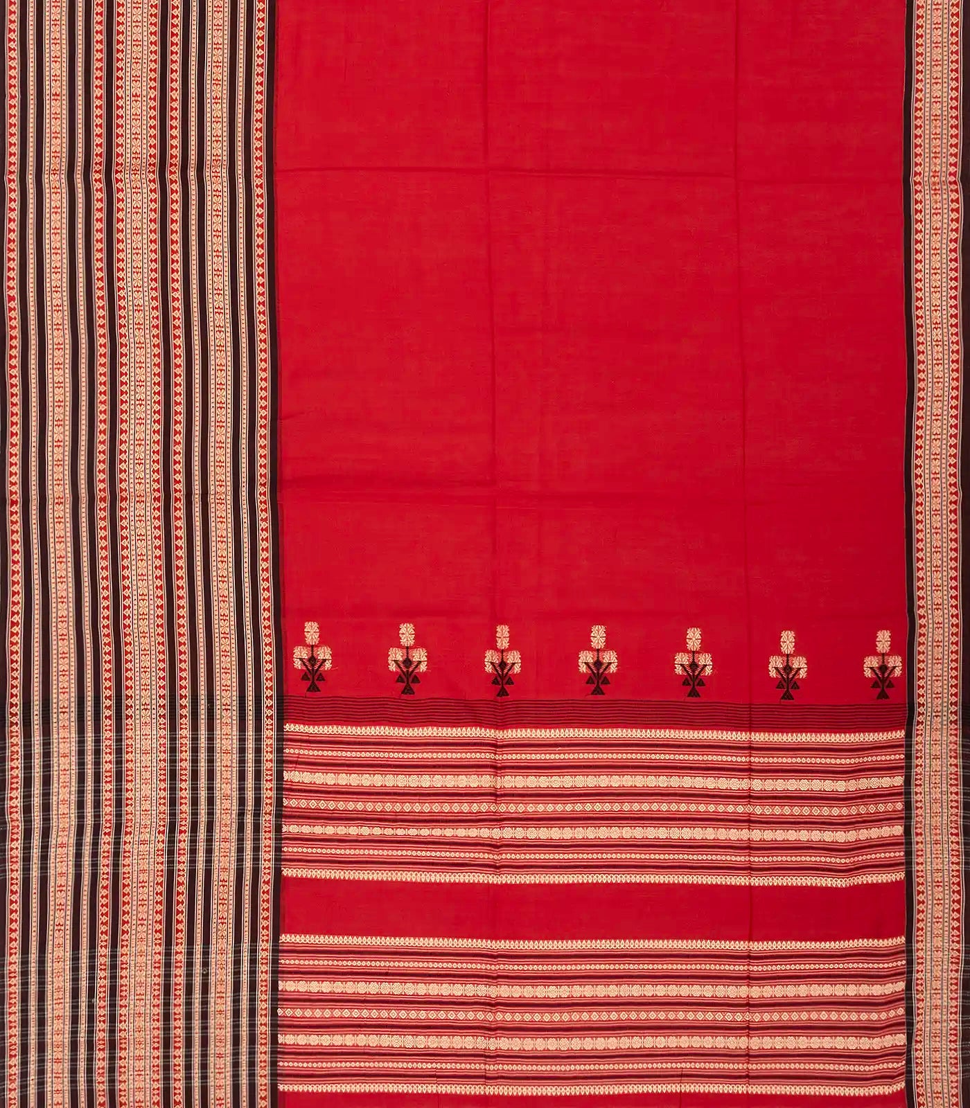 This handwoven bengal cotton saree is filled with plain red body along with contrast black border and pallu