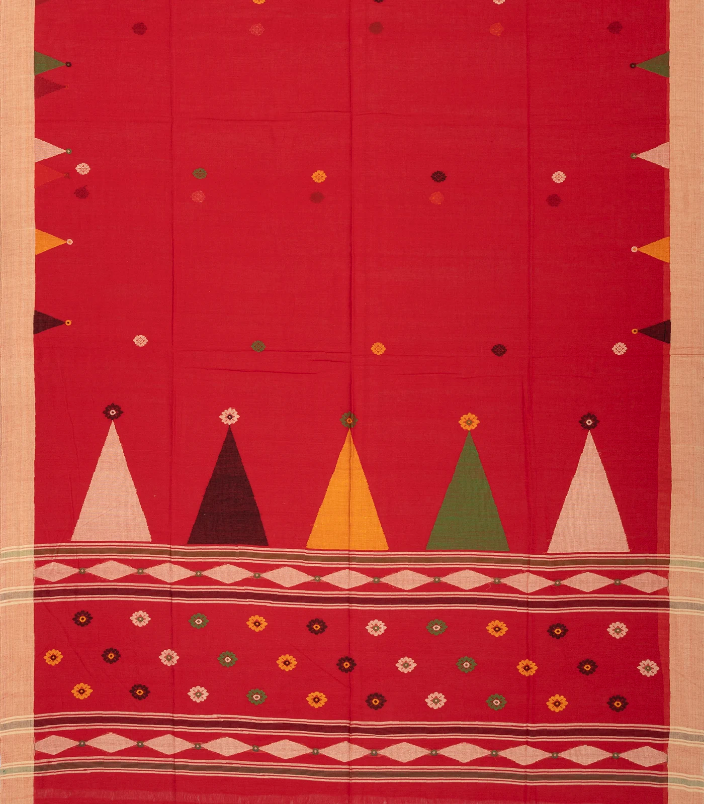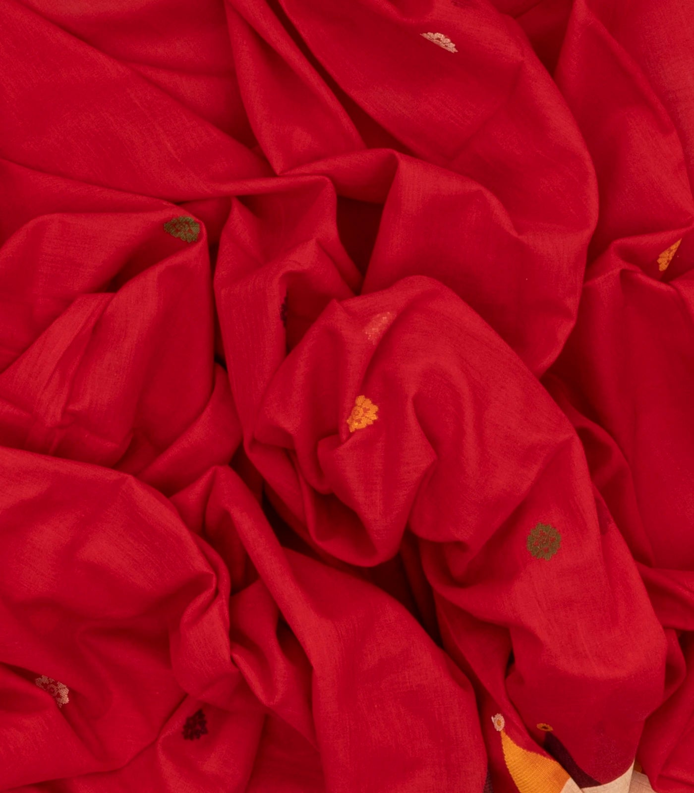 This handwoven bengal cotton saree is filled with plain red body along with contrast temple border and pallu