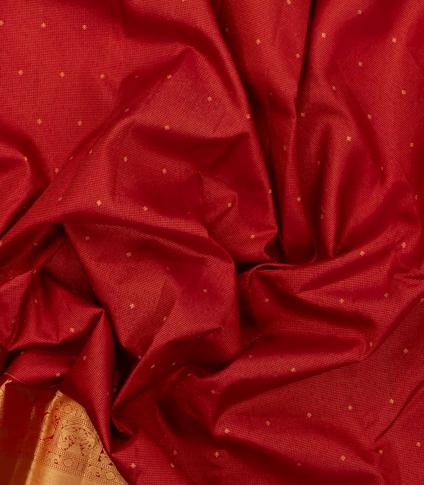 This handwoven kanchipuram silk saree is filled with dotted stripes in red body along with zari border and pallu