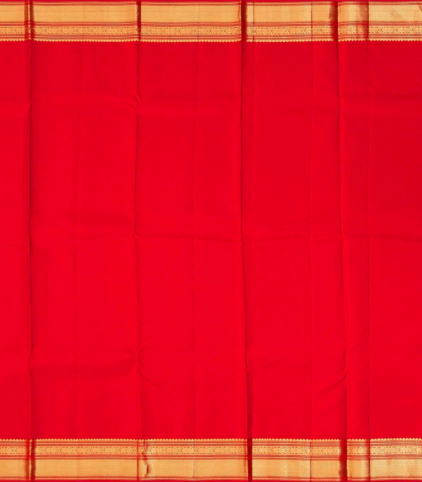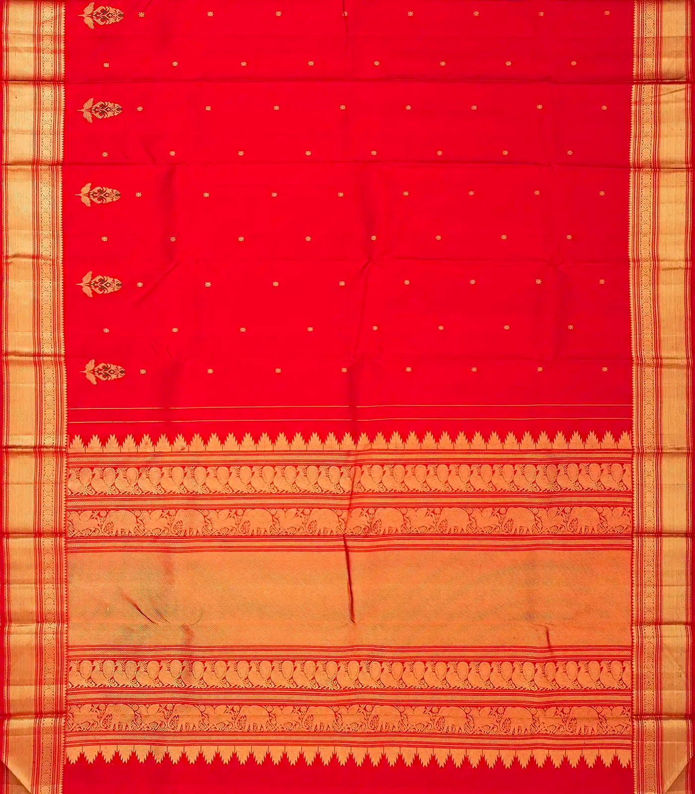 This handwoven kanchipuram silk saree is filled with floral buttas in red body along with border and pallu