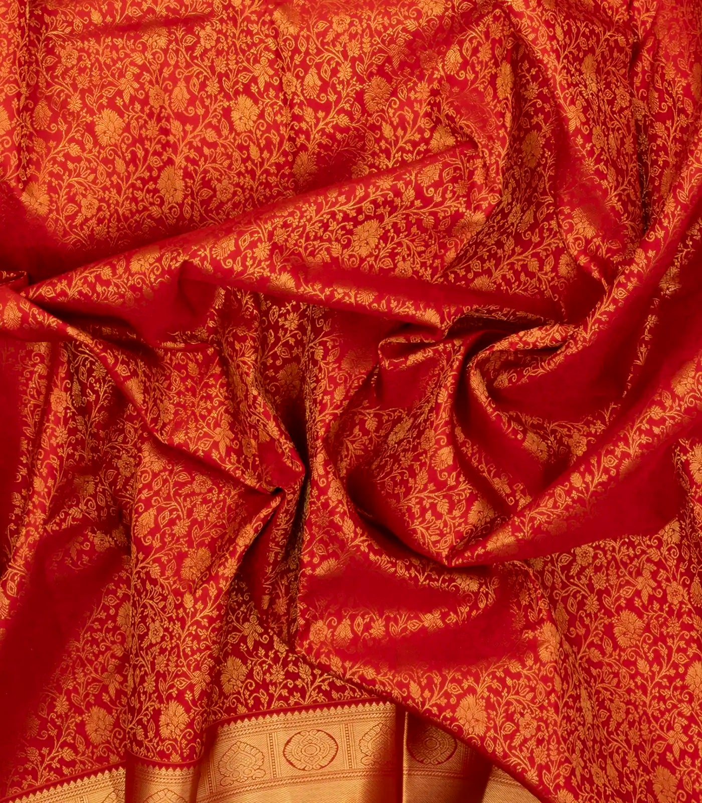 This handwoven kanchipuram silk saree is filled with floral vine motifs in red body along with zari border and pallu