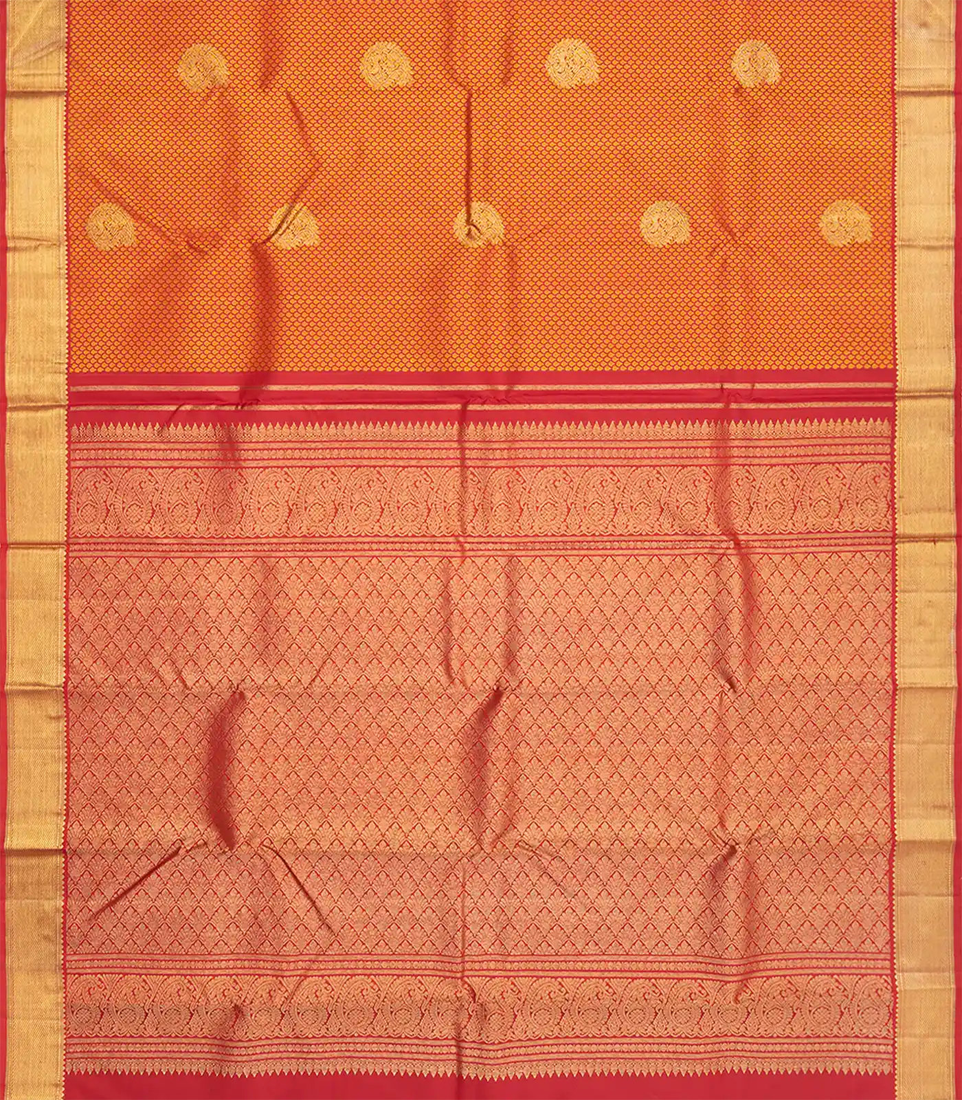 Red Handloom Kanchipuram Silk Saree With Mango Zari Buttas-Red