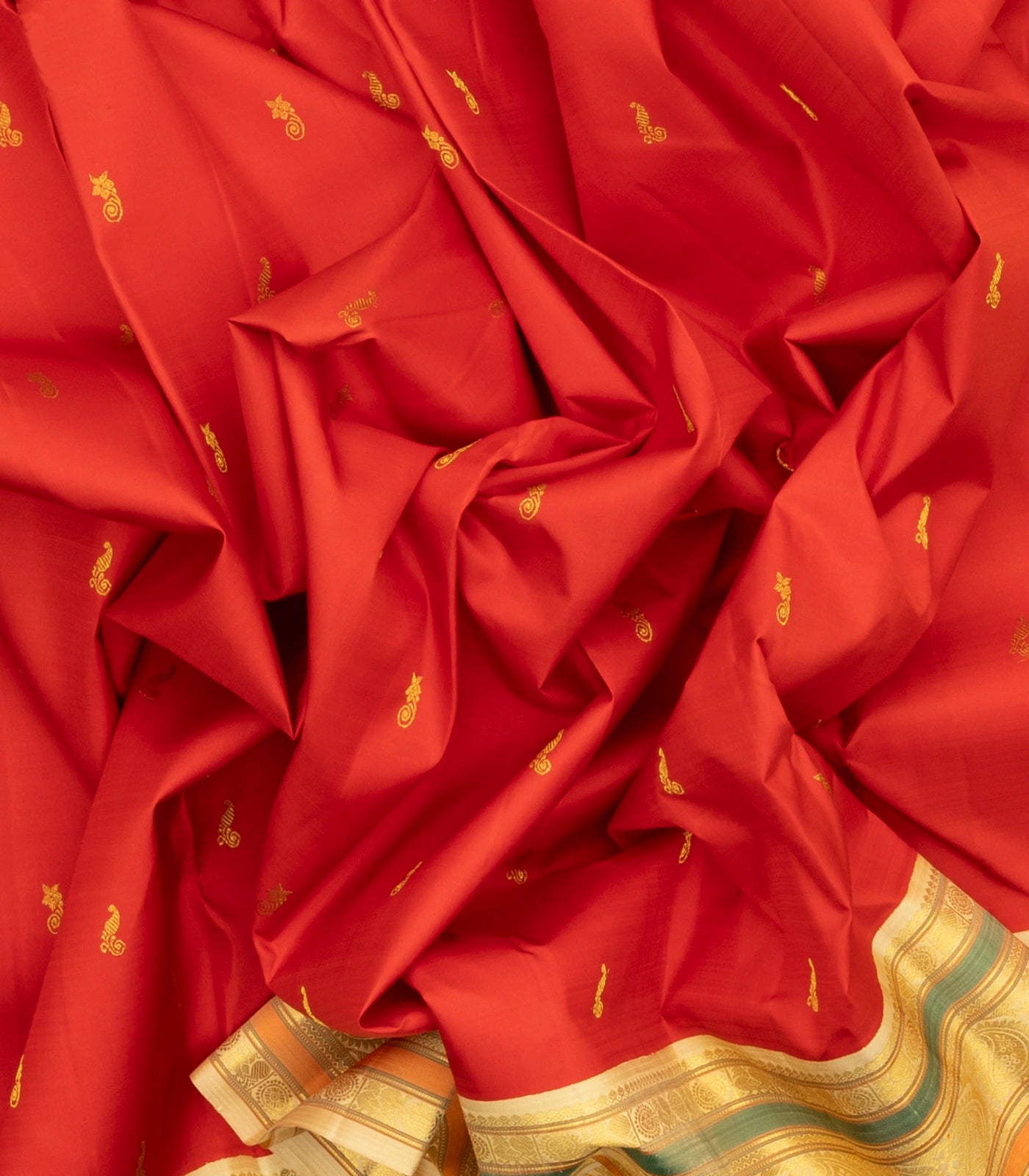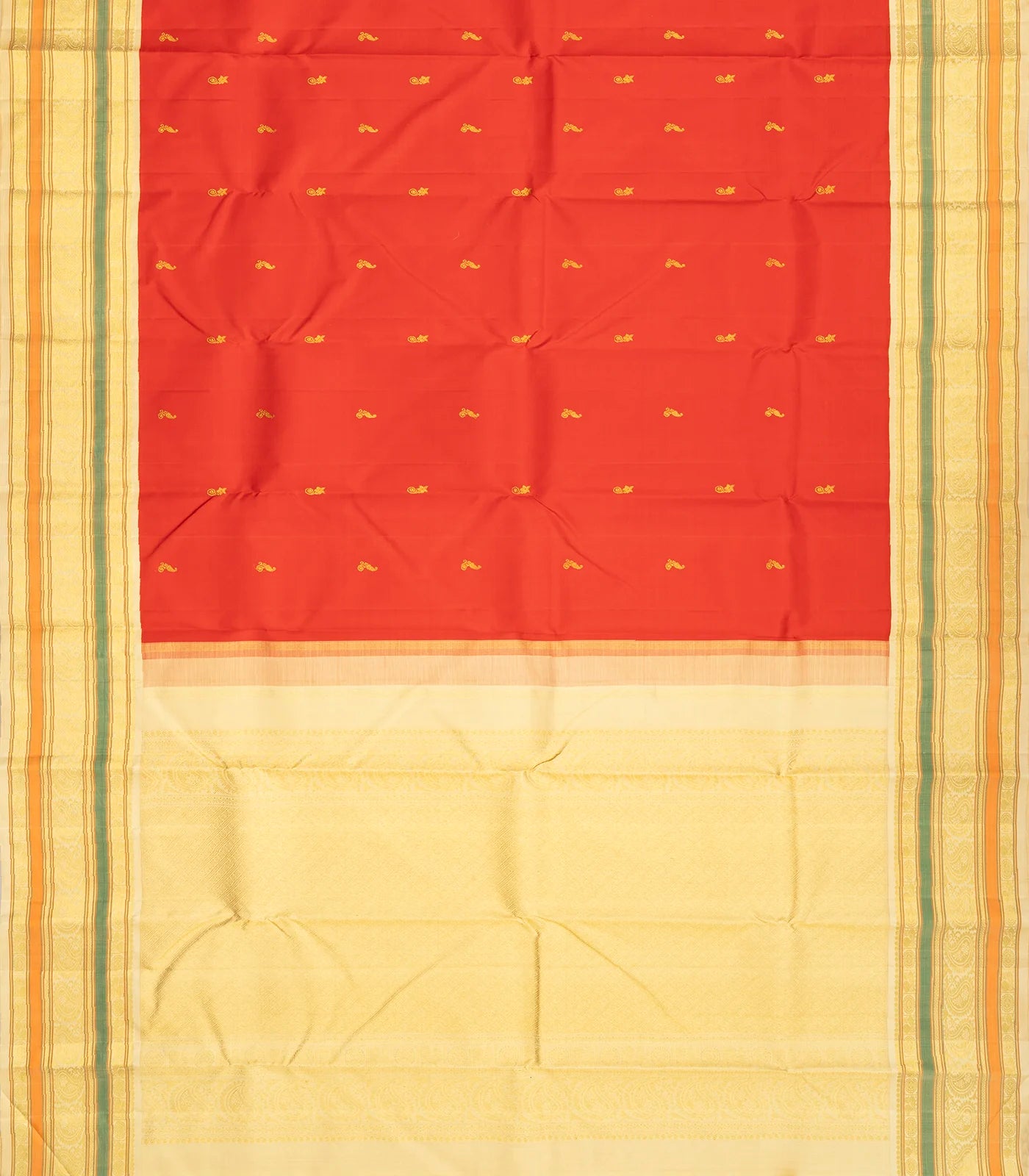 This handwoven korvai kanchipuram silk saree is filled with buttas in red body along with contrast border and pallu