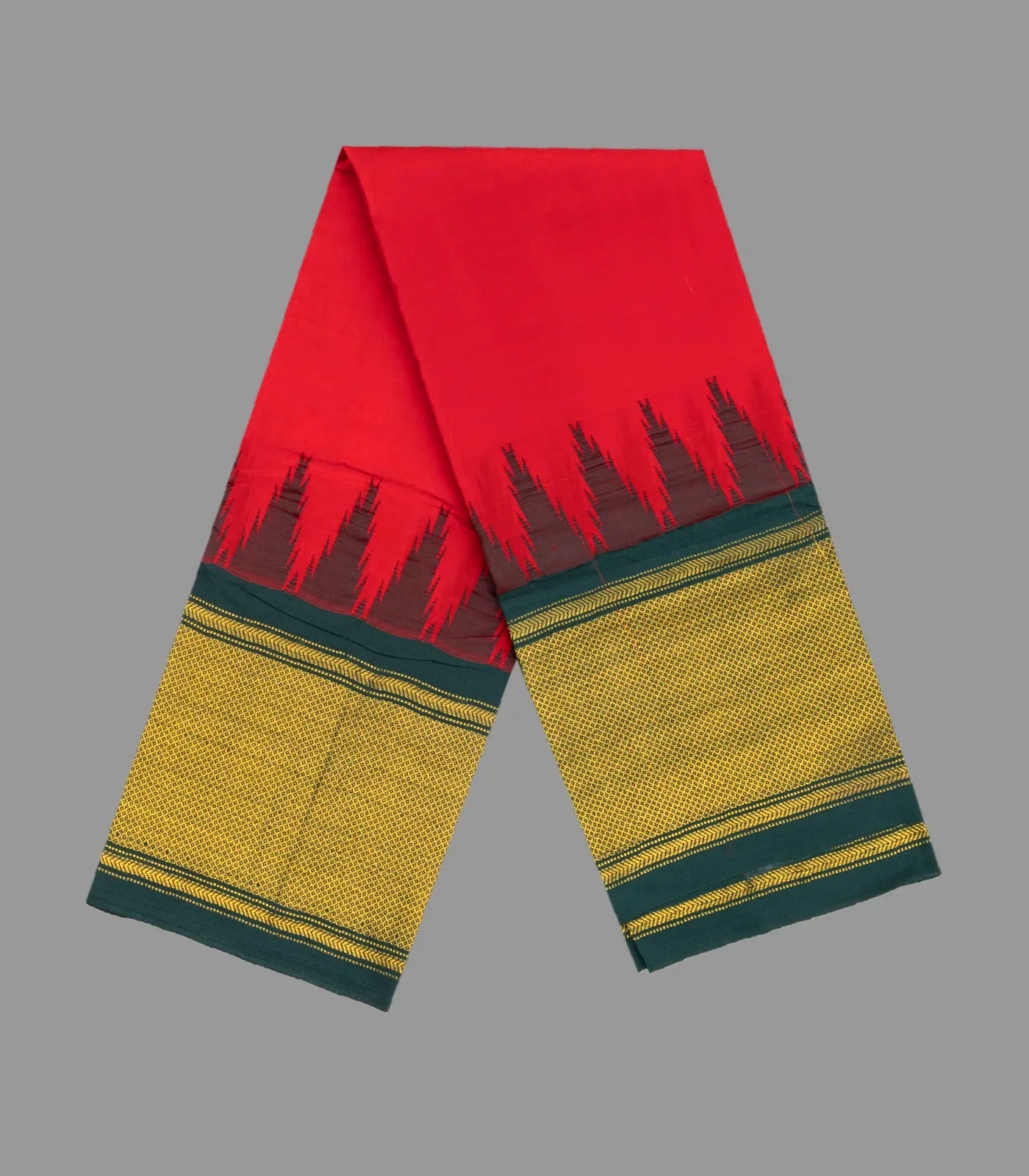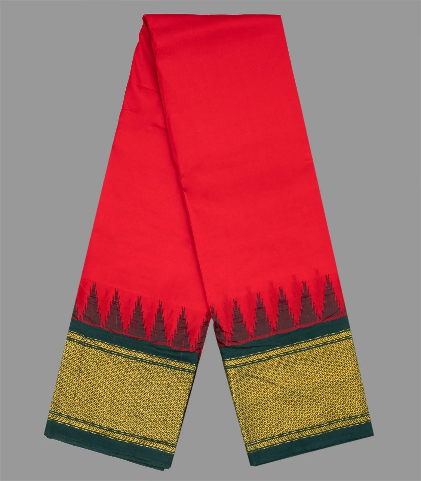 Red Handloom Korvai Swami Silk Vasthiram With Green Thazampoo Rekku Border 24 x 12