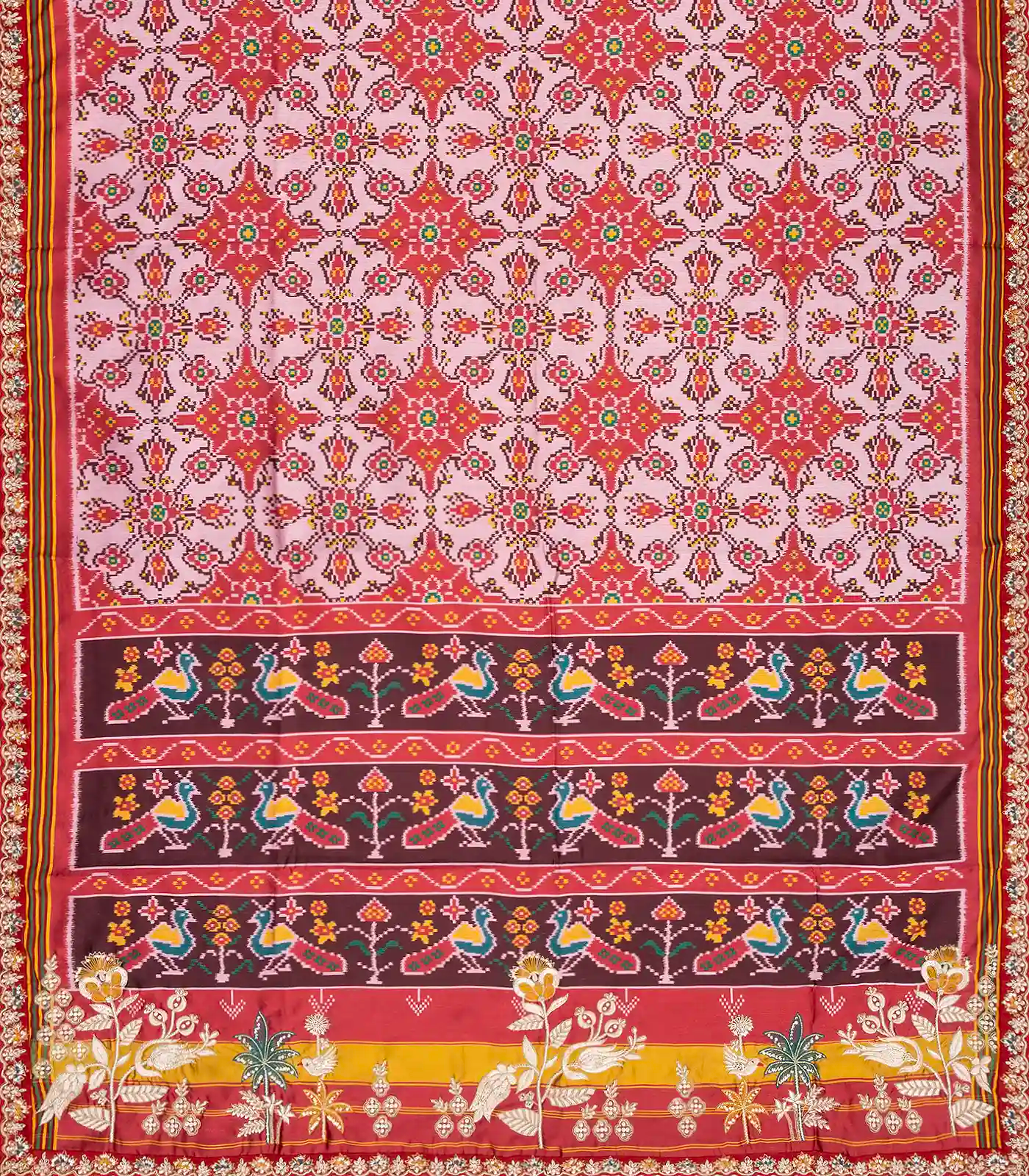 This woven blended silk saree is filled with ikat motifs in baby pink body along with border and pallu with hand embroidered selvedge