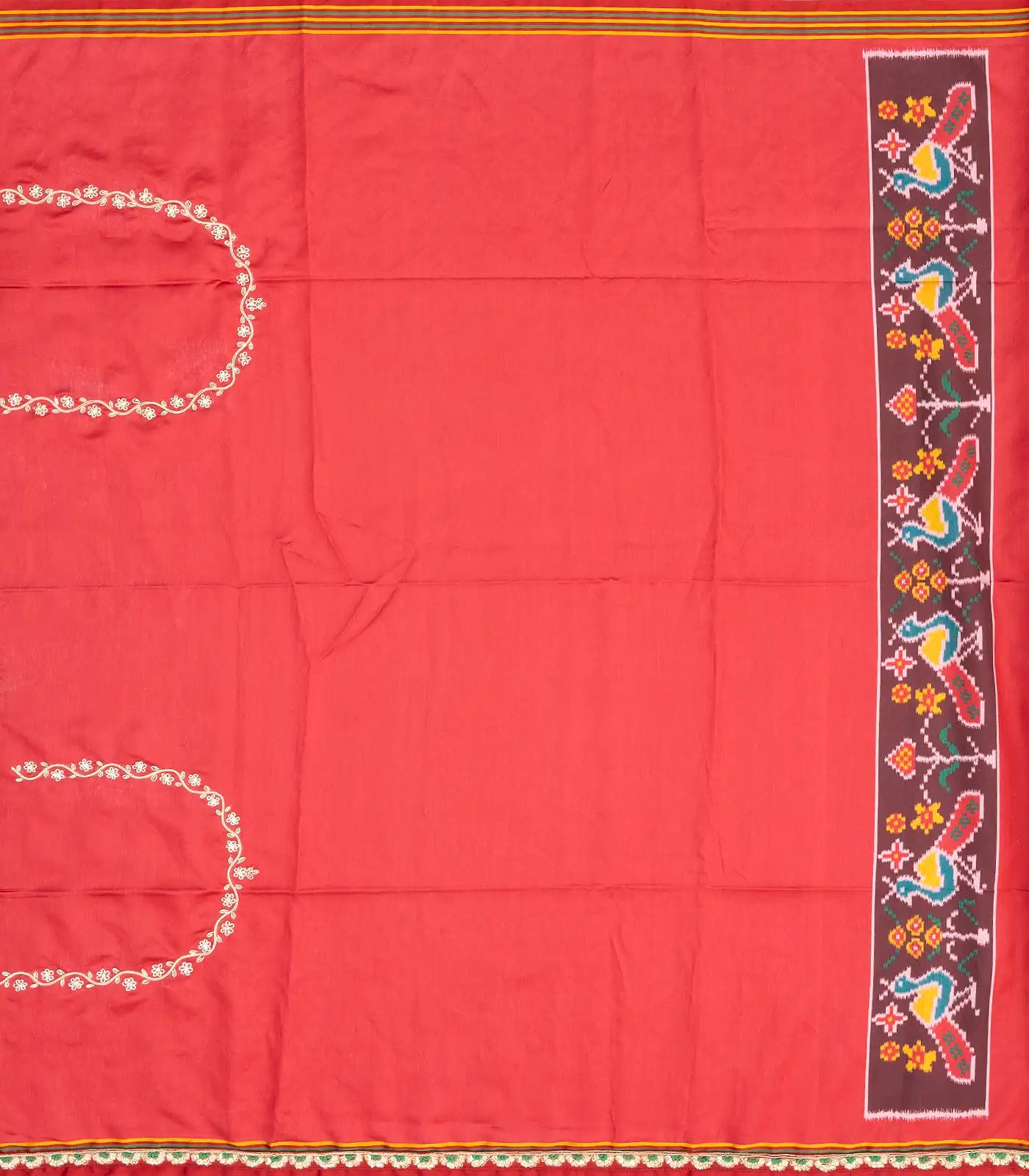Red Handloom Blended Silk Saree With Ikat Motifs & Hand Embroidered Selvage-EN1711
