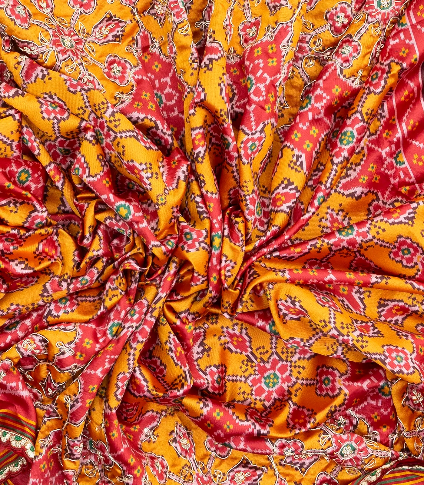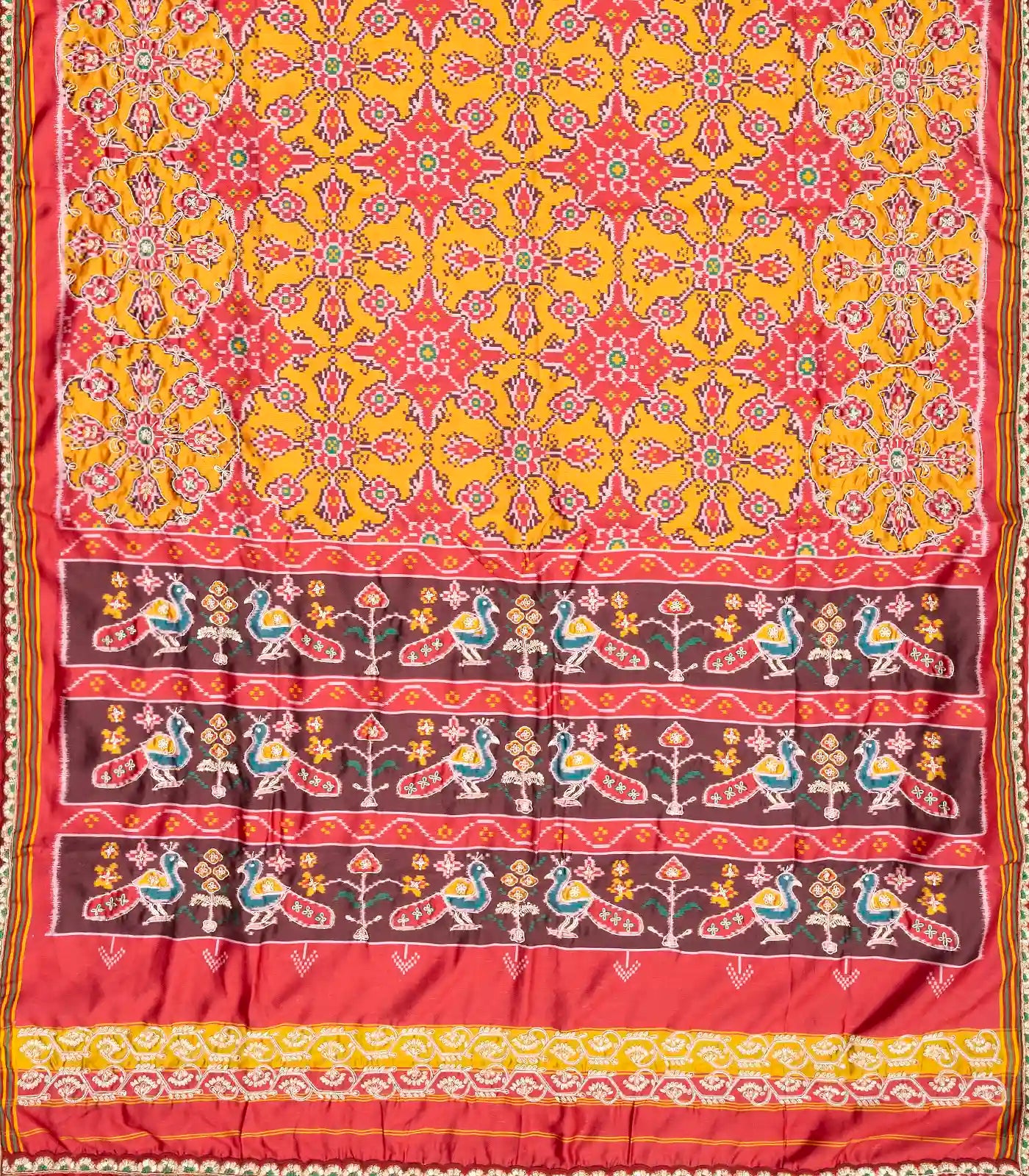 This handwoven Blended silk saree is filled with ikat motifs in yellow body along with border and pallu with hand embroidered selvage
