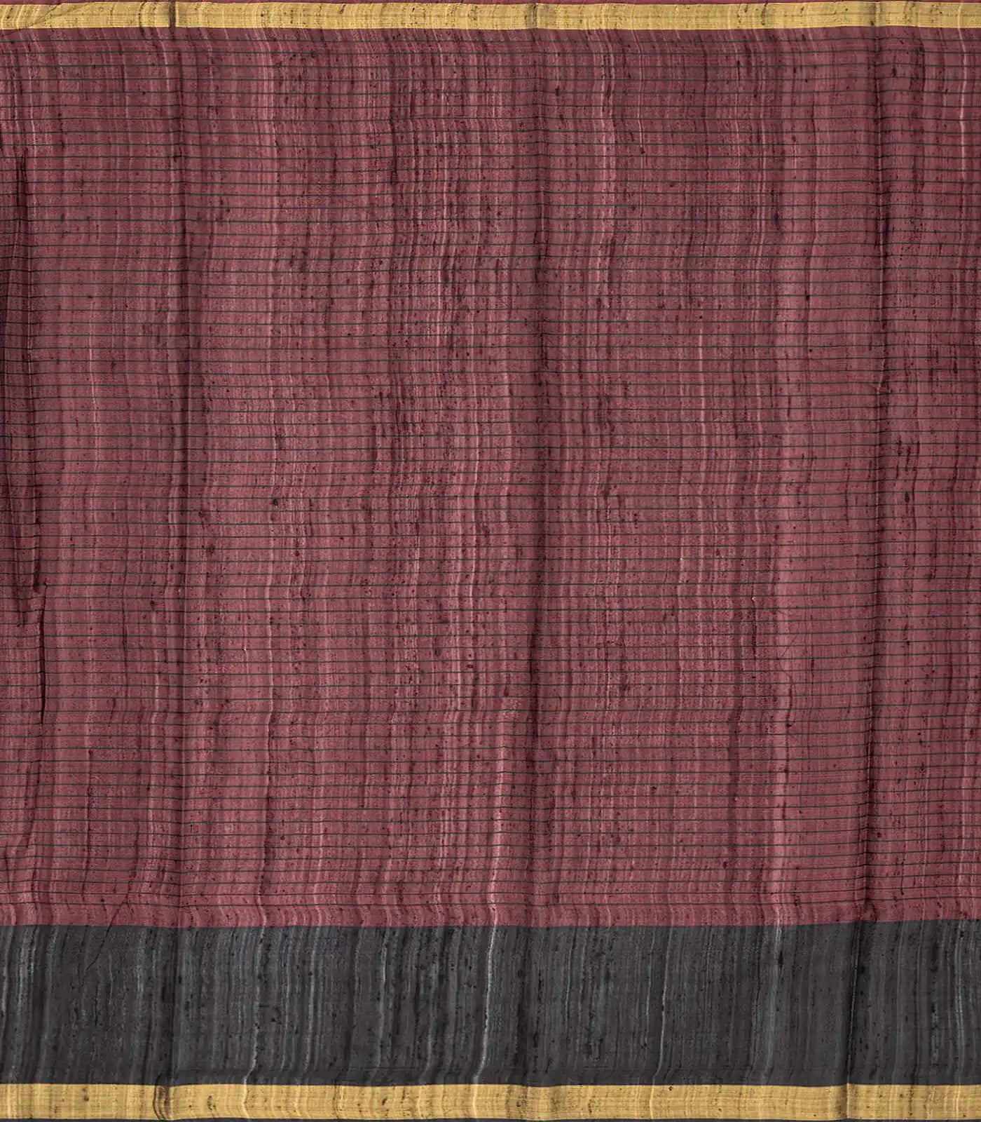 This handwoven tussar silk saree is filled with checks in red body along with contrast black border and pallu